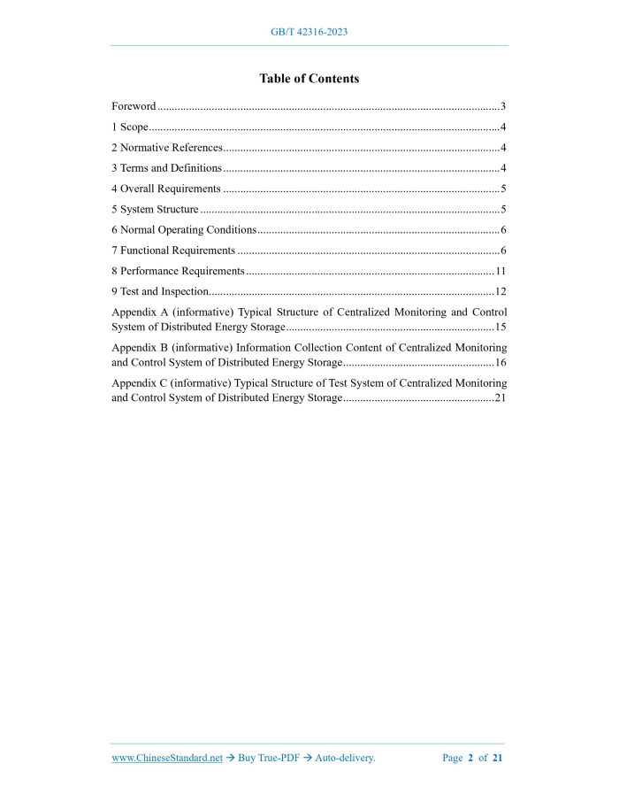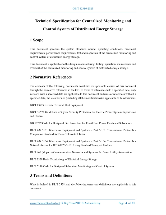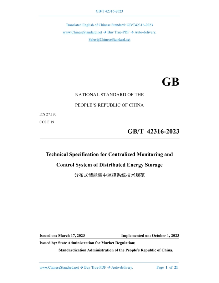 Similar standardsGB/T 42316-2023: Technical specification for centralized monitoring and control system of distributed energy storage---This is an excerpt. Full copy of true-PDF in English version (including equations, symbols, images, flow-chart, tables, and figures etc.), auto-downloaded/delivered in 9 seconds, can be purchased online: https://www.ChineseStandard.net/PDF.aspx/GBT42316-2023 GB NATIONAL STANDARD OF THE PEOPLE’S REPUBLIC OF CHINA ICS 27.180 CCS F 19 Technical Specification for Centralized Monitoring and Control System of Distributed Energy Storage ISSUED ON: MARCH 17, 2023 IMPLEMENTED ON: OCTOBER 1, 2023 Issued by: State Administration for Market Regulation; Standardization Administration of the People’s Republic of China. Table of ContentsForeword ... 3 1 Scope ... 4 2 Normative References ... 4 3 Terms and Definitions ... 4 4 Overall Requirements ... 5 5 System Structure ... 5 6 Normal Operating Conditions ... 6 7 Functional Requirements ... 6 8 Performance Requirements ... 11 9 Test and Inspection ... 12 Appendix A (informative) Typical Structure of Centralized Monitoring and Control System of Distributed Energy Storage ... 15 Appendix B (informative) Information Collection Content of Centralized Monitoring and Control System of Distributed Energy Storage ... 16 Appendix C (informative) Typical Structure of Test System of Centralized Monitoring and Control System of Distributed Energy Storage ... 21 Technical Specification for Centralized Monitoring and Control System of Distributed Energy Storage1 ScopeThis document specifies the system structure, normal operating conditions, functional requirements, performance requirements, test and inspection of the centralized monitoring and control system of distributed energy storage. This document is applicable to the design, manufacturing, testing, operation, maintenance and overhaul of the centralized monitoring and control system of distributed energy storage.2 Normative ReferencesThe contents of the following documents constitute indispensable clauses of this document through the normative references in the text. In terms of references with a specified date, only versions with a specified date are applicable to this document. In terms of references without a specified date, the latest version (including all the modifications) is applicable to this document. GB/T 13729 Remote Terminal Unit Equipment GB/T 36572 Guidelines of Cyber Security Protection for Electric Power System Supervision and Control GB 50229 Code for Design of Fire Protection for Fossil Fuel Power Plants and Substations DL/T 634.5101 Telecontrol Equipment and Systems - Part 5-101: Transmission Protocols - Companion Standard for Basic Telecontrol Tasks DL/T 634.5104 Telecontrol Equipment and Systems - Part 5-104: Transmission Protocols - Network Access for IEC 60870-5-101 Using Standard Transport Profiles DL/T 860 (all parts) Communication Networks and Systems for Power Utility Automation DL/T 2528 Basic Terminology of Electrical Energy Storage DL/T 5149 Code for Design of Substation Monitoring and Control System3 Terms and DefinitionsWhat is defined in DL/T 2528, and the following terms and definitions are applicable to this document. 3.1 centralized monitoring and control system of distributed energy storage A system that performs centralized and real-time monitoring and control of one or above distributed energy storage based on the application of computers, networks and communication technologies.4 Overall Requirements4.1 The centralized monitoring and control system of distributed energy storage shall be equipped with the application functions of data collection, real-time communication, operation monitoring and operation control, etc. 4.2 The centralized monitoring and control system of distributed energy storage shall adopt a hierarchical, classified and open system structure, and have scalability. 4.3 The centralized monitoring and control system of distributed energy storage shall have redundancy configuration in key equipment and links, such as: servers, switches and communication channels, etc. 4.4 The centralized monitoring and control system of distributed energy storage under the dispatching command management by the power grid shall have the capability of exchanging real-time information with the power grid dispatching system, and its security protection shall satisfy the requirements of GB/T 36572.5 System Structure5.1 The centralized monitoring and control system of distributed energy storage consists of the front-end convergence layer, the business processing layer and the resource storage layer. A typical structure is shown in Appendix A. The functions of each layer are as follows: a) The front-end convergence layer, which realizes the prepositive communication function, includes prepositive servers and security gateway servers; b) The business processing layer, which realizes application functions, such as: operation monitoring and operation control, includes application servers and workstations; c) The resource storage layer, which realizes data storage function, includes database servers. 5.2 The centralized monitoring and control system of distributed energy storage shall support wired and wireless access. Those under wired transmission and configured with longitudinal encryption devices shall be connected to the security zone I; those under wired public network, wireless private network or wireless public network shall be connected to the security zone IV, and a security access gateway should be set up. storage system. For the content of information collection, see Appendix B. 7.1.2 The centralized monitoring and control system of distributed energy storage shall support various types of communication protocols and the reception of multiple data types. 7.2 Alarm 7.2.1 The centralized monitoring and control system of distributed energy storage shall realize hierarchical processing of alarm information in accordance with alarm levels,