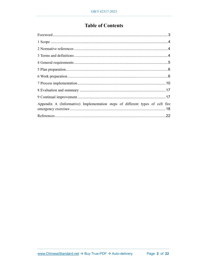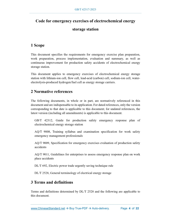 Similar standardsGB/T 42317-2023: Code for emergency exercises of electrochemical energy storage station---This is an excerpt. Full copy of true-PDF in English version (including equations, symbols, images, flow-chart, tables, and figures etc.), auto-downloaded/delivered in 9 seconds, can be purchased online: https://www.ChineseStandard.net/PDF.aspx/GBT42317-2023GB NATIONAL STANDARD OF THE PEOPLE’S REPUBLIC OF CHINA ICS 27.180 CCS F 19 Code for emergency exercises of electrochemical energy storage station ISSUED ON: MARCH 17, 2023 IMPLEMENTED ON: OCTOBER 01, 2023 Issued by: State Administration for Market Regulation; Standardization Administration of the People’s Republic of China. Table of ContentsForeword ... 3 1 Scope ... 4 2 Normative references ... 4 3 Terms and definitions ... 4 4 General requirements ... 5 5 Plan preparation ... 6 6 Work preparation ... 6 7 Process implementation ... 10 8 Evaluation and summary ... 17 9 Continual improvement ... 17 Appendix A (Informative) Implementation steps of different types of cell fire emergency exercises ... 18 References ... 22 Code for emergency exercises of electrochemical energy storage station1 ScopeThis document specifies the requirements for emergency exercise plan preparation, work preparation, process implementation, evaluation and summary, as well as continuous improvement for production safety accidents of electrochemical energy storage station. This document applies to emergency exercises of electrochemical energy storage station with lithium-ion cell, flow cell, lead-acid (carbon) cell, sodium-ion cell, water- electrolysis-produced hydrogen/fuel cell as energy storage carriers.2 Normative referencesThe following documents, in whole or in part, are normatively referenced in this document and are indispensable to its application. For dated references, only the version corresponding to that date is applicable to this document; for undated references, the latest version (including all amendments) is applicable to this document. GB/T 42312, Guide for production safety emergency response plan of electrochemical energy storage station AQ/T 9008, Training syllabus and examination specification for work safety emergency management professionals AQ/T 9009, Specification for emergency exercises evaluation of production safety accidents AQ/T 9011, Guidelines for enterprises to assess emergency response plan on work place accidents DL/T 692, Electric power trade urgently saving technique rule DL/T 2528, General terminology of electrical energy storage3 Terms and definitionsTerms and definitions determined by DL/T 2528 and the following are applicable to this document. 4.4 The emergency exercise of electrochemical energy storage station shall be reported to the superior unit of the power station and the competent department of the local government in advance. Also, the relevant surrounding units shall be notified and informed of the relevant information of the emergency exercise. 4.5 Before the emergency exercise of electrochemical energy storage station, the information such as the quantity, quality, and inspection status of the emergency supplies and equipment shall be reviewed; after the exercise, the emergency supplies shall be replenished in time, reviewed, and confirmed again.5 Plan preparation5.1 Requirement analysis The electrochemical energy storage station shall prepare a contingency plan according to the requirements of GB/T 42312 and its own actual situation, which shall clarify the emergency exercise requirements of the electrochemical energy storage station, analyze the risk factors and weak links in the operation and maintenance of the electrochemical energy storage station, and determine plans for emergency exercise, etc. 5.2 Plan preparation The electrochemical energy storage station shall prepare the emergency exercise plan for the next year at the end of the previous year, which shall determine the accident scenario type, accident area, participating units of the emergency exercise, main tasks of each stage of the emergency exercise, and the planned date for the implementation of the emergency exercise, etc. 5.3 Plan release The electrochemical energy storage station shall release the emergency exercise plan to the personnel of the unit one week in advance. For emergency exercises that require the cooperation of government departments such as traffic control and fire protection, the relevant units shall be contacted in advance and informed of the main purpose, type, form, time and content of the emergency exercise, as well as the departments and personnel that need to cooperate; the announcement of the emergency exercise plan shall be released in advance in accordance with the requirements of relevant units.6 Work preparation6.1 Organization 6.1.1 Commander-in-chief A commander-in-chief, who is responsible for organizing and leading the preparation and implementation of the exercise, shall be set for the emergency exercise. The commander-in-chief, held by the person in charge of the exercise unit, shall examine and approve the exercise work plan, exercise safety guarantee plan, exercise work funds, and other important matters that need to be decided, approve the start and end of the exercise activity, and in case of emergency during the exercise, approve the start of the exercise safety guarantee plan, and direct the emergency handling. 6.1.2 Planning and steering team The planning and steering team of the emergency exercise – composed of the equipment management and dispatching and monitoring personnel of the exercise unit – is responsible for the preparation of the exercise work plan, exercise script, and exercise safety guarantee plan, and responsible for the preparation of the exercise activity, the layout of the accident scenario, the control of the exercise process, the maintenance of the exercise order, and the scheduling of participants and materials, as well as the liaison and coordination with relevant un