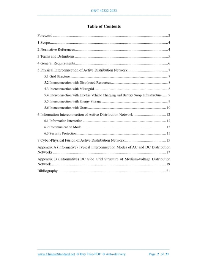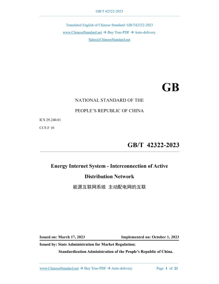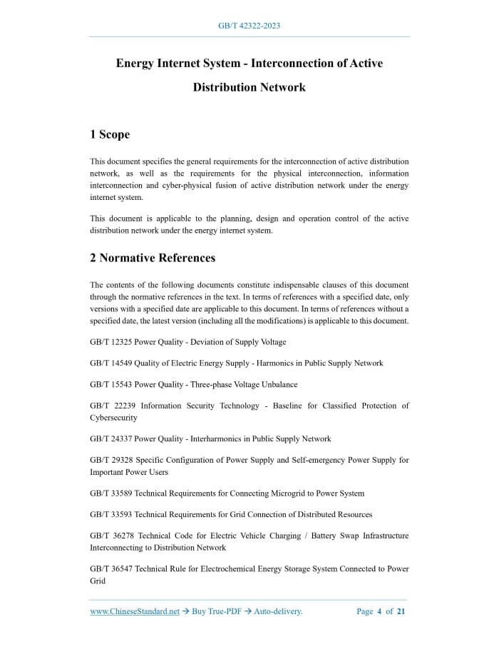 Similar standardsGB/T 42322-2023: Energy internet system - Interconnection of active distribution network---This is an excerpt. Full copy of true-PDF in English version (including equations, symbols, images, flow-chart, tables, and figures etc.), auto-downloaded/delivered in 9 seconds, can be purchased online: https://www.ChineseStandard.net/PDF.aspx/GBT42322-2023GB NATIONAL STANDARD OF THE PEOPLE’S REPUBLIC OF CHINA ICS 29.240.01 CCS F 10 Energy Internet System - Interconnection of Active Distribution Network ISSUED ON: MARCH 17, 2023 IMPLEMENTED ON: OCTOBER 1, 2023 Issued by: State Administration for Market Regulation; Standardization Administration of the People’s Republic of China. Table of ContentsForeword ... 3 1 Scope ... 4 2 Normative References ... 4 3 Terms and Definitions ... 5 4 General Requirements ... 6 5 Physical Interconnection of Active Distribution Network ... 7 5.1 Grid Structure ... 7 5.2 Interconnection with Distributed Resources ... 8 5.3 Interconnection with Microgrid ... 8 5.4 Interconnection with Electric Vehicle Charging and Battery Swap Infrastructure ... 9 5.5 Interconnection with Energy Storage ... 9 5.6 Interconnection with Users ... 10 6 Information Interconnection of Active Distribution Network ... 12 6.1 Information Interaction ... 12 6.2 Communication Mode ... 15 6.3 Security Protection ... 15 7 Cyber-Physical Fusion of Active Distribution Network ... 15 Appendix A (informative) Typical Interconnection Modes of AC and DC Distribution Networks ... 17 Appendix B (informative) DC Side Grid Structure of Medium-voltage Distribution Network ... 19 Bibliography ... 21 Energy Internet System - Interconnection of Active Distribution Network1 ScopeThis document specifies the general requirements for the interconnection of active distribution network, as well as the requirements for the physical interconnection, information interconnection and cyber-physical fusion of active distribution network under the energy internet system. This document is applicable to the planning, design and operation control of the active distribution network under the energy internet system.2 Normative ReferencesThe contents of the following documents constitute indispensable clauses of this document through the normative references in the text. In terms of references with a specified date, only versions with a specified date are applicable to this document. In terms of references without a specified date, the latest version (including all the modifications) is applicable to this document. GB/T 12325 Power Quality - Deviation of Supply Voltage GB/T 14549 Quality of Electric Energy Supply - Harmonics in Public Supply Network GB/T 15543 Power Quality - Three-phase Voltage Unbalance GB/T 22239 Information Security Technology - Baseline for Classified Protection of Cybersecurity GB/T 24337 Power Quality - Interharmonics in Public Supply Network GB/T 29328 Specific Configuration of Power Supply and Self-emergency Power Supply for Important Power Users GB/T 33589 Technical Requirements for Connecting Microgrid to Power System GB/T 33593 Technical Requirements for Grid Connection of Distributed Resources GB/T 36278 Technical Code for Electric Vehicle Charging / Battery Swap Infrastructure Interconnecting to Distribution Network GB/T 36547 Technical Rule for Electrochemical Energy Storage System Connected to Power Grid NOTE: 110 kV ~ 35 kV power grid is a high-voltage distribution network, 10 (20, 6) kV power grid is a medium-voltage distribution network, and 220 / 380 V power grid is a low-voltage distribution network. 3.3 active distribution network Active distribution network is a distribution network that internally contains distributed power, energy storage and demand response resources, and with the capabilities of flexible topology, active control and operation management. 3.4 distributed resources Distributed resources are the power supply that is connected to the power grid with a voltage level of 35 kV and below, and located near the user, and mainly consumed locally at a voltage level of 35 kV and below. NOTE 1: including synchronous generator, asynchronous generator, converter and other types of power supplies. NOTE 2: including solar energy, natural gas, biomass energy, wind energy, water energy, hydrogen energy, geothermal energy, ocean energy, comprehensive utilization of resources for power generation (including coal-mine gas for power generation) and energy storage, etc. [source: GB/T 33593-2017, 3.1, modified] 3.5 microgrid Microgrid is a small-size power supply network composed of distributed power generation, power load, monitoring, protection and automation devices (including energy storage devices when necessary) and can basically achieve internal balance of electric power and energy. NOTE: microgrid is divided into grid-connected microgrid and independent microgrid. [source: GB/T 33589-2017, 3.2, modified] 3.6 cyber-physical systems Cyber-physical systems are systems constructed by integrating advanced perception, computation, communication, control and other information technologies and automatic control technologies, so that humans, machines, objects, the environment, information and other elements are mutually mapping, timely interacting and efficiently collaborating in the physical space and cyberspace.4 General Requirements4.1 The active distribution network is an important constituent part of the energy internet system. Its planning, design, operation control and information interaction shall be coordinated with the architecture of the energy internet, so as to support the interconnection of energy and information. 4.2 The planning and design of the active distribution network shall adhere to the concept of user-oriented power supply reliability, so as to satisfy safe, efficient and flexible power transmission and distribution. 4.3 The active distribution network shall satisfy the convenient and flexible access, and consumption requirements of distributed resourc