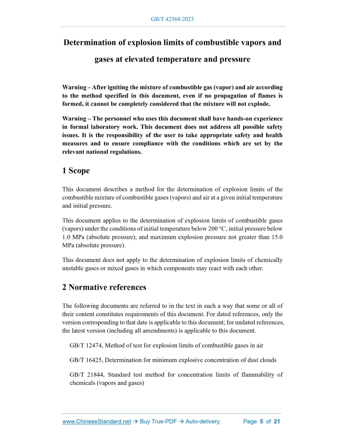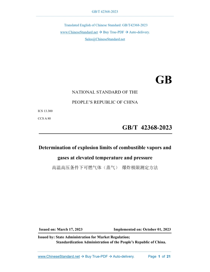 Similar standardsGB/T 42368-2023: Determination of explosion limits of combustible vapors and gases at elevated temperature and pressure---This is an excerpt. Full copy of true-PDF in English version (including equations, symbols, images, flow-chart, tables, and figures etc.), auto-downloaded/delivered in 9 seconds, can be purchased online: https://www.ChineseStandard.net/PDF.aspx/GBT42368-2023 GB NATIONAL STANDARD OF THE PEOPLE’S REPUBLIC OF CHINA ICS 13.300 CCS A 80 Determination of explosion limits of combustible vapors and gases at elevated temperature and pressure ISSUED ON: MARCH 17, 2023 IMPLEMENTED ON: OCTOBER 01, 2023 Issued by: State Administration for Market Regulation; Standardization Administration of the People’s Republic of China. Table of ContentsForeword ... 3 Introduction ... 4 1 Scope ... 5 2 Normative references ... 5 3 Terms and definitions ... 6 4 Test principle ... 7 5 Test device ... 7 6 Test steps ... 8 7 Test data processing ... 11 8 Safety measures ... 12 9 Calibration of the test device ... 13 10 Test report ... 13 Appendix A (Informative) Test device ... 15 References ... 21 Determination of explosion limits of combustible vapors and gases at elevated temperature and pressure Warning – After igniting the mixture of combustible gas (vapor) and air according to the method specified in this document, even if no propagation of flames is formed, it cannot be completely considered that the mixture will not explode. Warning – The personnel who uses this document shall have hands-on experience in formal laboratory work. This document does not address all possible safety issues. It is the responsibility of the user to take appropriate safety and health measures and to ensure compliance with the conditions which are set by the relevant national regulations.1 ScopeThis document describes a method for the determination of explosion limits of the combustible mixture of combustible gases (vapors) and air at a given initial temperature and initial pressure. This document applies to the determination of explosion limits of combustible gases (vapors) under the conditions of initial temperature below 200 °C, initial pressure below 1.0 MPa (absolute pressure), and maximum explosion pressure not greater than 15.0 MPa (absolute pressure). This document does not apply to the determination of explosion limits of chemically unstable gases or mixed gases in which components may react with each other.2 Normative referencesThe following documents are referred to in the text in such a way that some or all of their content constitutes requirements of this document. For dated references, only the version corresponding to that date is applicable to this document; for undated references, the latest version (including all amendments) is applicable to this document. GB/T 12474, Method of test for explosion limits of combustible gases in air GB/T 16425, Determination for minimum explosive concentration of dust clouds GB/T 21844, Standard test method for concentration limits of flammability of chemicals (vapors and gases)4 Test principleUnder the given initial temperature and initial pressure conditions, pre-mix a certain volume fraction of combustible gas (vapor) and air in the explosion reaction vessel; use electric spark or electric heating wire to ignite; judge whether an explosion occurs by the rising value of the explosion pressure (not less than 5% of the given initial pressure); systematically change the concentration of the combustible gas (vapor) until the minimum or maximum concentration where the explosion occurs is measured.5 Test device5.1 General The test device for explosion limits is mainly composed of an explosion reaction vessel, an ignition device, a pressure measurement unit, a gas distribution unit, a temperature control unit, etc. See Appendix A for a schematic diagram of the test device. 5.2 Explosion reaction vessel 5.2.1 The explosion reaction vessel shall be a spheroidal shape or a cylindrical test vessel with an aspect ratio of 1, which is resistant to high temperature and high pressure. The volume shall not be less than 1 L and should be 20 L, 12 L or 5 L; the shape specifications shall be in accordance with the relevant provisions for test device in GB/T 16425 and GB/T 21844 respectively. 5.2.2 The expected operating temperature of the explosion reaction vessel under initial pressure conditions shall not be less than 200 °C, and the explosion-resistant pressure shall be able to withstand a maximum explosion pressure of not less than 15.0 MPa (absolute pressure) without permanent deformation. 5.2.3 The maximum explosion pressure of combustible gases (vapors) at elevated temperature and pressure shall not be higher than the maximum working pressure of the explosion reaction vessel. 5.2.4 For the determination of explosion limits of low-flammable substances such as ammonia, halogenated substances and certain amines, a 20 L spherical stainless steel explosion tank or an explosion reaction vessel with a larger diameter should be used. 5.2.5 An oil-free stirring device shall be equipped in the explosion reaction vessel. 5.2.6 The connecting pipe fittings between the explosion reaction vessel and the high- pressure gas cylinder shall be made of 316 stainless steel pipes with a pressure not lower than 4.0 MPa (absolute pressure). All pipelines and joints connected to the explosion reaction vessel shall be able to withstand a pressure not lower than 15.0 MPa (absolute pressure). 5.3 Ignition device 5.3.1 The mixture of combustible gas (vapor) and air can be ignited by electric spark, or by electric fuse or high-temperature hot wire. 5.3.2 The ignition energy of the ignition device shall be sufficient to ignite the combustible gas mixture to be tested, and the pressure increase of the ignition source to the mixed gas shall not be greater than 0.5% of the initial pressure. 5.4 Pressure measurement unit 5.4.1 Pressure sensors with low-pressure range and high-pressure