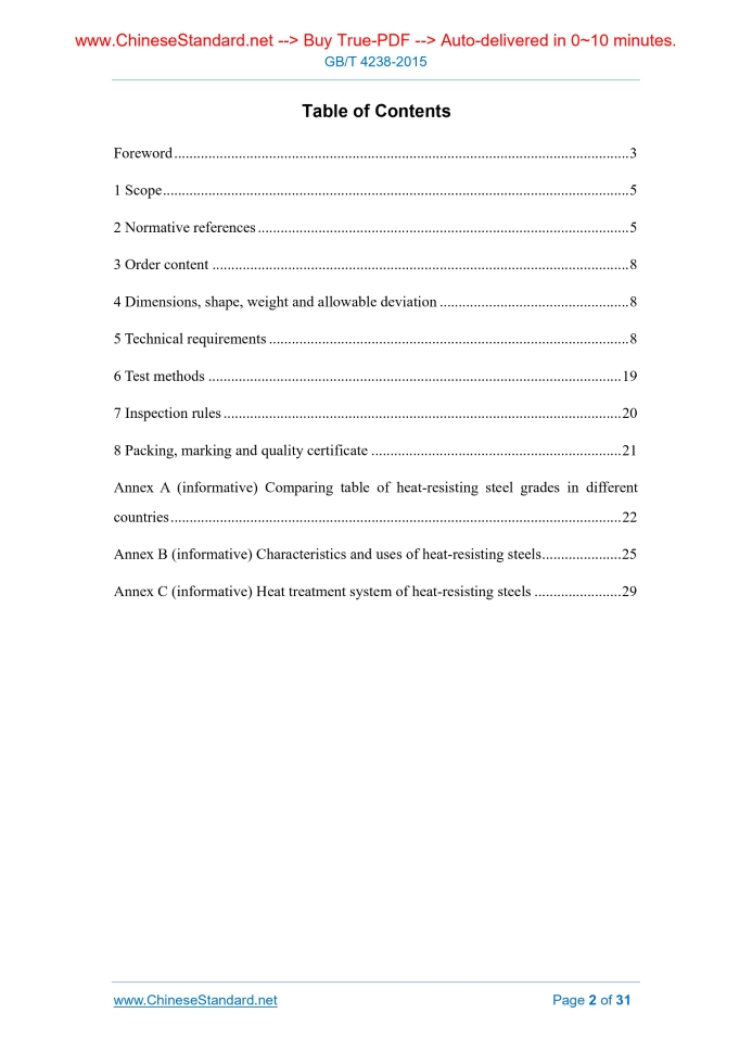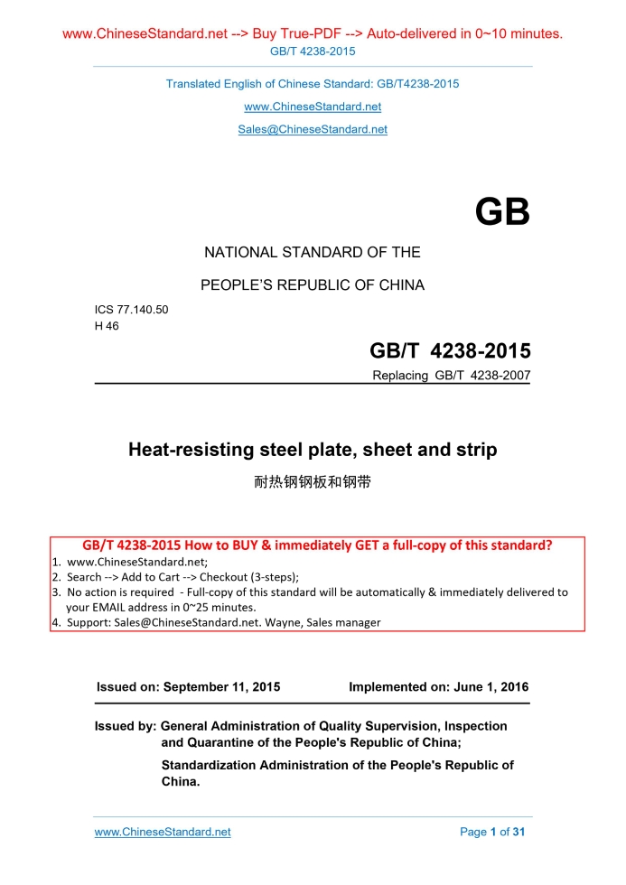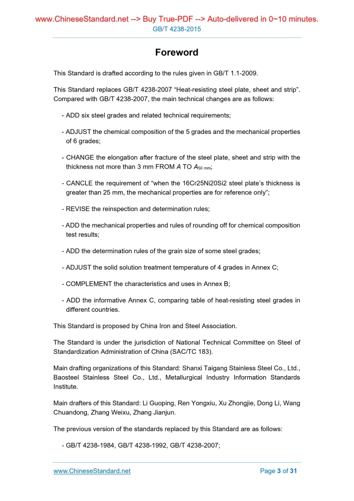 GB/T 4238-2015: Heat-resisting steel plate, sheet and strip---This is an excerpt. Full copy of true-PDF in English version (including equations, symbols, images, flow-chart, tables, and figures etc.), auto-downloaded/delivered in 9 seconds, can be purchased online: https://www.ChineseStandard.net/PDF.aspx/GBT4238-2015GB NATIONAL STANDARD OF THE PEOPLE’S REPUBLIC OF CHINA ICS 77.140.50 H 46 Replacing GB/T 4238-2007 Heat-resisting steel plate, sheet and strip Issued on. SEPTEMBER 11, 2015 Implemented on. JUNE 1, 2016 Issued by. General Administration of Quality Supervision, Inspection and Quarantine of the People's Republic of China; Standardization Administration of the People's Republic of China. Table of ContentsForeword... 3 1 Scope... 5 2 Normative references... 5 3 Order content... 8 4 Dimensions, shape, weight and allowable deviation... 8 5 Technical requirements... 8 6 Test methods... 19 7 Inspection rules... 20 8 Packing, marking and quality certificate... 21 Annex A (informative) Comparing table of heat-resisting steel grades in different countries... 22 Annex B (informative) Characteristics and uses of heat-resisting steels... 25 Annex C (informative) Heat treatment system of heat-resisting steels... 29ForewordThis Standard is drafted according to the rules given in GB/T 1.1-2009. This Standard replaces GB/T 4238-2007 “Heat-resisting steel plate, sheet and strip”. Compared with GB/T 4238-2007, the main technical changes are as follows. - ADD six steel grades and related technical requirements; - ADJUST the chemical composition of the 5 grades and the mechanical properties of 6 grades; - CHANGE the elongation after fracture of the steel plate, sheet and strip with the thickness not more than 3 mm FROM A TO A50 mm; - CANCLE the requirement of “when the 16Cr25Ni20Si2 steel plate’s thickness is greater than 25 mm, the mechanical properties are for reference only”; - REVISE the reinspection and determination rules; - ADD the mechanical properties and rules of rounding off for chemical composition test results; - ADD the determination rules of the grain size of some steel grades; - ADJUST the solid solution treatment temperature of 4 grades in Annex C; - COMPLEMENT the characteristics and uses in Annex B; - ADD the informative Annex C, comparing table of heat-resisting steel grades in different countries. This Standard is proposed by China Iron and Steel Association. The Standard is under the jurisdiction of National Technical Committee on Steel of Standardization Administration of China (SAC/TC 183). Main drafting organizations of this Standard. Shanxi Taigang Stainless Steel Co., Ltd., Baosteel Stainless Steel Co., Ltd., Metallurgical Industry Information Standards Institute. Main drafters of this Standard. Li Guoping, Ren Yongxiu, Xu Zhongjie, Dong Li, Wang Chuandong, Zhang Weixu, Zhang Jianjun. The previous version of the standards replaced by this Standard are as follows. - GB/T 4238-1984, GB/T 4238-1992, GB/T 4238-2007; - GB/T 4239-1984, GB/T 4239-1991. Heat-resisting steel plate, sheet and strip1 ScopeThis Standard specifies the order content, dimension, shape, weight and allowable deviation, technical requirements, test methods, inspection rules, packaging, marking and quality certificates of heat-resisting steel plates, sheets and strips. This Standard applies to hot-rolled and cold-rolled heat-resisting steel plates, sheets and strips.2 Normative referencesThe following documents are indispensable for the application of this document. For dated references, only the dated edition applies to this document. For undated references, the latest edition (including all amendments) applies to this document. GB/T 222 Permissible tolerances for chemical composition of steel products GB/T 223.3 Methods for chemical analysis of iron, steel and alloy - The diantipyrylmethane phosphomolybdate gravimetric method for the determination of phosphorus content GB/T 223.4 Alloyed steel - Determination of manganese content - Potentiometric or visual titration method GB/T 223.5 Steel and iron - Determination of acid-soluble silicon and total silicon content - Reduced molybdosilicate spectrophotometric method GB/T 223.8 Methods for chemical analysis of iron, steel and alloy - The sodium fluoride separation-EDTA titration method for the determination of aluminium content GB/T 223.9 Iron steel and alloy - Determination of aluminium content - Chrom azurol S photometric method GB/T 223.11 Iron steel and alloy - Determination of chromium content - Visual titration or potentiometric titration method3 Order contentThe contract or order according to this Standard shall include the following contents.4 Dimensions, shape, weight and allowable deviationThe dimension, shape, weight and allowable deviation of cold-rolled steel plate, sheet and strip shall comply with the specifications of GB/T 3280.5 Technical requirements5.1 Smelting method Steel shall adopt the primary smelting of molten steel and furnace refining process. 5.2 Chemical composition 5.2.1 The grade, classification and chemical composition (melting analysis) of steels shall comply with the specifications in Tables 1 to 4.See Annex A for heat-resisting steel grades in different countries. See Annex B for characteristics and uses of heat- resisting steels. 5.4.5 The mechanical properties of annealed martensitic heat-resisting steel plates, sheets and strips shall comply with the specifications in Table 7. 5.6 Surface processing type 5.6.1 The surface processing type of cold-rolled heat-resisting steel plates, sheets and strips shall comply with the specifications of GB/T 3280. 5.6.2 The surface processing type of hot-rolled heat-resisting steel plates, sheets and strips shall comply with the specifications of GB/T 4237. 5.7 Surface quality Stratification is not allowed on steel plates, sheets and strips; flaws such as cracks, air bubbles, inclusions, knots, etc. that may be harmful to uses are not allowed on the surface; it shall comply