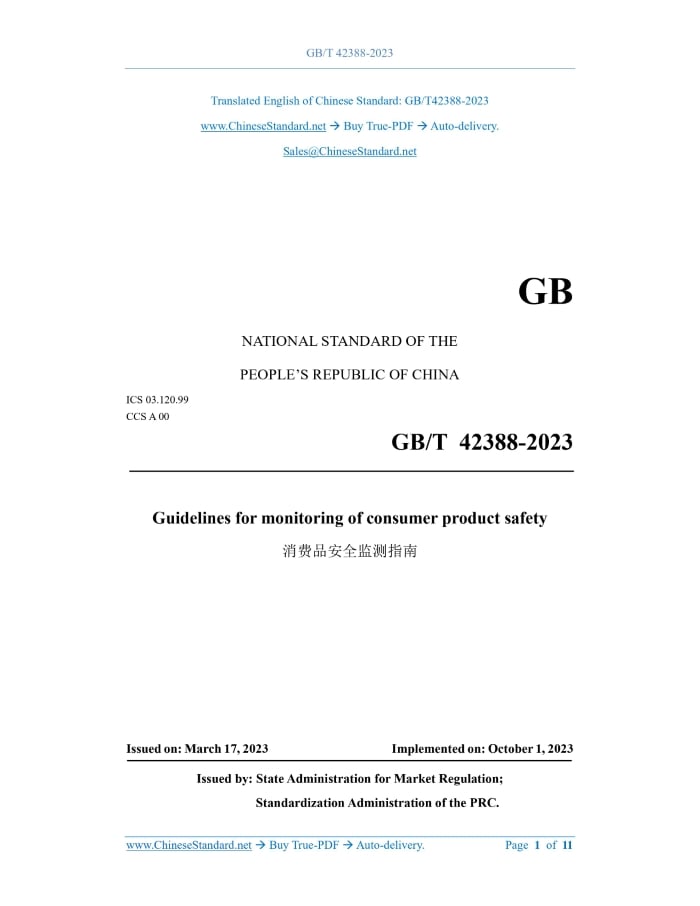 GB/T 42388-2023: Guidelines for monitoring of consumer product safety Delivery: 9 seconds. True-PDF full-copy in English & invoice will be downloaded + auto-delivered via email. See step-by-step procedure Status: Valid