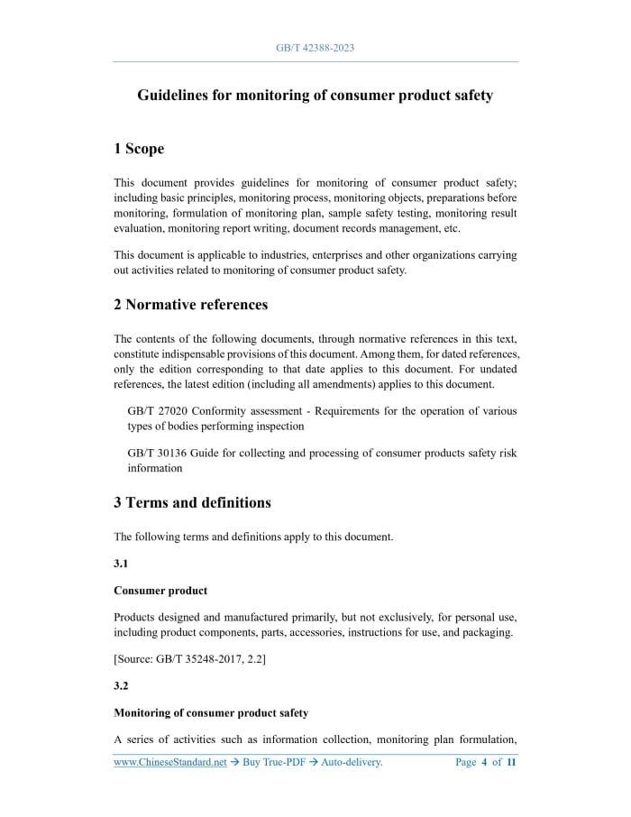 Similar standardsGB/T 42388-2023: Guidelines for monitoring of consumer product safety---This is an excerpt. Full copy of true-PDF in English version (including equations, symbols, images, flow-chart, tables, and figures etc.), auto-downloaded/delivered in 9 seconds, can be purchased online: https://www.ChineseStandard.net/PDF.aspx/GBT42388-2023GB NATIONAL STANDARD OF THE PEOPLE’S REPUBLIC OF CHINA ICS 03.120.99 CCS A 00 Guidelines for monitoring of consumer product safety ISSUED ON: MARCH 17, 2023 IMPLEMENTED ON: OCTOBER 1, 2023 Issued by: State Administration for Market Regulation; Standardization Administration of the PRC. Table of ContentsForeword ... 3 1 Scope ... 4 2 Normative references ... 4 3 Terms and definitions ... 4 4 Basic principles ... 5 5 Monitoring process ... 6 6 Monitoring objects ... 6 7 Preparations before monitoring ... 7 8 Formulation of monitoring plan ... 8 9 Sample safety testing ... 9 10 Monitoring result evaluation ... 10 11 Monitoring report writing ... 10 12 Document records management ... 10 Bibliography ... 11 Guidelines for monitoring of consumer product safety1 ScopeThis document provides guidelines for monitoring of consumer product safety; including basic principles, monitoring process, monitoring objects, preparations before monitoring, formulation of monitoring plan, sample safety testing, monitoring result evaluation, monitoring report writing, document records management, etc. This document is applicable to industries, enterprises and other organizations carrying out activities related to monitoring of consumer product safety.2 Normative referencesThe contents of the following documents, through normative references in this text, constitute indispensable provisions of this document. Among them, for dated references, only the edition corresponding to that date applies to this document. For undated references, the latest edition (including all amendments) applies to this document. GB/T 27020 Conformity assessment - Requirements for the operation of various types of bodies performing inspection GB/T 30136 Guide for collecting and processing of consumer products safety risk information3 Terms and definitionsThe following terms and definitions apply to this document. 3.1 Consumer product Products designed and manufactured primarily, but not exclusively, for personal use, including product components, parts, accessories, instructions for use, and packaging. [Source: GB/T 35248-2017, 2.2] 3.2 Monitoring of consumer product safety A series of activities such as information collection, monitoring plan formulation, monitoring plan implementation, and monitoring result evaluation to grasp the safety status of consumer products.4 Basic principles4.1 Legality The content, procedures, and methods for monitoring of consumer product safety should meet the requirements of relevant national laws and regulations. 4.2 Comprehensiveness The monitoring of consumer product safety should cover all aspects of the life cycle of consumer products. It not only monitors known safety hazards; but also pays attention to the identification, research and judgment of new safety hazards. 4.3 Scientificity The monitoring of consumer product safety should ensure that the monitoring content is reasonable and standardized; the monitoring process is complete and clear; the monitoring method is scientific and effective; the monitoring data is objective and accurate. 4.4 Timeliness The monitoring of consumer product safety should be carried out within the life cycle of consumer products; should actively adopt advanced technical means; improve the advancement of monitoring technologies and methods, the extensiveness of information collection, and the timeliness of processing feedback. 4.5 Protectiveness When the monitoring of consumer product safety involves sensitive information of individuals or organizations, it is advisable to establish a management system, to ensure that the information is circulated and used within a controllable range. 4.6 Dynamism The monitoring of consumer product safety is a process of continuous communication, feedback, and continuous improvement. It is appropriate to, according to the level of technological development, social development, and quality control, dynamically adjust the monitoring plan of consumer product safety. And according to the changes in consumer product safety hazards, timely adjust the monitoring objects, sampling areas, testing items, and monitoring frequency. - Applicable implementation standards are about to change; - Other situations where safety monitoring is necessary.7 Preparations before monitoring7.1 Safety information collection 7.1.1 Information collection channels The information collection of consumer product safety includes but is not limited to the following sources: - Information released or held by relevant departments; - Consumer feedback information; - Information held by enterprises; - Information released or held by third-party organizations; - Information released or held by other organizations; - Media network public opinion information; - Other information. 7.1.2 Information collection methods Consumer product safety information collection methods mainly include survey collection method, tool collection method, directional collection method, verification collection method, etc. The information collection of consumer product safety should be carried out in accordance with the requirements in GB/T 30136. 7.2 Safety information processing Consumer product safety information processing includes, but is not limited to: - Safety information cleaning: Process missing values and abnormal safety data; eliminate duplicate information, irrelevant information, and false information. - Element extraction: Identify, analyze and process all consumer product safety information; extract core elements. 7.3 Safety information analysis The information analysis of consumer product safety should use statistical analysis, data mining al