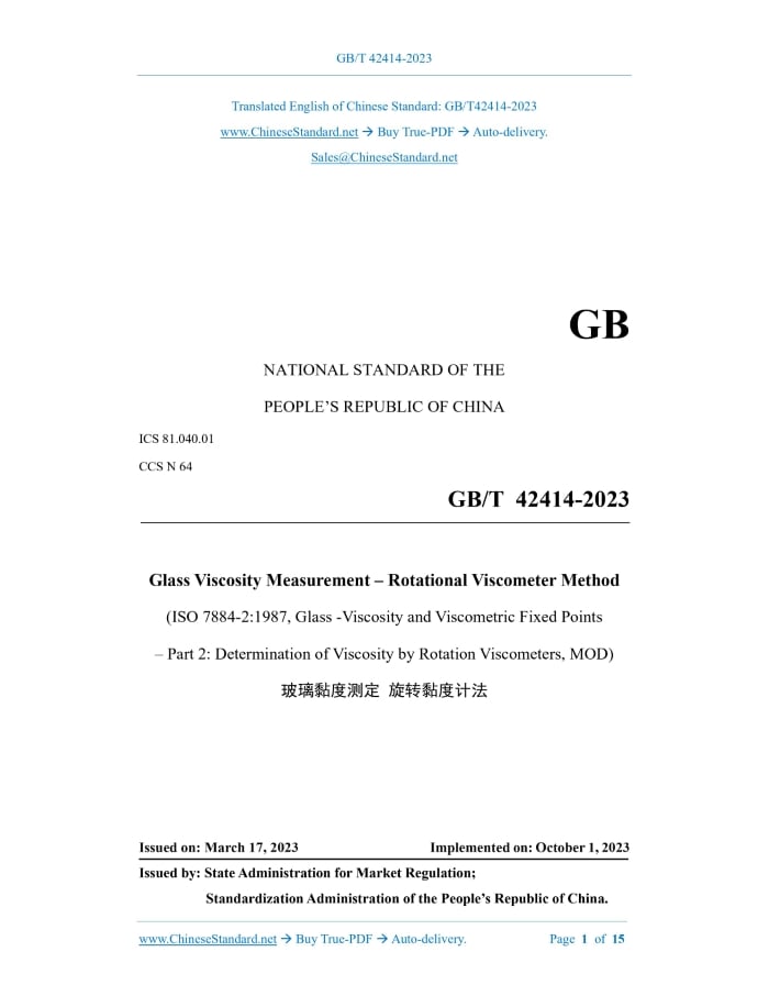 GB/T 42414-2023: Glass viscosity measurement - Rotational viscometer method Delivery: 9 seconds. True-PDF full-copy in English & invoice will be downloaded + auto-delivered via email. See step-by-step procedure Status: Valid