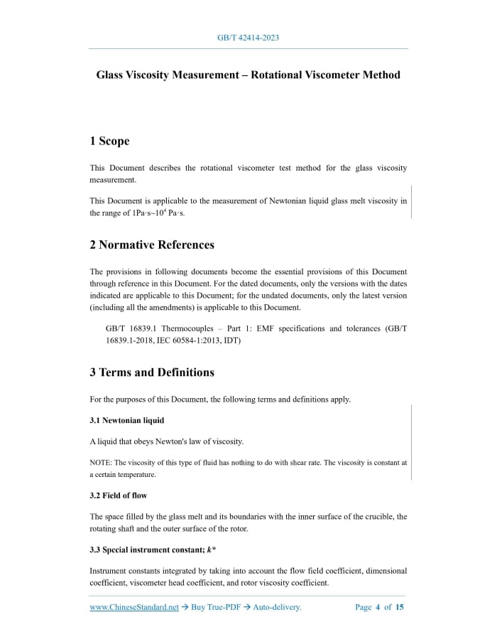 Similar standardsGB/T 42414-2023: Glass viscosity measurement - Rotational viscometer method---This is an excerpt. Full copy of true-PDF in English version (including equations, symbols, images, flow-chart, tables, and figures etc.), auto-downloaded/delivered in 9 seconds, can be purchased online: https://www.ChineseStandard.net/PDF.aspx/GBT42414-2023GB NATIONAL STANDARD OF THE PEOPLE’S REPUBLIC OF CHINA ICS 81.040.01 CCS N 64 Glass Viscosity Measurement – Rotational Viscometer Method (ISO 7884-2:1987, Glass -Viscosity and Viscometric Fixed Points – Part 2: Determination of Viscosity by Rotation Viscometers, MOD) ISSUED ON: MARCH 17, 2023 IMPLEMENTED ON: OCTOBER 1, 2023 Issued by: State Administration for Market Regulation; Standardization Administration of the People’s Republic of China. Table of ContentsForeword ... 3 1 Scope ... 4 2 Normative References ... 4 3 Terms and Definitions ... 4 4 Principles ... 5 5 Apparatuses ... 6 6 Sample ... 8 7 Test Procedures ... 8 8 Data Processing ... 10 9 Test Report ... 11 Appendix A (Informative) Comparison of Changes in Structure Numbers between this Document and ISO7884-2:1987 ... 12 Appendix B (Informative) Technical Differences and Causes between this Document and ISO 7884-2:1987 ... 13 Appendix C (Informative) Reference Glass Number, Composition Type, Viscosity and Corresponding Temperature Data ... 15 Glass Viscosity Measurement – Rotational Viscometer Method1 ScopeThis Document describes the rotational viscometer test method for the glass viscosity measurement. This Document is applicable to the measurement of Newtonian liquid glass melt viscosity in the range of 1Pa·s~104 Pa·s.2 Normative ReferencesThe provisions in following documents become the essential provisions of this Document through reference in this Document. For the dated documents, only the versions with the dates indicated are applicable to this Document; for the undated documents, only the latest version (including all the amendments) is applicable to this Document. GB/T 16839.1 Thermocouples – Part 1: EMF specifications and tolerances (GB/T 16839.1-2018, IEC 60584-1:2013, IDT)3 Terms and DefinitionsFor the purposes of this Document, the following terms and definitions apply. 3.1 Newtonian liquid A liquid that obeys Newton's law of viscosity. NOTE: The viscosity of this type of fluid has nothing to do with shear rate. The viscosity is constant at a certain temperature. 3.2 Field of flow The space filled by the glass melt and its boundaries with the inner surface of the crucible, the rotating shaft and the outer surface of the rotor. 3.3 Special instrument constant; k* Instrument constants integrated by taking into account the flow field coefficient, dimensional coefficient, viscometer head coefficient, and rotor viscosity coefficient. NOTE: k* has nothing to do with torque, speed and viscosity. 3.4 Melting temperature The temperature corresponds to the viscosity of 10Pa·s. 3.5 Working temperature The temperature corresponds to the viscosity of 103Pa·s. 3.6 VFT-equation An empirical formula that describes the relationship between the viscosity of glass and temperature. NOTE: VFT is the abbreviation of Vogel-Fulcher-Tammann.4 PrinciplesWhen a rotational viscometer is used to measure the high-temperature viscosity of glass melt, the motor drives the rotor to continuously rotate in the glass melt, and friction force is generated between the rotor surface and the contacting glass melt interface. The friction force is related to the viscosity of the glass melt. Therefore, changes in the rotation speed and torque of the rotor reflect the viscosity of the glass melt. The greater the torque is, the greater the viscosity of the glass melt is. The higher the rotation speed is, the smaller the viscosity of the glass melt is. vice versa. The torque and rotational speed of the rotor in the glass melt are measured experimentally, and the viscosity of the glass melt is calculated by using Formula (1). Where: η – viscosity, in Pa·s; k* - constant of special instrument; τ – torque applied to the rotator, in N·m; n – speed of rotator. The high-temperature viscosity of the glass melt is mainly related to the composition and temperature of the glass. The viscosity plot of the glass melt with a specific composition measured at different temperatures constitutes the viscosity-temperature curve of the glass. by the reference glass and the same viscosity value in Appendix C is greater than 10 ℃, the instrument status shall be adjusted to meet the usage requirements. 7.2 Testing 7.2.1 Place the crucible containing the glass sample to be measured into the high-temperature furnace of the viscometer. Make sure that the crucible is placed stably on the base. 7.2.2 Set the test condition parameters, including the heating rate of the high-temperature furnace (recommended 5℃/min~10℃/min), upper limit temperature, lower limit temperature, holding time, cooling rate during the test (recommended 1℃/min~3℃/min), reheating rate after testing. When setting the upper limit temperature, in addition to considering the possible chemical reactions between the glass melt and the crucible and rotor materials, it is also necessary to consider the volatilization and devitrification tendencies of the glass. For volatile glass, the upper limit temperature should not be too high, as long as the bubbles can be fully discharged (refer to the temperature corresponding to 100Pa·s of the glass melt). For easily devitrified glass, it should use a faster cooling rate during measurement. The temperature change rate should refer to the data set when calibrating the instrument using standard glass. When setting parameters, measurements should be made within a short period of time to avoid changes in the chemical or physical properties of the glass during long-term measurements. The viscosity measurement can be carried out under uniform cooling conditions; or the insulation setting can be performed 