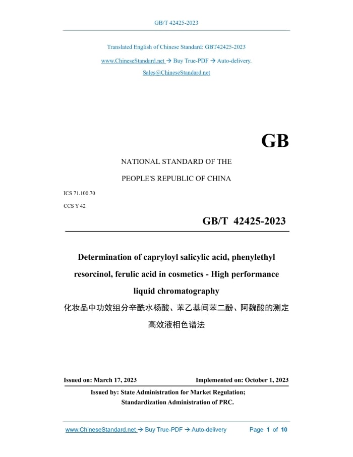 Similar standardsGB/T 42425-2023: Determination of capryloyl salicylic acid, phenylethyl resorcinol, ferulic acid in cosmetics - High performance liquid chromatography---This is an excerpt. Full copy of true-PDF in English version (including equations, symbols, images, flow-chart, tables, and figures etc.), auto-downloaded/delivered in 9 seconds, can be purchased online: https://www.ChineseStandard.net/PDF.aspx/GBT42425-2023 GB NATIONAL STANDARD OF THE PEOPLE'S REPUBLIC OF CHINA ICS 71.100.70 CCS Y 42 Determination of capryloyl salicylic acid, phenylethyl resorcinol, ferulic acid in cosmetics - High performance liquid chromatography ISSUED ON: MARCH 17, 2023 IMPLEMENTED ON: OCTOBER 1, 2023 Issued by: State Administration for Market Regulation; Standardization Administration of PRC. Table of ContentsForeword ... 3 1 Scope ... 4 2 Normative references ... 4 3 Terms and definitions ... 4 4 Principles ... 5 5 Reagents and materials ... 5 6 Instruments and equipment ... 5 7 Test steps ... 6 8 Result calculation ... 8 9 Recovery rate ... 8 10 Precision ... 8 Appendix A (Informative) Information on capryloyl salicylic acid, phenylethyl resorcinol, and ferulic acid standard substances ... 9 Appendix B (Informative) High-performance liquid chromatogram and DAD spectrogram of capryloyl salicylic acid, phenylethyl resorcinol and ferulic acid ... 10 Determination of capryloyl salicylic acid, phenylethyl resorcinol, ferulic acid in cosmetics - High performance liquid chromatography WARNING -- The personnel using this document shall have practical experience in formal laboratory work. This document does not indicate all possible safety issues. The user is responsible for taking appropriate safety and health measures and ensuring compliance with the conditions stipulated by relevant national regulations.1 ScopeThis document describes the high-performance liquid chromatography method for the determination of capryloyl salicylic acid, phenylethyl resorcinol, and ferulic acid in cosmetics, including principles, reagents and materials, instruments and equipment, test steps, test data processing, recovery rate, precision, etc. This document is applicable to the determination of capryloyl salicylic acid, phenylethyl resorcinol, and ferulic acid in water, lotion, and cream cosmetics. In this document, the method detection limit and quantification limit of capryloyl salicylic acid, phenylethyl resorcinol, and ferulic acid are 3.3 mg/kg and 10 mg/kg, respectively.2 Normative referencesThe following documents contain the provisions which, through normative reference in this document, constitute the essential provisions of this document. For the dated referenced documents, only the versions with the indicated dates are applicable to this document; for the undated referenced documents, only the latest version (including all the amendments) is applicable to this document. GB/T 6682 Water for analytical laboratory use - Specification and test methods3 Terms and definitionsThere are no terms and definitions that need to be defined in this document.4 PrinciplesThe sample is vortex-oscillated with methanol solution, treated through ultrasonic extraction, centrifugal precipitation, separation and filtration, separated by reversed- phase high-performance liquid chromatography, detected by a diode array detector, and quantified by external standard method.5 Reagents and materialsUnless otherwise specified, only analytically pure reagents are used. 5.1 Water: Grade 1 specified in GB/T 6682. 5.2 Acetonitrile (chromatographically pure). 5.3 Methanol. 5.4 Capryloyl salicylic acid, phenylethyl resorcinol, and ferulic acid: The content is not less than 95%. See Table A.1 in Appendix A for the English name, INCI name (International Name of Cosmetic Ingredients), CAS number, molecular formula, relative molecular mass, and chemical structural formula. 5.5 Sea sand, chemically pure. 5.6 Sodium decanesulfonate. 5.7 Phosphoric acid. 5.8 Standard stock solution of capryloyl salicylic acid, phenylethyl resorcinol, and ferulic acid: Accurately weigh 25.0 mg of each of capryloyl salicylic acid, phenylethyl resorcinol, and ferulic acid (5.4) in a 25 mL volumetric flask, and dilute to the mark with methanol (5.3). A standard stock solution with a mass concentration of 1000 μg/mL is obtained; it is stored in a -18 °C refrigerator, and the validity period is 6 months. 5.9 Polytetrafluoroethylene (PTFE) filter membrane: The pore size is 0.22 μm.6 Instruments and equipment6.1 High-performance liquid chromatograph (diode array detector). 6.2 Analytical balance: The sense quantity is 0.1 mg and 0.001 g. 6.3 Volumetric flask: 10 mL, 25 mL, and 100 mL. 6.4 Graduated centrifuge test tube with a stopper: 10 mL. 6.5 Ultrasonic oscillator: The power is not less than 180 W. 6.6 Centrifuge: The rotation speed is not less than 10000 r/min. 6.7 Vortex oscillator. 6.8 Pipette or pipettor: 1 mL, 5 mL, and 10 mL.7 Test steps7.1 Sample treatment For water cosmetics, take 1 g of the sample (accurate to 0.001 g) into a graduated centrifuge tube with a stopper, add 7 mL of methanol (5.3), vortex-oscillate for 1 minute, extract with ultrasonic for 20 minutes, and cool to room temperature; make up the volume to 10 mL with methanol (5.3), centrifuge at 10000 r/min for 10 min, and filter the supernatant through a 0.22 μm filter membrane (5.9) for later testing. For facial masks (the mask liquid taken from facial masks), lotions, and cream cosmetics, take 1 g of the sample (accurate to 0.001 g) into a graduated centrifuge tube with a stopper, add methanol (5.3) to make up the volume to 10 mL, vortex-oscillate for 1 minute, and conduct ultrasonic extraction for 20 min; after cooling to room temperature, add 0.5 g~1.0 g of sea sand (5.5), vortex for 1 min, centrifuge at 10000 r/min for 10 min, and filter the supernatant through a 0.22 μm filter membrane (5.9) for later testing. Do two experiments in parallel. 7.2 Determination conditions The reference conditions f