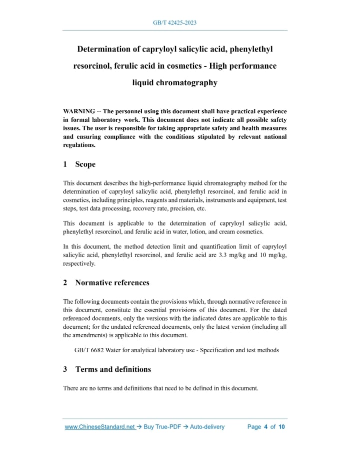 GB/T 42425-2023: Determination of capryloyl salicylic acid, phenylethyl resorcinol, ferulic acid in cosmetics - High performance liquid chromatography Delivery: 9 seconds. True-PDF full-copy in English & invoice will be downloaded + auto-delivered via email. See step-by-step procedure Status: Valid
