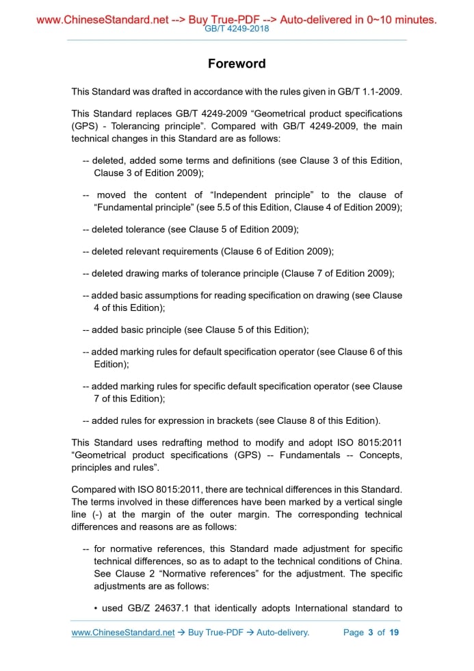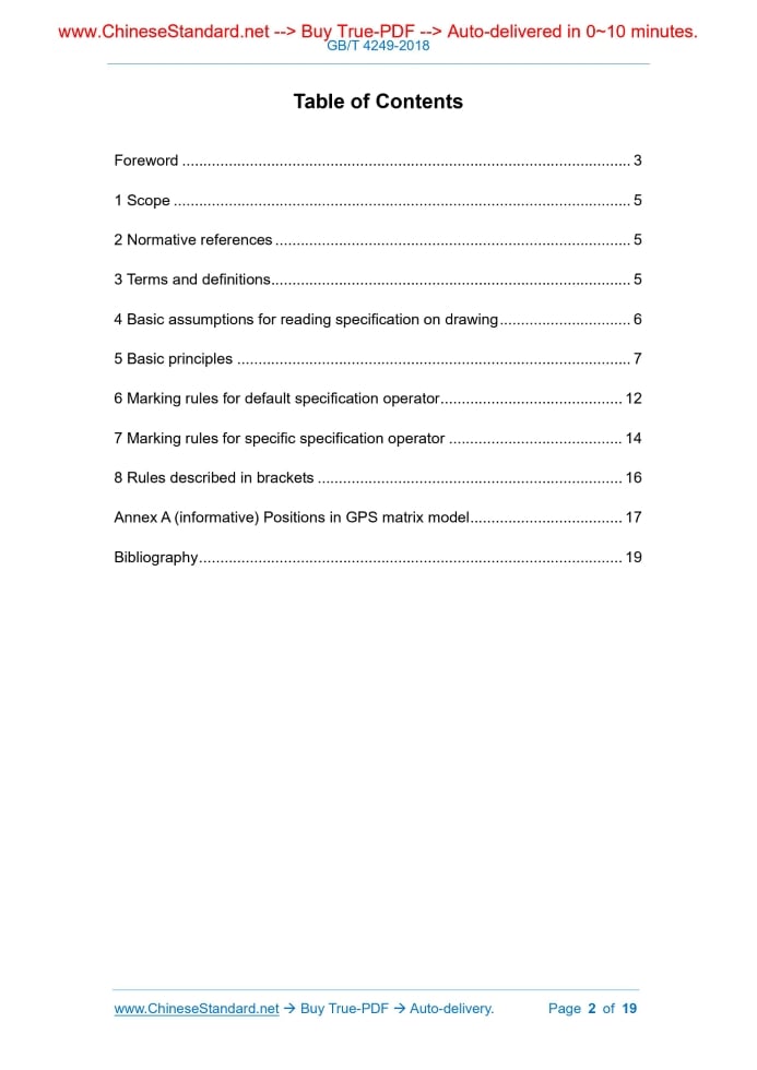 Similar standardsGB/T 4249-2018: Geometrical product specifications (GPS) -- Fundamentals -- Concepts, principles and rules---This is an excerpt. Full copy of true-PDF in English version (including equations, symbols, images, flow-chart, tables, and figures etc.), auto-downloaded/delivered in 9 seconds, can be purchased online: https://www.ChineseStandard.net/PDF.aspx/GBT4249-2018 NATIONAL STANDARD OF THE PEOPLE’S REPUBLIC OF CHINA ICS 01.100.20 J 04 Replacing GB/T 4249-2009 Geometrical product specifications (GPS) - Fundamentals - Concepts, principles and rules (ISO 8015:2011, MOD) ISSUED ON: SEPTEMBER 17, 2018 IMPLEMENTED ON: APRIL 01, 2019 Issued by: State Administration for Market Regulation; Standardization Administration of the People's Republic of China. Table of ContentsForeword ... 3 1 Scope ... 5 2 Normative references ... 5 3 Terms and definitions ... 5 4 Basic assumptions for reading specification on drawing ... 6 5 Basic principles ... 7 6 Marking rules for default specification operator ... 12 7 Marking rules for specific specification operator ... 14 8 Rules described in brackets ... 16 Annex A (informative) Positions in GPS matrix model ... 17 Bibliography ... 19ForewordThis Standard was drafted in accordance with the rules given in GB/T 1.1-2009. This Standard replaces GB/T 4249-2009 “Geometrical product specifications (GPS) - Tolerancing principle”. Compared with GB/T 4249-2009, the main technical changes in this Standard are as follows: -- deleted, added some terms and definitions (see Clause 3 of this Edition, Clause 3 of Edition 2009); -- moved the content of “Independent principle” to the clause of “Fundamental principle” (see 5.5 of this Edition, Clause 4 of Edition 2009); -- deleted tolerance (see Clause 5 of Edition 2009); -- deleted relevant requirements (Clause 6 of Edition 2009); -- deleted drawing marks of tolerance principle (Clause 7 of Edition 2009); -- added basic assumptions for reading specification on drawing (see Clause 4 of this Edition); -- added basic principle (see Clause 5 of this Edition); -- added marking rules for default specification operator (see Clause 6 of this Edition); -- added marking rules for specific default specification operator (see Clause 7 of this Edition); -- added rules for expression in brackets (see Clause 8 of this Edition). This Standard uses redrafting method to modify and adopt ISO 8015:2011 “Geometrical product specifications (GPS) -- Fundamentals -- Concepts, principles and rules”. Compared with ISO 8015:2011, there are technical differences in this Standard. The terms involved in these differences have been marked by a vertical single line (-) at the margin of the outer margin. The corresponding technical differences and reasons are as follows: -- for normative references, this Standard made adjustment for specific technical differences, so as to adapt to the technical conditions of China. See Clause 2 “Normative references” for the adjustment. The specific adjustments are as follows: • used GB/Z 24637.1 that identically adopts International standard to Geometrical product specifications (GPS) - Fundamentals - Concepts, principles and rules1 ScopeThis Standard specifies the fundamental concepts, principles and rules that are valid for the creation, interpretation and application of all relevant standards, technical specifications and technical documents to product dimensions, geometrical product specifications (GPS) and inspections. This Standard is applicable to the interpretation for GPS marks on all types of drawings. “Drawing” referred in this Standard is a broad concept. It includes all documents that express workpiece specifications.2 Normative referencesThe following referenced documents are indispensable for the application of this document. For dated references, only the edition cited applies. For undated references, the latest edition of the referenced document (including any amendments) applies. GB/Z 24637.1, Geometrical Product Specifications (GPS) - General concepts - Part 1: Model for geometrical specification and verification (GB/Z 24637.1-2009, ISO/TS 17450-1:2005, IDT) GB/Z 24637.2, Geometrical Product Specifications (GPS) - General concepts - Part 2: Basic tenets, specifications, operators and uncertainties (GB/Z 24637.2-2009, ISO/TS 17450-2:2002, IDT) ISO/IEC Guide 98-3:2008, Uncertainty of measurement - Guide to the expression of uncertainty in measurement (GUM:1995) ISO/IEC Guide 99:2007, International vocabulary of metrology - Basic and general concepts and associated terms (VIM)3 Terms and definitionsFor the purposes of this document, the terms and definitions defined in GB/Z 24637.1, GB/Z 24637.2, ISO/IEC Guide 98-3:2008, ISO/IEC Guide 99:2007 as It is assumed that the interpretation for the tolerance limit is completely same with the interpretation for the functional limit. 4.4 Functional level of workpiece It is assumed that the workpiece 100% meets the function within the tolerance limit; does not meet the function outside the tolerance limit.5 Basic principles5.1 Principle for adoption Once it adopts one part of ISO GPS system in mechanical engineering product documents, it is equivalent to adopting the entire ISO GPS system, unless otherwise stated in the document, for example, “refer to other related documents”. “Unless otherwise stated in the document” means that if the regional, national or enterprise standards referred are marked in the document, it shall use those standards. Do not adopt ISO GPS system to interpret the normative elements specified in the standard. If it is unnecessary to adopt ISO GPS system, “noting method is according to GB/T 4249” may selectively mark within the title bar or near the title bar. NOTE 1: The most common way to adopt ISO GPS system is to use one or more GPS specifications in drawing. NOTE 2: ISO GPS system is an International standard issued by ISO/TC 213, see GB/T 20308. NOTE 3: “Adopting the entire ISO GPS 