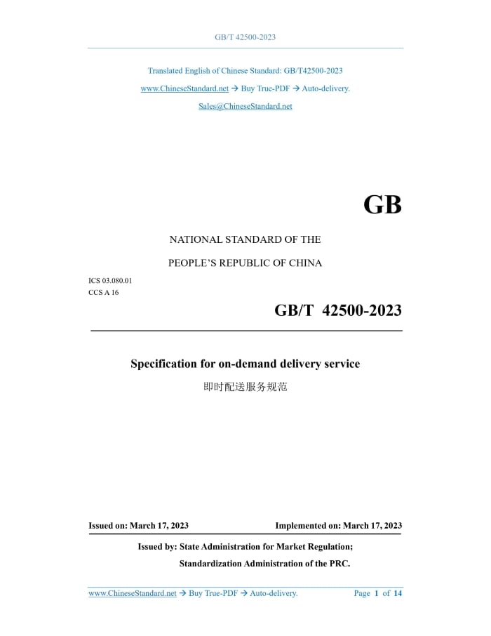 GB/T 42500-2023: Specification for on-demand delivery service Delivery: 9 seconds. True-PDF full-copy in English & invoice will be downloaded + auto-delivered via email. See step-by-step procedure Status: Valid