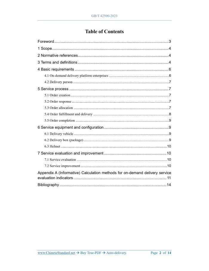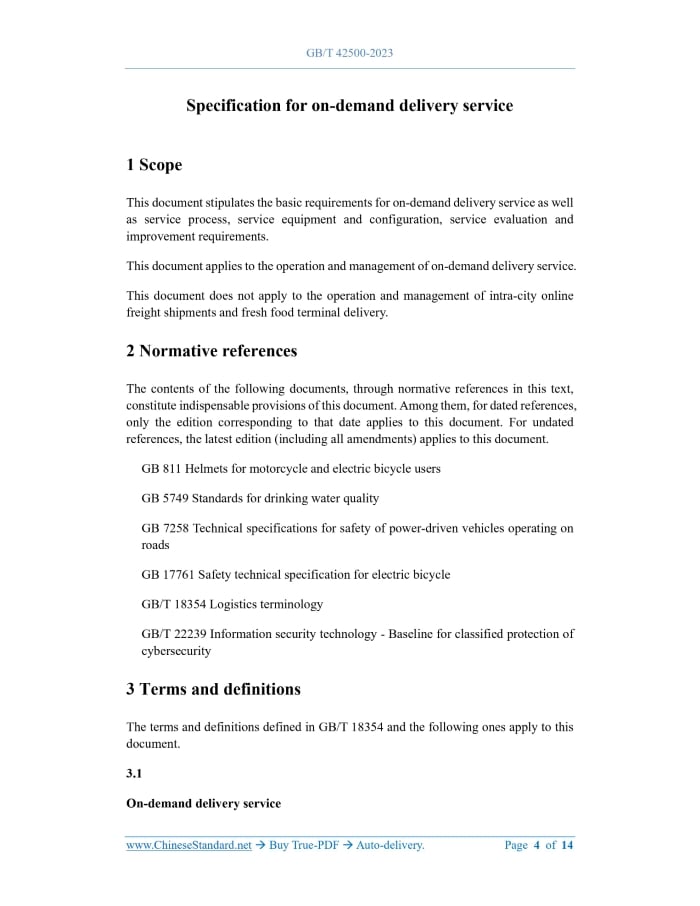 Similar standardsGB/T 42500-2023: Specification for on-demand delivery service---This is an excerpt. Full copy of true-PDF in English version (including equations, symbols, images, flow-chart, tables, and figures etc.), auto-downloaded/delivered in 9 seconds, can be purchased online: https://www.ChineseStandard.net/PDF.aspx/GBT42500-2023GB NATIONAL STANDARD OF THE PEOPLE’S REPUBLIC OF CHINA ICS 03.080.01 CCS A 16 Specification for on-demand delivery service ISSUED ON: MARCH 17, 2023 IMPLEMENTED ON: MARCH 17, 2023 Issued by: State Administration for Market Regulation; Standardization Administration of the PRC. Table of ContentsForeword ... 3 1 Scope ... 4 2 Normative references ... 4 3 Terms and definitions ... 4 4 Basic requirements ... 6 4.1 On-demand delivery platform enterprises ... 6 4.2 Delivery person ... 7 5 Service process ... 7 5.1 Order creation ... 7 5.2 Order response ... 7 5.3 Order allocation ... 7 5.4 Order fulfillment and delivery ... 8 5.5 Order completion ... 9 6 Service equipment and configuration ... 9 6.1 Delivery vehicle ... 9 6.2 Delivery box (package) ... 9 6.3 Helmet ... 10 7 Service evaluation and improvement ... 10 7.1 Service evaluation ... 10 7.2 Service improvement ... 10 Appendix A (Informative) Calculation methods for on-demand delivery service evaluation indicators ... 11 Bibliography ... 14 Specification for on-demand delivery service1 ScopeThis document stipulates the basic requirements for on-demand delivery service as well as service process, service equipment and configuration, service evaluation and improvement requirements. This document applies to the operation and management of on-demand delivery service. This document does not apply to the operation and management of intra-city online freight shipments and fresh food terminal delivery.2 Normative referencesThe contents of the following documents, through normative references in this text, constitute indispensable provisions of this document. Among them, for dated references, only the edition corresponding to that date applies to this document. For undated references, the latest edition (including all amendments) applies to this document. GB 811 Helmets for motorcycle and electric bicycle users GB 5749 Standards for drinking water quality GB 7258 Technical specifications for safety of power-driven vehicles operating on roads GB 17761 Safety technical specification for electric bicycle GB/T 18354 Logistics terminology GB/T 22239 Information security technology - Baseline for classified protection of cybersecurity3 Terms and definitionsThe terms and definitions defined in GB/T 18354 and the following ones apply to this document. 3.1 On-demand delivery service the order pushed by the platform.4 Basic requirements4.1 On-demand delivery platform enterprises 4.1.1 It shall have a fixed business location and be equipped with the equipment and personnel required for on-demand delivery service. 4.1.2 It shall establish service specifications and systems, to clearly state service requirements, service fees, etc. 4.1.3 It shall establish a sound pre-job training and continuing education system for delivery persons; organize regular education and training on laws and regulations, professional ethics, service standards, safety, etc.; establish training files. 4.1.4 It shall establish a service evaluation, complaint and improvement mechanism; publish service supervision telephone numbers and other complaint methods and handling procedures. 4.1.5 It shall design reasonable algorithms of assigning and getting orders AND order merging rules for multiple orders to be delivered together. The algorithm shall be moderately open. There shall be no discrimination based on gender, age, etc. 4.1.6 It shall have the licensing qualifications to carry out Internet information service business. The network security level shall meet the third-level security capabilities in GB/T 22239. 4.1.7 It shall build and maintain an information platform or application that meets the needs of on-demand delivery service. Its functions include but are not limited to: a) Data security protection, user privacy protection, etc.; b) Communication; c) Data analysis, order matching, etc.; d) Warnings, prompts, and feedback; e) Complaints and comments. 4.1.8 It shall establish an information security protection and user information desensitization system, to strengthen the protection of personal information and national information security. Before collecting the information on consignee and consigner and on delivery person, it shall obtain their consent. b) Geographical location information of consignee and consigner (including order initiator and recipient); c) Number of orders being delivered by the delivery person; d) On-demand delivery service time; e) Basic information such as category, weight, and quantity of delivered items; f) Delivery person’s health certificate. 5.3.2 When allocating orders, it is advisable to give priority to delivery persons with high order completion rates and good service quality. 5.3.3 After the order is released, the platform shall allow consignee and consigner to cancel or change the order within the specified time. 5.3.4 Orders, which are not accepted by anyone, should be posted in the public area of the information platform. The delivery person can choose the order himself. If there is no delivery person to accept the order within a certain period of time, the information platform background can automatically cancel it. 5.4 Order fulfillment and delivery 5.4.1 After the delivery person receives the order, the platform shall desensitize the order status, delivery person's name, contact information and other information; provide timely feedback to the consignee and consigner. 5.4.2 The platform shall recommend the location and time for picking up (delivering) delivery items to consignee and consigner and delivery person. 5.4.3 The platform shall recommend the planned delivery route to the delivery person. 5.4