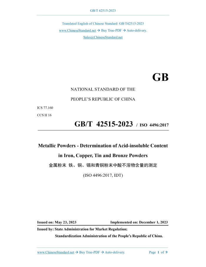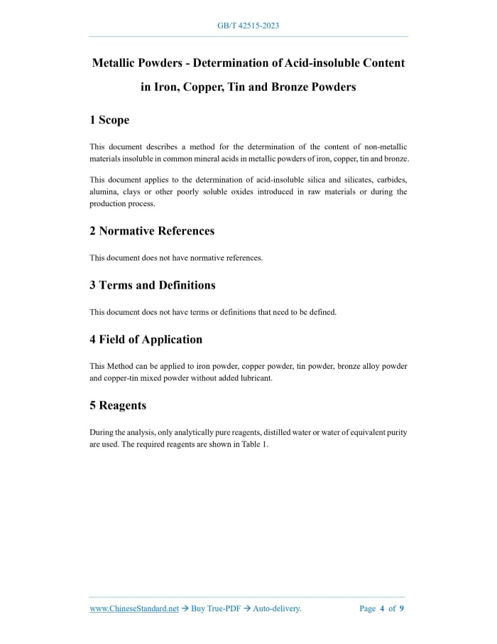 GB/T 42515-2023: Metallic powders - Determination of acid-insoluble content in iron, copper, tin and bronze powders Delivery: 9 seconds. True-PDF full-copy in English & invoice will be downloaded + auto-delivered via email. See step-by-step procedure Status: Valid