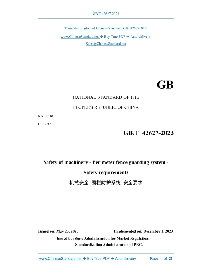 GB/T 42627-2023: Safety of machinery - Perimeter fence guarding system - Safety requirements Delivery: 9 seconds. True-PDF full-copy in English & invoice will be downloaded + auto-delivered via email. See step-by-step procedure Status: Valid