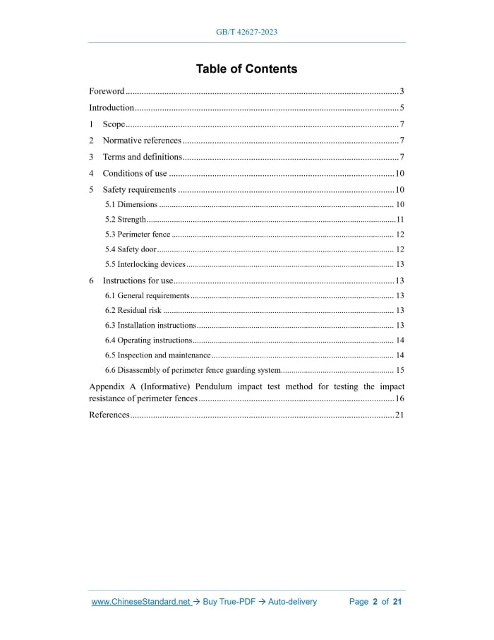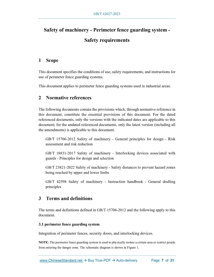 Similar standardsGB/T 42627-2023: Safety of machinery - Perimeter fence guarding system - Safety requirements---This is an excerpt. Full copy of true-PDF in English version (including equations, symbols, images, flow-chart, tables, and figures etc.), auto-downloaded/delivered in 9 seconds, can be purchased online: https://www.ChineseStandard.net/PDF.aspx/GBT42627-2023GB NATIONAL STANDARD OF THE PEOPLE'S REPUBLIC OF CHINA ICS 13.110 CCS J 09 Safety of machinery - Perimeter fence guarding system - Safety requirements ISSUED ON: MAY 23, 2023 IMPLEMENTED ON: DECEMBER 1, 2023 Issued by: State Administration for Market Regulation; Standardization Administration of PRC. Table of ContentsForeword ... 3 Introduction ... 5 1 Scope ... 7 2 Normative references ... 7 3 Terms and definitions ... 7 4 Conditions of use ... 10 5 Safety requirements ... 10 5.1 Dimensions ... 10 5.2 Strength ... 11 5.3 Perimeter fence ... 12 5.4 Safety door ... 12 5.5 Interlocking devices ... 13 6 Instructions for use ... 13 6.1 General requirements ... 13 6.2 Residual risk ... 13 6.3 Installation instructions ... 13 6.4 Operating instructions ... 14 6.5 Inspection and maintenance ... 14 6.6 Disassembly of perimeter fence guarding system ... 15 Appendix A (Informative) Pendulum impact test method for testing the impact resistance of perimeter fences ... 16 References ... 21 Safety of machinery - Perimeter fence guarding system - Safety requirements1 ScopeThis document specifies the conditions of use, safety requirements, and instructions for use of perimeter fence guarding systems. This document applies to perimeter fence guarding systems used in industrial areas.2 Normative referencesThe following documents contain the provisions which, through normative reference in this document, constitute the essential provisions of this document. For the dated referenced documents, only the versions with the indicated dates are applicable to this document; for the undated referenced documents, only the latest version (including all the amendments) is applicable to this document. GB/T 15706-2012 Safety of machinery - General principles for design - Risk assessment and risk reduction GB/T 18831-2017 Safety of machinery - Interlocking devices associated with guards - Principles for design and selection GB/T 23821-2022 Safety of machinery - Safety distances to prevent hazard zones being reached by upper and lower limbs GB/T 42598 Safety of machinery - Instruction handbook - General drafting principles3 Terms and definitionsThe terms and definitions defined in GB/T 15706-2012 and the following apply to this document. 3.1 perimeter fence guarding system Integration of perimeter fences, security doors, and interlocking devices. NOTE: The perimeter fence guarding system is used to physically isolate a certain area or restrict people from entering the danger zone. The schematic diagram is shown in Figure 1. 3.4 interlocking device interlock Mechanical, electrical, or other types of devices used to prevent hazardous machine functions from operating under specified conditions (usually as long as the guarding device is not closed). [Source: GB/T 15706-2012, 3.28.1] 3.5 safety distance safe separation distance Sr The minimum distance between the protective structure and the danger zone. [Source: GB/T 23821-2022, 3.2] 3.6 tool Implements designed for tightening operations. NOTE: Temporary implements such as special keys or wrenches, coins, or nail files cannot be considered tools. [Source: GB/T 8196-2018, 3.7, with modification]4 Conditions of useThe working environment of the perimeter fence guarding system shall not exceed the corrosive working environment requirements specified in the product manual. The ground on which the perimeter fence guarding system is fixed shall be smooth and hardened.5 Safety requirements5.1 Dimensions 5.1.1 Before the height of the perimeter fence is determined, the severity and probability of occurrence of the injury shall be determined in accordance with 5.5 of GB/T 15706- 2012, and the height of the danger zone (hh) shall be measured. If the danger protected by the perimeter fence will only cause minor injuries and the probability of occurrence is low, the height of the perimeter fence (that is, the height of the protective structure hps) shall be selected in accordance with Table 1 of GB/T 23821-2022, otherwise the height of the perimeter fence shall be selected in accordance with Table 2 of GB/T 23821-2022. Without additional protection measures, the lower the height of the perimeter fence, the greater the distance between the perimeter fence and the danger zone. Generally, the height of the perimeter fence shall be 1600 mm, 1800 mm, 2000 mm, or 2200 mm. NOTE: GB/T 16856-2015 5.4 provides guidelines for estimating the severity and probability of injury. When the height of the perimeter fence is less than 1400 mm, additional protective measures shall be taken. 5.1.2 Unless the risk assessment results show that it is feasible, the height of the lower edge of the perimeter fence from the ground shall not exceed 180 mm to prevent people from entering the danger zone through the lower edge opening. 5.1.3 The grid size of the wire mesh panel of the perimeter fence and the openings of other panels shall comply with the provisions of 4.2.4 in GB/T 23821-2022. 5.2 Strength 5.2.1 The perimeter fence guarding system shall have sufficient overall structural strength and maintain impact resistance during the foreseeable life cycle. The pendulum test method described in Appendix A can be used for testing. 5.2.2 The perimeter fence shall have enough impact resistance to withstand foreseeable impacts from outside the danger zone, and shall at least meet the function of preventing people from entering the danger zone. Its basic value shall not be less than 115 J. NOTE: 115 J is the simulation of the energy before a human body with a total mass of 90 kg hitting the perimeter fence at a speed of 1.6 m/s from outside the protective