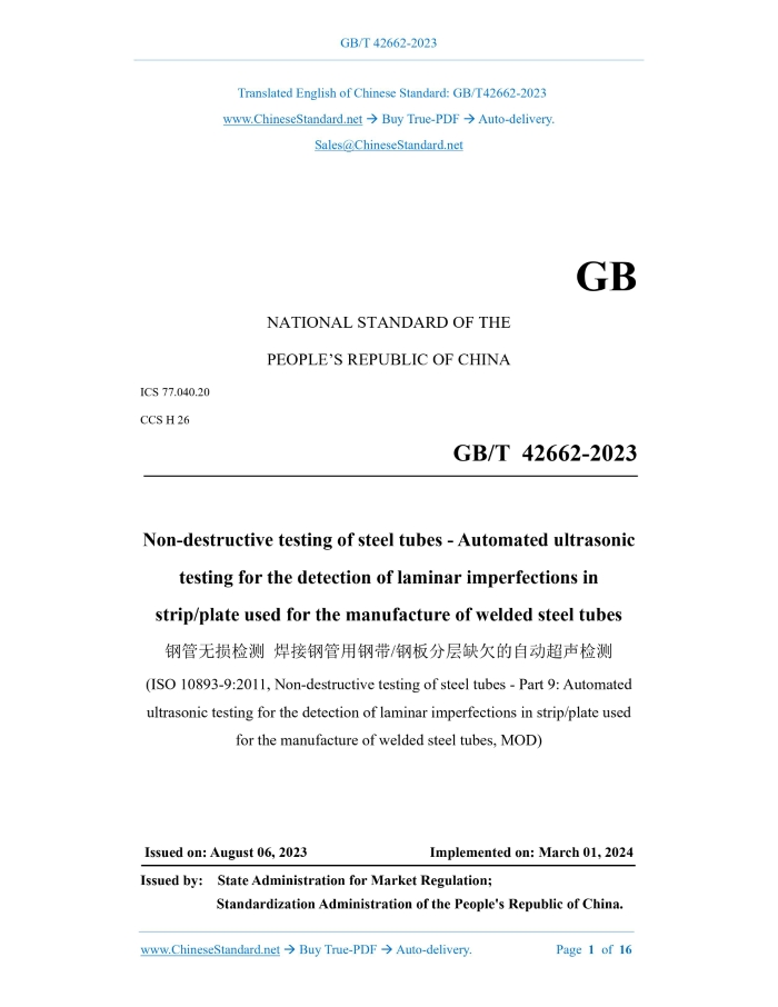 GB/T 42662-2023: Non-destructive testing of steel tubes - Automated ultrasonic testing for the detection of laminar imperfections in strip/plate used for the manufacture of welded steel tubes Delivery: 9 seconds. True-PDF full-copy in English & invoice will be downloaded + auto-delivered via email. See step-by-step procedure Status: Valid