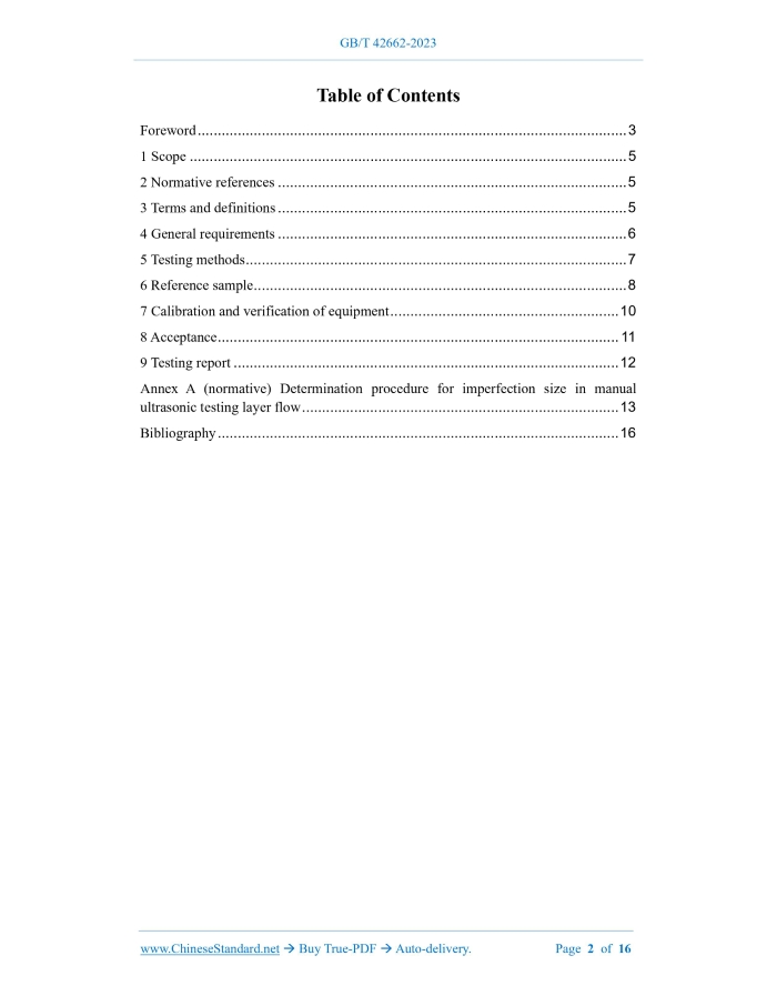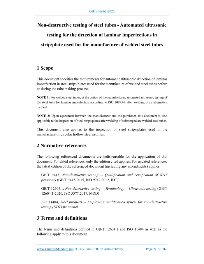 Similar standardsGB/T 42662-2023: Non-destructive testing of steel tubes - Automated ultrasonic testing for the detection of laminar imperfections in strip/plate used for the manufacture of welded steel tubes---This is an excerpt. Full copy of true-PDF in English version (including equations, symbols, images, flow-chart, tables, and figures etc.), auto-downloaded/delivered in 9 seconds, can be purchased online: https://www.ChineseStandard.net/PDF.aspx/GBT42662-2023 GB NATIONAL STANDARD OF THE PEOPLE’S REPUBLIC OF CHINA ICS 77.040.20 CCS H 26 Non-destructive testing of steel tubes - Automated ultrasonic testing for the detection of laminar imperfections in strip/plate used for the manufacture of welded steel tubes (ISO 10893-9:2011, Non-destructive testing of steel tubes - Part 9: Automated ultrasonic testing for the detection of laminar imperfections in strip/plate used for the manufacture of welded steel tubes, MOD) ISSUED ON: AUGUST 06, 2023 IMPLEMENTED ON: MARCH 01, 2024 Issued by: State Administration for Market Regulation; Standardization Administration of the People's Republic of China. Table of ContentsForeword ... 3 1 Scope ... 5 2 Normative references ... 5 3 Terms and definitions ... 5 4 General requirements ... 6 5 Testing methods ... 7 6 Reference sample ... 8 7 Calibration and verification of equipment ... 10 8 Acceptance ... 11 9 Testing report ... 12 Annex A (normative) Determination procedure for imperfection size in manual ultrasonic testing layer flow ... 13 Bibliography ... 16 Non-destructive testing of steel tubes - Automated ultrasonic testing for the detection of laminar imperfections in strip/plate used for the manufacture of welded steel tubes1 ScopeThis document specifies the requirements for automatic ultrasonic detection of laminar imperfection in steel strips/plates used for the manufacture of welded steel tubes before or during the tube making process. NOTE 1: For welded steel tubes, at the option of the manufacturer, automated ultrasonic testing of the steel tube for laminar imperfection according to ISO 10893-8 after welding is an alternative method. NOTE 2: Upon agreement between the manufacturer and the purchaser, this document is also applicable to the inspection of steel strips/plates after welding of submerged arc welded steel tubes. This document also applies to the inspection of steel strips/plates used in the manufacture of circular hollow steel profiles.2 Normative referencesThe following referenced documents are indispensable for the application of this document. For dated references, only the edition cited applies. For undated references, the latest edition of the referenced document (including any amendments) applies. GB/T 9445, Non-destructive testing -- Qualification and certification of NDT personnel (GB/T 9445-2015, ISO 9712:2012, IDT) GB/T 12604.1, Non-destructive testing -- Terminology -- Ultrasonic testing (GB/T 12604.1-2020, ISO 5577:2017, MOD) ISO 11484, Steel products -- Employer’s qualification system for non-destructive testing (NDT) personnel3 Terms and definitionsThe terms and definitions defined in GB/T 12604.1 and ISO 11484 as well as the following apply to this document. 3.1 reference standard Artificial imperfections used to calibrate non-destructive testing equipment. 3.2 reference sample Samples for calibration. 3.3 tube A long hollow product with open ends and a cross-section of any shape. 3.4 manufacturer An organization that produces products in accordance with relevant standards and declares that the delivered products comply with relevant standards. 3.5 agreement The contract entered into between the manufacturer and the purchaser at the time of inquiry and order. 3.6 laminar imperfection An imperfection in the tube wall that is usually parallel to the surface of the steel tube. NOTE: Its range can be calculated by measuring the contour area on the outer surface.4 General requirements4.1 Ultrasonic testing of straight steel strips/plates shall be carried out before or during the production of steel tubes. 4.2 The surface of the steel strip/plate to be inspected shall be smooth and free of foreign matter that would affect the validity of the test results. 4.3 Testing shall be carried out by operators trained in accordance with GB/T 9445, ISO 11484 or equivalent standards, under the supervision of qualified personnel authorized by the manufacturer. In the case of third-party testing, this shall be negotiated between the supplier and the purchaser. Employers shall issue operation authorization certificates in accordance with procedural documents. NDT operations shall be authorized by NDT Level 3 personnel approved by the employer. NOTE: The definitions of Level 1, Level 2, and Level 3 can be found in the corresponding standards, such as GB/T 9445 and ISO 11484. 6.3 Verification of reference standard Appropriate techniques shall be used to verify the size and shape of reference standard.7 Calibration and verification of equipment7.1 Before the start of each inspection cycle, the testing equipment shall be statically calibrated without comparative standard imperfections in accordance with the provisions of a) of this article or with comparative standard imperfections in accordance with the provisions of b) of this article. a) Calibration without reference standard: The probe device is positioned on the steel strip/steel plate to be inspected, and the highest echo of the first bottom surface echo minus 6 dB is used as the trigger/alarm threshold of the equipment. The detection sensitivity can also be determined by using the DAC (distance amplitude correction) curve provided by the probe manufacturer, or by using the DAC curve used by the steel tube or steel strip/steel plate manufacturer. In both cases, a 6 mm flat bottom hole curve shall be used. When setting the sensitivity, the manufacturer shall verify that the equipment is capable of detecting the grooves of the reference sample specified in 6.1.2 and Figure 1 under s