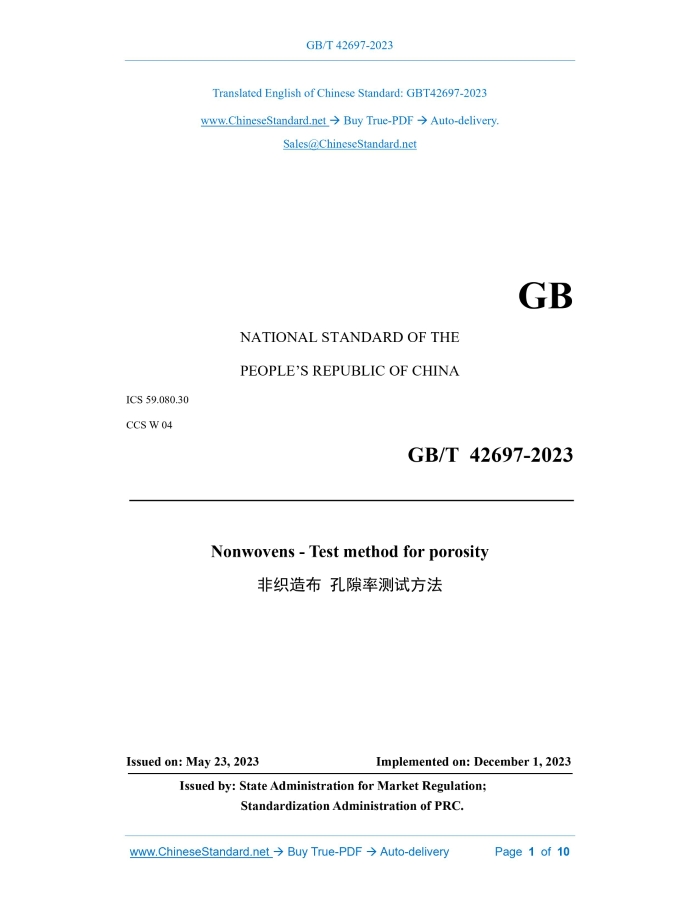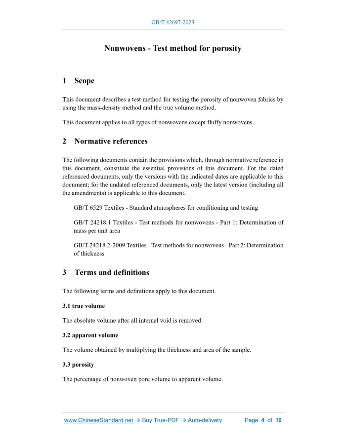 GB/T 42697-2023: Nonwovens - Test method for porosity Delivery: 9 seconds. True-PDF full-copy in English & invoice will be downloaded + auto-delivered via email. See step-by-step procedure Status: Valid