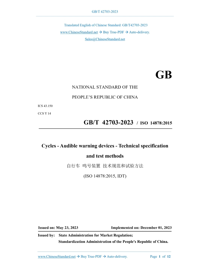GB/T 42703-2023: Cycles - Audible warning devices - Technical specification and test methods Delivery: 9 seconds. True-PDF full-copy in English & invoice will be downloaded + auto-delivered via email. See step-by-step procedure Status: Valid