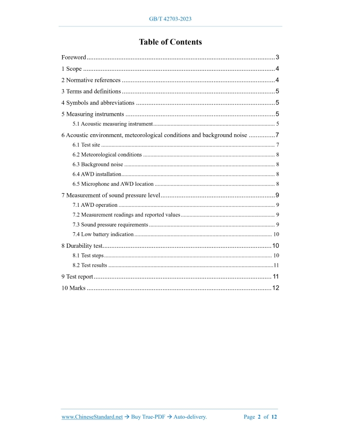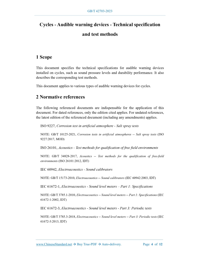 Similar standardsGB/T 42703-2023: Cycles - Audible warning devices - Technical specification and test methods---This is an excerpt. Full copy of true-PDF in English version (including equations, symbols, images, flow-chart, tables, and figures etc.), auto-downloaded/delivered in 9 seconds, can be purchased online: https://www.ChineseStandard.net/PDF.aspx/GBT42703-2023GB NATIONAL STANDARD OF THE PEOPLE’S REPUBLIC OF CHINA ICS 43.150 CCS Y 14 GB/T 42703-2023 / ISO 14878:2015 Cycles - Audible warning devices - Technical specification and test methods (ISO 14878:2015, IDT) ISSUED ON: MAY 23, 2023 IMPLEMENTED ON: DECEMBER 01, 2023 Issued by: State Administration for Market Regulation; Standardization Administration of the People's Republic of China. Table of ContentsForeword ... 3 1 Scope ... 4 2 Normative references ... 4 3 Terms and definitions ... 5 4 Symbols and abbreviations ... 5 5 Measuring instruments ... 5 5.1 Acoustic measuring instrument ... 5 6 Acoustic environment, meteorological conditions and background noise ... 7 6.1 Test site ... 7 6.2 Meteorological conditions ... 8 6.3 Background noise ... 8 6.4 AWD installation ... 8 6.5 Microphone and AWD location ... 8 7 Measurement of sound pressure level ... 9 7.1 AWD operation ... 9 7.2 Measurement readings and reported values ... 9 7.3 Sound pressure requirements ... 9 7.4 Low battery indication ... 10 8 Durability test ... 10 8.1 Test steps ... 10 8.2 Test results ... 11 9 Test report ... 11 10 Marks ... 12 Cycles - Audible warning devices - Technical specification and test methods1 ScopeThis document specifies the technical specifications for audible warning devices installed on cycles, such as sound pressure levels and durability performance. It also describes the corresponding test methods. This document applies to various types of audible warning devices for cycles.2 Normative referencesThe following referenced documents are indispensable for the application of this document. For dated references, only the edition cited applies. For undated references, the latest edition of the referenced document (including any amendments) applies. ISO 9227, Corrosion test in artificial atmosphere - Salt spray tests NOTE: GB/T 10125-2021, Corrosion tests in artificial atmospheres -- Salt spray tests (ISO 9227:2017, MOD) ISO 26101, Acoustics - Test methods for qualification of free field environments NOTE: GB/T 34828-2017, Acoustics -- Test methods for the qualification of free-field environments (ISO 26101:2012, IDT) IEC 60942, Electroacoustics - Sound calibrators NOTE: GB/T 15173-2010, Electroacoustics -- Sound calibrators (IEC 60942:2003, IDT) IEC 61672-1, Electroacoustics - Sound level meters – Part 1: Specifications NOTE: GB/T 3785.1-2010, Electroacoustics -- Sound level meters -- Part 1: Specifications (IEC 61672-1:2002, IDT) IEC 61672-3, Electroacoustics - Sound level meters - Part 3: Periodic tests NOTE: GB/T 3785.3-2018, Electroacoustics -- Sound level meters -- Part 3: Periodic tests (IEC 61672-3:2013, IDT) The entire measurement system shall be checked using a Class 1 acoustic calibrator complying with the requirements of IEC 60942. When measuring, acoustic measuring instruments with "F" time weighting and "A" frequency weighting described in IEC 61672-1 shall be used. When using a system that monitors A-weighted sound pressure levels at periodic intervals, the interval between readings shall not be greater than 30 ms. Instruments shall be maintained and calibrated in accordance with the instrument manufacturer's instructions. When it is impossible to make an overall judgment or conclusion on whether the sound level meter complies with all the specifications of IEC 61672-1, the sound level meter or equivalent measurement system shall at least meet the requirements of Class 1 sound level meter in IEC 61672-3. NOTE: The tests in IEC 61672-3 only cover part of the provisions of IEC 61672-1. IEC 61672-1 covers a large range (temperature range, frequency requirements up to 20 kHz, electromagnetic compatibility test), so from an economic perspective, it is impossible to verify each parameter of the computer data acquisition system one by one according to the requirements of IEC 61672-1. 5.1.2 Calibration At the beginning and end of each measurement, the entire acoustic measurement system shall be checked with the acoustic calibrator described in 5.1.1. Without additional adjustments, the difference between readings shall not be greater than 0.5 dB. If this value is exceeded, measurements taken after the last satisfactory inspection shall be discarded. 5.1.3 Compliance requirements The acoustic calibrator shall be calibrated once a year in accordance with the requirements of IEC 60942. The instrument system shall be calibrated at least once every 2 years in accordance with the requirements of IEC 61672-3. All compliance testing shall be performed by an authorized laboratory traceable to an appropriate reference. 5.1.4 Meteorological instrument Meteorological instruments used to monitor environmental conditions during the test shall meet the following technical specifications: a) Temperature measuring device ±1°C or less; b) Wind speed measuring device ±1.0 m/s; c) Air pressure measuring device ±5 hPa; d) Relative humidity measuring device ±5%.6 Acoustic environment, meteorological conditions andbackground noise 6.1 Test site AWD shall be tested in an anechoic environment. It can also be conducted in a semi- anechoic room or an open field. When testing in an open field, precautions shall be taken (for example, erecting a set of sound-absorbing panels) to block the echo from the ground in the measurement area. Using the following evaluation criteria and measurement requirements that are close to those recommended by ISO 26101, the test facilities shall be able to meet the requirements of ISO 26101. a) The site considered as anechoic shall be at least a hemispheric space with a radius of 5 m. b) The test sound source shall be placed i