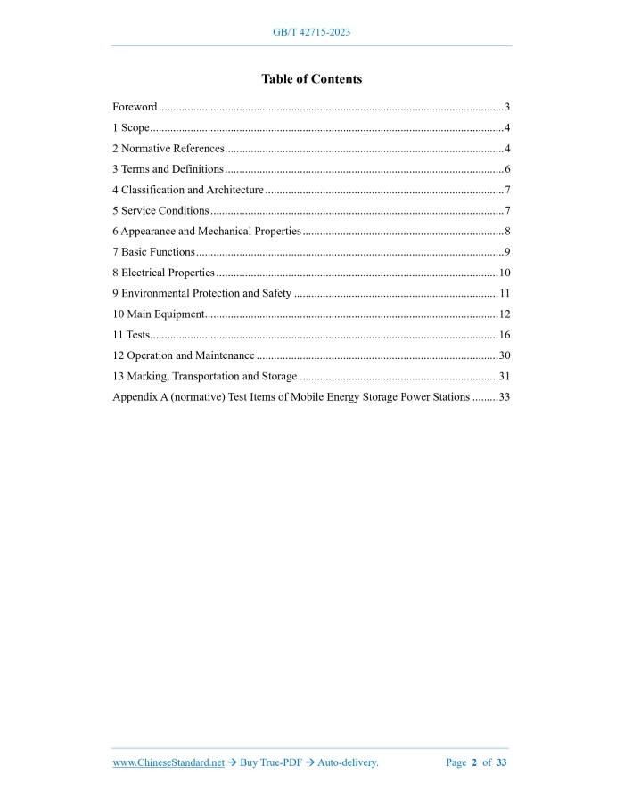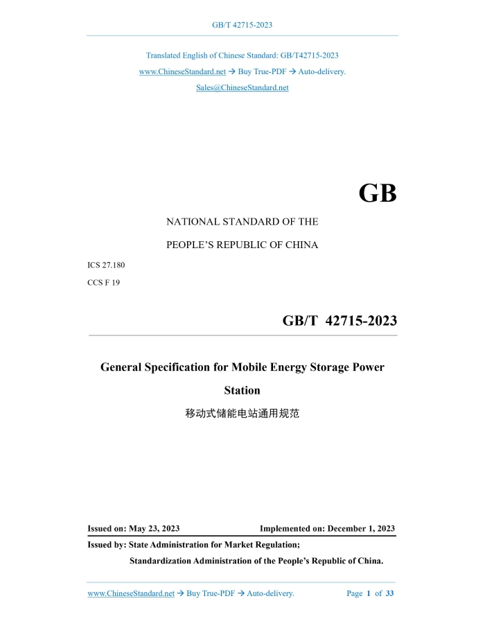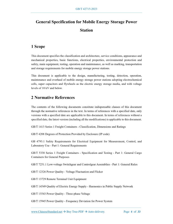 Similar standardsGB/T 42715-2023: General specification for mobile energy storage power station---This is an excerpt. Full copy of true-PDF in English version (including equations, symbols, images, flow-chart, tables, and figures etc.), auto-downloaded/delivered in 9 seconds, can be purchased online: https://www.ChineseStandard.net/PDF.aspx/GBT42715-2023GB NATIONAL STANDARD OF THE PEOPLE’S REPUBLIC OF CHINA ICS 27.180 CCS F 19 General Specification for Mobile Energy Storage Power Station ISSUED ON: MAY 23, 2023 IMPLEMENTED ON: DECEMBER 1, 2023 Issued by: State Administration for Market Regulation; Standardization Administration of the People’s Republic of China. Table of ContentsForeword ... 3 1 Scope ... 4 2 Normative References ... 4 3 Terms and Definitions ... 6 4 Classification and Architecture ... 7 5 Service Conditions ... 7 6 Appearance and Mechanical Properties ... 8 7 Basic Functions ... 9 8 Electrical Properties ... 10 9 Environmental Protection and Safety ... 11 10 Main Equipment ... 12 11 Tests ... 16 12 Operation and Maintenance ... 30 13 Marking, Transportation and Storage ... 31 Appendix A (normative) Test Items of Mobile Energy Storage Power Stations ... 33 General Specification for Mobile Energy Storage Power Station1 ScopeThis document specifies the classification and architecture, service conditions, appearance and mechanical properties, basic functions, electrical properties, environmental protection and safety, main equipment, testing, operation and maintenance, as well as marking, transportation and storage requirements for mobile energy storage power stations. This document is applicable to the design, manufacturing, testing, detection, operation, maintenance and overhaul of mobile energy storage power stations adopting electrochemical cells, super capacitors and flywheels as the electric energy storage media, and with voltage levels of 10 kV and below.2 Normative ReferencesThe contents of the following documents constitute indispensable clauses of this document through the normative references in the text. In terms of references with a specified date, only versions with a specified date are applicable to this document. In terms of references without a specified date, the latest version (including all the modifications) is applicable to this document. GB/T 1413 Series 1 Freight Containers - Classification, Dimensions and Ratings GB/T 4208 Degrees of Protection Provided by Enclosure (IP code) GB 4793.1 Safety Requirements for Electrical Equipment for Measurement, Control, and Laboratory Use - Part 1: General Requirements GB/T 5338 Series 1 Freight Containers - Specification and Testing - Part 1: General Cargo Containers for General Purposes GB/T 7251.1 Low-voltage Switchgear and Controlgear Assemblies - Part 1: General Rules GB/T 12326 Power Quality - Voltage Fluctuation and Flicker GB/T 13729 Remote Terminal Unit Equipment GB/T 14549 Quality of Electric Energy Supply - Harmonics in Public Supply Network GB/T 15543 Power Quality - Three-phase Voltage GB/T 15945 Power Quality - Frequency Deviation for Power System harmonic distortion rate of the AC side output voltage of the mobile energy storage power stations shall not exceed 3%. 8.8 Voltage Unbalance Degree Under the conditions of three-phase unbalanced rated resistive load of the mobile energy storage power stations, the output voltage unbalance degree shall be less than 2% and shall not exceed 4% in the short term. 8.9 Dynamic Voltage Transient Range Under the conditions of three-phase balanced resistive load, when the load suddenly rises from 20% to 100% or drops from 100% to 20%, the output voltage transient value of the mobile energy storage power stations shall be less than 10%.9 Environmental Protection and Safety9.1 Requirements for Environmental Protection 9.1.1 When the battery electrolyte in the mobile electrochemical energy storage power stations accidentally leaks, the leaked electrolyte shall be disposed of in time, and shall not be directly discharged; the leaked battery shall be recycled. 9.1.2 When the mobile energy storage power stations are operating at rated charging power or rated discharging power, the noise on both sides along the radial direction of the compartment and 1 m behind the compartment, and 1.6 m away from the ground shall not be greater than 70 dB; the noise on both sides along the radial direction of the compartment and 7 m behind the compartment, and 1.6 m away from the ground shall not be greater than 65 dB. 9.2 Safety Requirements 9.2.1 Fire extinguishing system The fire extinguishing system shall satisfy the following requirements: a) The mobile energy storage unit shall be equipped with at least one Class E fire extinguisher, and the extinguishing medium filling quantity of each Class E fire extinguisher shall comply with the stipulations of GB 50370; b) The requirements for the automatic fire alarm system shall comply with the stipulations of GB 51048; c) The mobile energy storage unit should be equipped with an automatic fire extinguishing device. 9.2.2 Temperature rise The temperature rise of the equipment in the mobile energy storage unit shall comply with the stipulations of GB/T 36545. 9.2.3 Grounding for lightning protection The grounding design for lightning protection of the AC electrical equipment in the mobile energy storage power stations shall comply with the stipulations of GB/T 50065. 9.2.4 Insulation The insulation design of the mobile energy storage power stations shall comply with the relevant stipulations of GB/T 50064.10 Main Equipment10.1 Mobile Platform The mobile platform shall satisfy the following requirements: a) The dimension and rated mass of the compartment adopt the dimension and rated mass specified in GB/T 1413; b) The mass of the mobile energy storage power station does not exceed the load limit of the mobile platform; c) The structural strength of the compartment complies with the relevant stipulations of the design requirements in GB/T