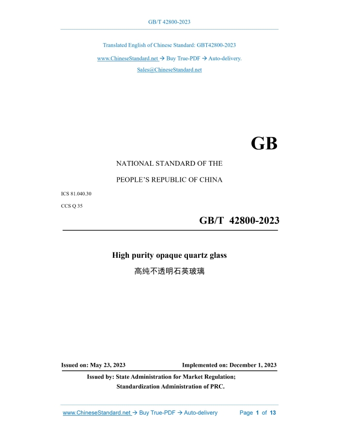 GB/T 42800-2023: High purity opaque quartz glass Delivery: 9 seconds. True-PDF full-copy in English & invoice will be downloaded + auto-delivered via email. See step-by-step procedure Status: Valid