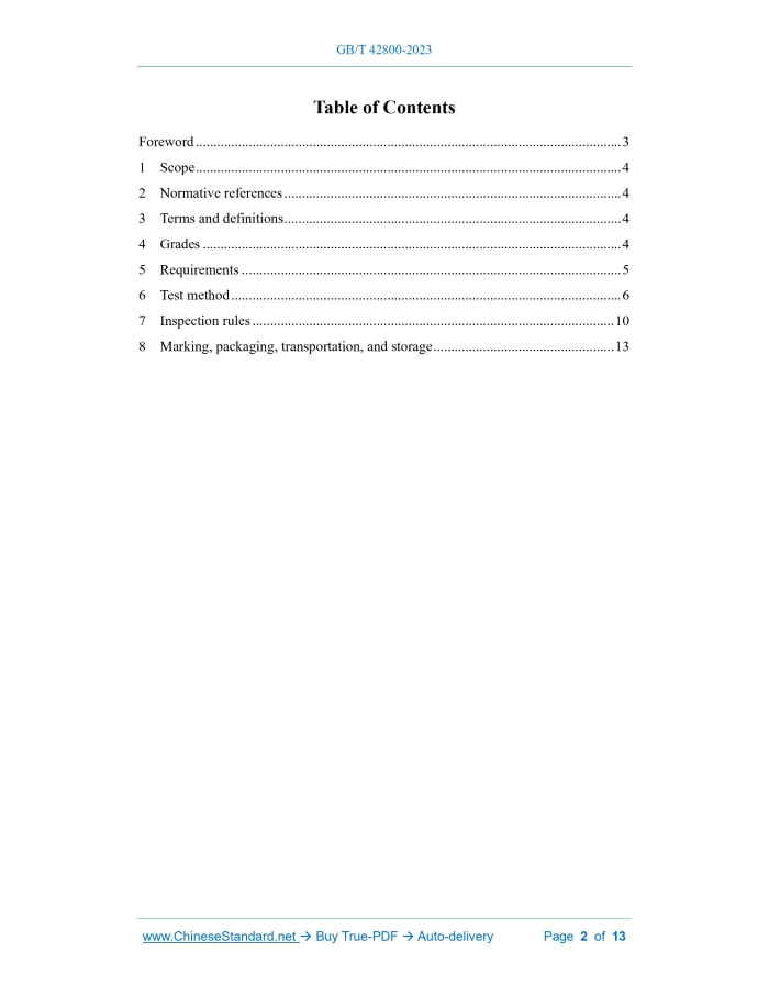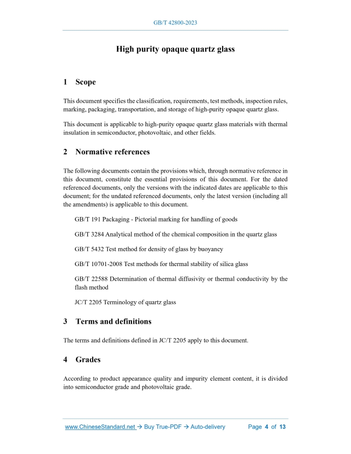 Similar standardsGB/T 42800-2023: High purity opaque quartz glass---This is an excerpt. Full copy of true-PDF in English version (including equations, symbols, images, flow-chart, tables, and figures etc.), auto-downloaded/delivered in 9 seconds, can be purchased online: https://www.ChineseStandard.net/PDF.aspx/GBT42800-2023GB NATIONAL STANDARD OF THE PEOPLE’S REPUBLIC OF CHINA ICS 81.040.30 CCS Q 35 High purity opaque quartz glass 高纯不透明石英玻璃 ISSUED ON: MAY 23, 2023 IMPLEMENTED ON: DECEMBER 1, 2023 Issued by: State Administration for Market Regulation; Standardization Administration of PRC. Table of ContentsForeword ... 3 1 Scope ... 4 2 Normative references ... 4 3 Terms and definitions ... 4 4 Grades ... 4 5 Requirements ... 5 6 Test method ... 6 7 Inspection rules ... 10 8 Marking, packaging, transportation, and storage ... 13 High purity opaque quartz glass1 ScopeThis document specifies the classification, requirements, test methods, inspection rules, marking, packaging, transportation, and storage of high-purity opaque quartz glass. This document is applicable to high-purity opaque quartz glass materials with thermal insulation in semiconductor, photovoltaic, and other fields.2 Normative referencesThe following documents contain the provisions which, through normative reference in this document, constitute the essential provisions of this document. For the dated referenced documents, only the versions with the indicated dates are applicable to this document; for the undated referenced documents, only the latest version (including all the amendments) is applicable to this document. GB/T 191 Packaging - Pictorial marking for handling of goods GB/T 3284 Analytical method of the chemical composition in the quartz glass GB/T 5432 Test method for density of glass by buoyancy GB/T 10701-2008 Test methods for thermal stability of silica glass GB/T 22588 Determination of thermal diffusivity or thermal conductivity by the flash method JC/T 2205 Terminology of quartz glass3 Terms and definitionsThe terms and definitions defined in JC/T 2205 apply to this document.4 GradesAccording to product appearance quality and impurity element content, it is divided into semiconductor grade and photovoltaic grade.5 Requirements5.1 Specifications, dimensions, and dimensional deviations They are negotiated by the supply and demand sides. 5.2 Appearance quality 5.2.1 The surface shall be smooth, uniform in color, and free from cracks, regular microcracks, and scratches with a length greater than 10 mm or a width greater than 0.5 mm. 5.2.2 Visually it is milky white, and there shall be no transparent areas. 5.2.3 Semiconductor-grade high-purity opaque quartz glass shall not have speck spots, coloured spots, and raw material particles; photovoltaic-grade high-purity opaque quartz glass shall not have speck spots, coloured spots, and raw material particles with a diameter greater than 1 mm, and the total number of speck spots, coloured spots, and raw meal particles, whose diameters are not greater than 1 mm, in any area of 100 cm2 shall not exceed 4. 5.3 Density The density shall not be greater than 2.15 g/cm3 and not less than 1.90 g/cm3. 5.4 Spectra transmittance The spectra transmittance in the wavelength range of 380 nm~3000 nm shall be less than 1.0%. 5.5 Thermal stability After the test, there shall be no cracks, breaches, or skin flake-off. 5.6 Heat resistance The deformation rate after the test shall not exceed 2.0%. 5.7 Thermal conductivity At 20 ℃, the thermal conductivity shall not be greater than 1.25 W/(m • K) and not less than 1.00 W/(m • K). 5.8 Content of impurity elements The impurity elements include aluminum (Al), iron (Fe), calcium (Ca), magnesium (Mg), titanium (Ti), copper (Cu), cobalt (Co), nickel (Ni), manganese (Mn), lithium Clean the sample in an ultrasonic bath, then wipe it clean with alcohol, rinse it with deionized water, and dry it naturally; then, carry out the test according to the method specified in GB/T 5432, and round the results to two decimal places. 6.5 Spectra transmittance 6.5.1 Sample Take one piece of sample; the length and width are about 50 mm, the thickness after grinding is 5 mm±0.5 mm, and there are no obvious speck spots, coloured spots, raw material particles, or other defects that affect the test. 6.5.2 Test equipment The requirements for the spectrophotometer: a) It is able to measure the spectra transmittance of regular light; b) The wavelength includes the range of 380 nm~3000 nm; c) The transmittance measurement accuracy is not less than ±1%. 6.5.3 Test procedure The test is carried out as follows: a) Wipe the surface of the sample with alcohol until it is clean, rinse it with deionized water, and dry it at 110 °C±5 °C; b) Use a spectrophotometer to measure the spectra transmittance of the sample in the range of 380 nm~3000 nm for regular light. 6.5.4 Data processing Read the maximum transmittance value and round the result to one decimal place. 6.6 Thermal stability Carry out the test according to the air cooling method specified in GB/T 10701-2008. Take three samples with a length of 50 mm±1 mm, a width of 50 mm±1 mm, and a thickness of 5 mm±1 mm, keep them at the temperature of 1200 ℃±10 ℃ for 30 min, take them out and cool them in the air to room temperature. 6.7 Heat resistance 6.7.1 Samples Take 3 samples; the length is 180 mm±2 mm, the width is 20 mm±1 mm, and the H1 -- the arch height of the sample before the test, in millimeters (mm); H2 -- the arch height of the sample after the test, in millimeters (mm). The result is rounded to one decimal place, and the maximum deformation rate among the three samples is taken as the measurement result. 6.8 Thermal conductivity Clean the sample in an ultrasonic bath, then wipe it with alcohol, rinse it with deionized water, and dry it at 110 ℃±5 ℃ or dry it naturally; carry out the test according to the method specified in GB/T 22588, and round the result to 2 decima
