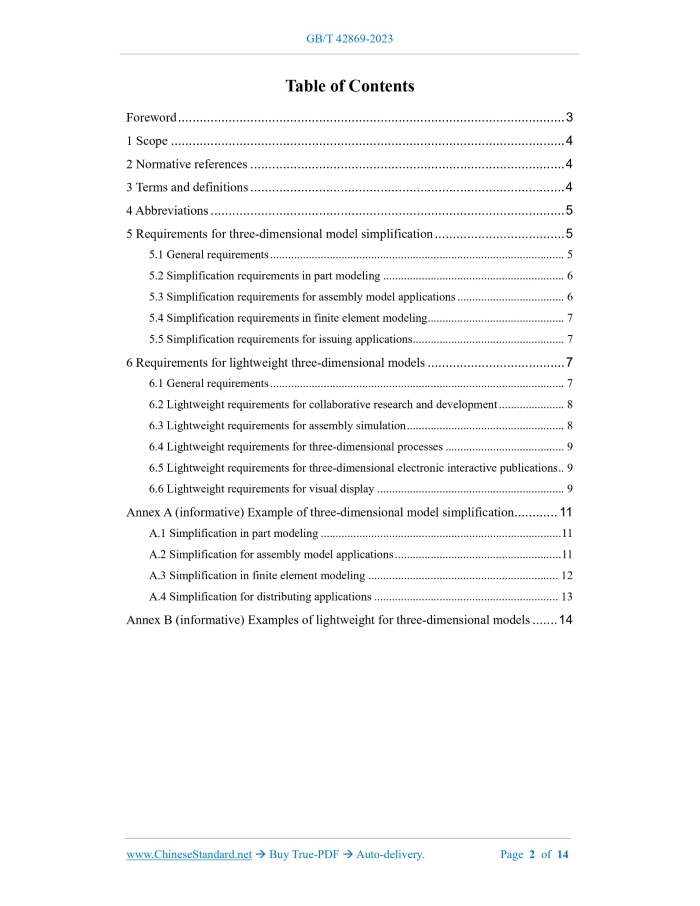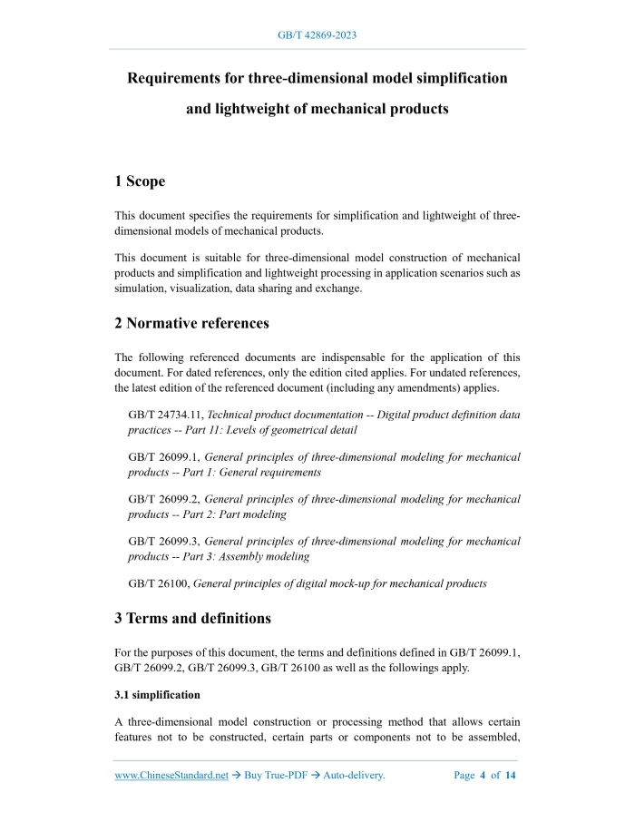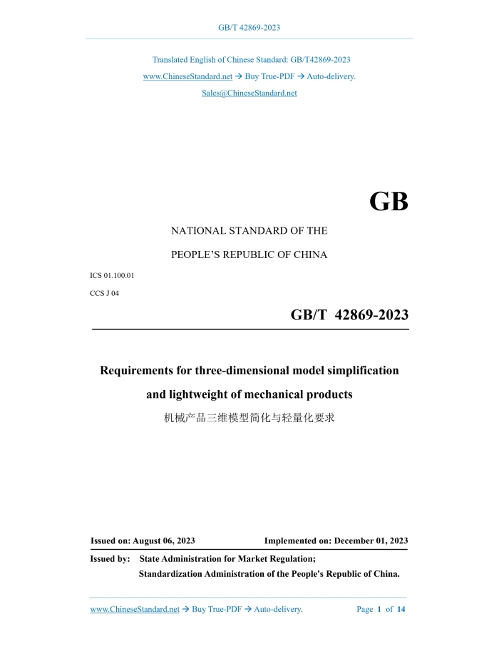 Similar standardsGB/T 42869-2023: Requirements for three-dimensional model simplification and lightweight of mechanical products---This is an excerpt. Full copy of true-PDF in English version (including equations, symbols, images, flow-chart, tables, and figures etc.), auto-downloaded/delivered in 9 seconds, can be purchased online: https://www.ChineseStandard.net/PDF.aspx/GBT42869-2023 GB NATIONAL STANDARD OF THE PEOPLE’S REPUBLIC OF CHINA ICS 01.100.01 CCS J 04 Requirements for three-dimensional model simplification and lightweight of mechanical products ISSUED ON: AUGUST 06, 2023 IMPLEMENTED ON: DECEMBER 01, 2023 Issued by: State Administration for Market Regulation; Standardization Administration of the People's Republic of China. Table of ContentsForeword ... 3 1 Scope ... 4 2 Normative references ... 4 3 Terms and definitions ... 4 4 Abbreviations ... 5 5 Requirements for three-dimensional model simplification ... 5 5.1 General requirements ... 5 5.2 Simplification requirements in part modeling ... 6 5.3 Simplification requirements for assembly model applications ... 6 5.4 Simplification requirements in finite element modeling ... 7 5.5 Simplification requirements for issuing applications ... 7 6 Requirements for lightweight three-dimensional models ... 7 6.1 General requirements ... 7 6.2 Lightweight requirements for collaborative research and development ... 8 6.3 Lightweight requirements for assembly simulation ... 8 6.4 Lightweight requirements for three-dimensional processes ... 9 6.5 Lightweight requirements for three-dimensional electronic interactive publications .. 9 6.6 Lightweight requirements for visual display ... 9 Annex A (informative) Example of three-dimensional model simplification ... 11 A.1 Simplification in part modeling ... 11 A.2 Simplification for assembly model applications ... 11 A.3 Simplification in finite element modeling ... 12 A.4 Simplification for distributing applications ... 13 Annex B (informative) Examples of lightweight for three-dimensional models ... 14 Requirements for three-dimensional model simplification and lightweight of mechanical products1 ScopeThis document specifies the requirements for simplification and lightweight of three- dimensional models of mechanical products. This document is suitable for three-dimensional model construction of mechanical products and simplification and lightweight processing in application scenarios such as simulation, visualization, data sharing and exchange.2 Normative referencesThe following referenced documents are indispensable for the application of this document. For dated references, only the edition cited applies. For undated references, the latest edition of the referenced document (including any amendments) applies. GB/T 24734.11, Technical product documentation -- Digital product definition data practices -- Part 11: Levels of geometrical detail GB/T 26099.1, General principles of three-dimensional modeling for mechanical products -- Part 1: General requirements GB/T 26099.2, General principles of three-dimensional modeling for mechanical products -- Part 2: Part modeling GB/T 26099.3, General principles of three-dimensional modeling for mechanical products -- Part 3: Assembly modeling GB/T 26100, General principles of digital mock-up for mechanical products3 Terms and definitionsFor the purposes of this document, the terms and definitions defined in GB/T 26099.1, GB/T 26099.2, GB/T 26099.3, GB/T 26100 as well as the followings apply. 3.1 simplification A three-dimensional model construction or processing method that allows certain features not to be constructed, certain parts or components not to be assembled, f) Name the simplified model file in accordance with the provisions of GB/T 26099.1. Consider the inheritance with the original model name. 5.2 Simplification requirements in part modeling 5.2.1 Three-dimensional model simplification in part modeling meets the following requirements: a) The external interface of the model shall not be simplified and its assembly shall not be affected; b) Some features related to manufacturing, such as internal threads, external threads, undercuts, etc., are allowed to be omitted or simplified in expression. However, when the simplified model is used for projection to generate two-dimensional engineering drawings, it shall meet the relevant regulations of mechanical drawing; c) For several groups of holes with the same diameter and distributed in a certain regular pattern, only one feature can be constructed. Other similar features can be simplified by the center line; d) Features such as printing, engraving, and knurling allow simplified expression in the form of stickers. When necessary, it can also be accompanied by comments; e) When modeling standard parts and purchased parts, the internal structure unrelated to installation is allowed to be simplified, but basic information that affects the model assembly design such as the maximum geometric outline, installation interface, extreme position, and mass attributes shall be included; f) Under the conditions that meet the usage requirements, low-order surfaces can be used instead of high-order surfaces. 5.2.2 See Figure A.1 in Annex A for a simplification example in part modeling. 5.3 Simplification requirements for assembly model applications 5.3.1 Three-dimensional model simplification for assembly model applications meets the following requirements. a) When assembly models are used for visual display, such as in digital factories or digital production line visual display applications, for assembly models of production lines, machine tools, logistics and other equipment, if the internal details do not need to be displayed, a simplified method without assembly can be used. If some external subtle features do not affect the display effect, simple shapes (cylinder, cube, etc.) can be used instead of the simplified method of complex shapes. b) Generally, it is advisable to remove the modeling history inf