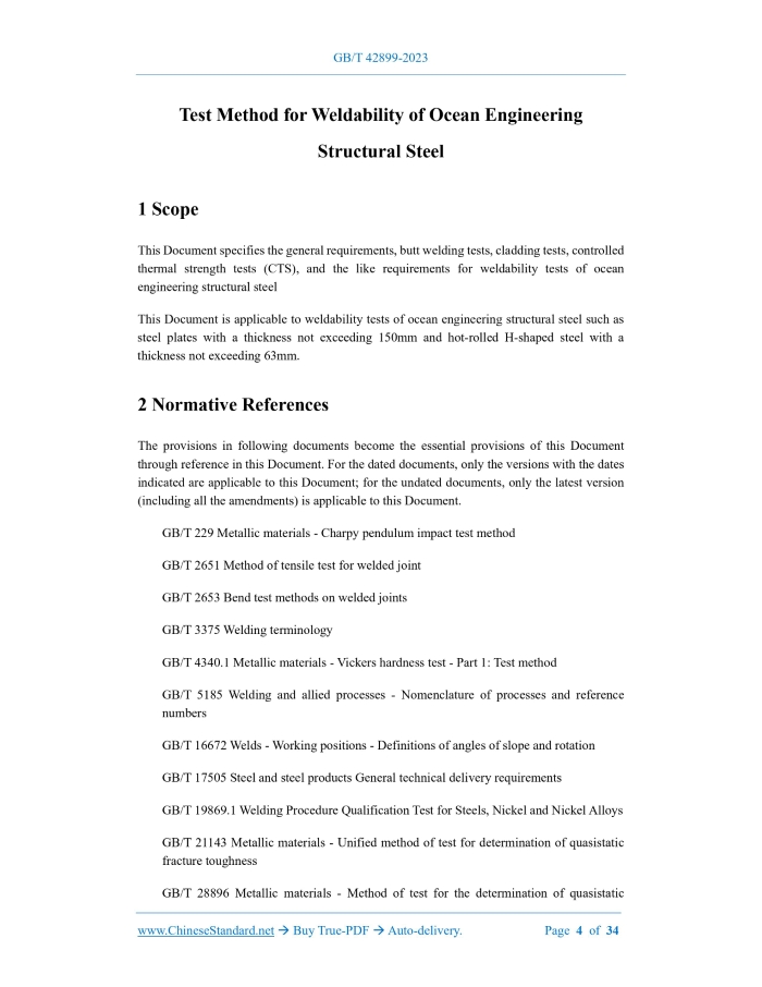 Similar standardsGB/T 42899-2023: Test method for weldability of ocean engineering structural steel---This is an excerpt. Full copy of true-PDF in English version (including equations, symbols, images, flow-chart, tables, and figures etc.), auto-downloaded/delivered in 9 seconds, can be purchased online: https://www.ChineseStandard.net/PDF.aspx/GBT42899-2023GB NATIONAL STANDARD OF THE PEOPLE’S REPUBLIC OF CHINA ICS 77.140.60 CCS H 44 Test Method for Weldability of Ocean Engineering Structural Steel ISSUED ON: AUGUST 6, 2023 IMPLEMENTED ON: MARCH 1, 2024 Issued by: State Administration for Market Regulation; Standardization Administration of the People’s Republic of China. Table of ContentsForeword ... 3 1 Scope ... 4 2 Normative References ... 4 3 Terms and Definitions ... 5 4 General Requirements ... 5 5 Butt Welding Test ... 7 6 Overlay Welding Test ... 24 7 Controlled Thermal Strength Test ... 26 Appendix A (Informative) Correspondence Table of Steel Grades and Designations of Ocean Engineering Structural Steel ... 33 Bibliography ... 34 Test Method for Weldability of Ocean Engineering Structural Steel1 ScopeThis Document specifies the general requirements, butt welding tests, cladding tests, controlled thermal strength tests (CTS), and the like requirements for weldability tests of ocean engineering structural steel This Document is applicable to weldability tests of ocean engineering structural steel such as steel plates with a thickness not exceeding 150mm and hot-rolled H-shaped steel with a thickness not exceeding 63mm.2 Normative ReferencesThe provisions in following documents become the essential provisions of this Document through reference in this Document. For the dated documents, only the versions with the dates indicated are applicable to this Document; for the undated documents, only the latest version (including all the amendments) is applicable to this Document. GB/T 229 Metallic materials - Charpy pendulum impact test method GB/T 2651 Method of tensile test for welded joint GB/T 2653 Bend test methods on welded joints GB/T 3375 Welding terminology GB/T 4340.1 Metallic materials - Vickers hardness test - Part 1: Test method GB/T 5185 Welding and allied processes - Nomenclature of processes and reference numbers GB/T 16672 Welds - Working positions - Definitions of angles of slope and rotation GB/T 17505 Steel and steel products General technical delivery requirements GB/T 19869.1 Welding Procedure Qualification Test for Steels, Nickel and Nickel Alloys GB/T 21143 Metallic materials - Unified method of test for determination of quasistatic fracture toughness GB/T 28896 Metallic materials - Method of test for the determination of quasistatic a) The heating rate shall not exceed (5500/t)℃/h or 55℃/h, whichever is larger; where t is the thickness of the test plate in mm; b) The welded specimen shall be cooled to 400℃ at a cooling rate not exceeding (6875/t)℃/h or 55℃/h, whichever is larger; where t is the thickness of the test plate in mm; c) Air-cool to room temperature below 400℃. 5.3.6.2 For steel sheets with steel grades of Q420, Q460, Q500, Q550, Q620 and Q690 quenched and tempered (QT), the heat treatment temperature during post-weld heat treatment shall be between 550℃ and 620℃; and the maximum temperature shall be 25℃ lower than the tempering temperature specified in the quality assurance certificate. The heat treatment time shall be no less than the time calculated by 1h for every 25mm thickness of the steel or 4h. The heating rate and cooling rate shall comply with the following provisions: a) The heating rate shall not exceed (5500/t)℃/h or 55℃/h, whichever is larger; where t is the thickness of the test plate in mm; b) The welding specimen shall be cooled to 400℃ at a cooling rate not exceeding (6875/t)℃/h or 55℃/h, whichever is larger; where t is the thickness of the test plate in mm; c) Air-cool to room temperature below 400℃. 5.3.7 Dehydrogenation treatment of specimen Under necessary conditions, low-temperature dehydrogenation treatment shall be carried out on the welded specimens before the fracture mechanics test. The specific process shall be noted in the dehydrogenation treatment report. The recommended dehydrogenation treatment process is 150℃ heat-insulation for 48h; and the dehydrogenation treatment process parameters shall be noted in the fracture mechanics test report. In special cases, such as ultra-thick specimens, the dehydrogenation treatment process can be adjusted to reduce the hydrogen content in the specimen after consultation between the supplier and the purchaser. In this case, the dehydrogenation treatment process can increase the temperature and extend the treatment time, but the heat-insulation temperature shall not exceed 250℃. 5.4 Butt welding mechanical test 5.4.1 General requirements Butt welding mechanical test shall comply with the provisions of Tables 5 and 6. For hot-rolled H-shaped steel, longitudinal or transverse butt weld mechanical tests shall be carried out, as shown in Figure 1. The specimen shall be taken from 1/6 of the flange width. When the weldability test involves weld metal properties [e.g., weld metal fracture mechanics and Charpy V-notch impact toughness (FL-2)], the sampling position of the specimen can be determined by the supplier. For hot-rolled H-shaped steel with flange thickness exceeding 16 mm, fracture mechanics tests can be carried out after consultation between the supplier and the purchaser. Butt welding joint shall comply with the following mechanical test requirements: a) Charpy V-notch impact test The sampling position, sampling direction and impact test results of steel sheets and hot- rolled H-shaped steel impact specimens shall comply with the provisions of Tables 5 and 6, respectively. Re-inspection shall comply with the provisions of GB/T 17505. b) Fracture mechanics test The test shall be carried out at an ambient temperature of -10℃, and the test resul