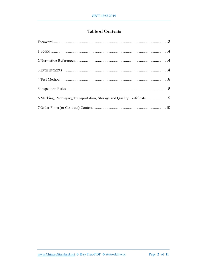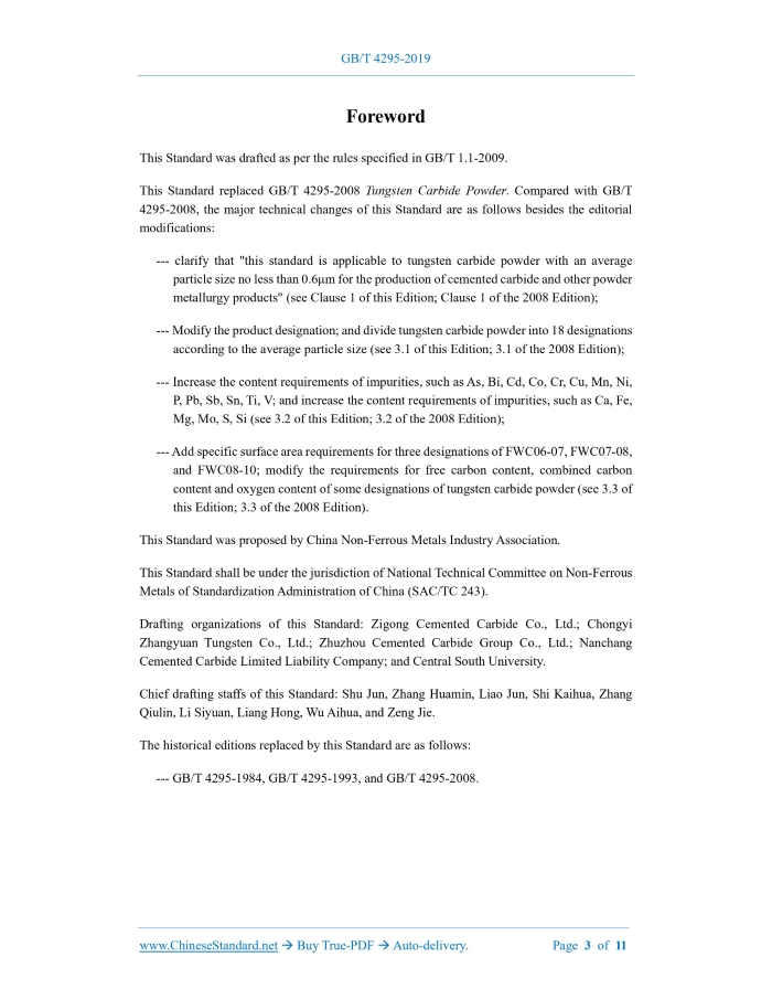 Similar standardsGB/T 4295-2019: Tungsten carbide powder---This is an excerpt. Full copy of true-PDF in English version (including equations, symbols, images, flow-chart, tables, and figures etc.), auto-downloaded/delivered in 9 seconds, can be purchased online: https://www.ChineseStandard.net/PDF.aspx/GBT4295-2019GB NATIONAL STANDARD OF THE PEOPLE’S REPUBLIC OF CHINA ICS 77.160 H 71 Replacing GB/T 4295-2008 Tungsten Carbide Powder 碳化钨粉 ISSUED ON: JUNE 04, 2019 IMPLEMENTED ON: MAY 01, 2020 Issued by: State Administration for Market Regulation; Standardization Administration of the People’s Republic of China. Table of ContentsForeword ... 3 1 Scope ... 4 2 Normative References ... 4 3 Requirements ... 4 4 Test Method ... 8 5 inspection Rules ... 8 6 Marking, Packaging, Transportation, Storage and Quality Certificate ... 9 7 Order Form (or Contract) Content ... 10ForewordThis Standard was drafted as per the rules specified in GB/T 1.1-2009. This Standard replaced GB/T 4295-2008 Tungsten Carbide Powder. Compared with GB/T 4295-2008, the major technical changes of this Standard are as follows besides the editorial modifications: --- clarify that "this standard is applicable to tungsten carbide powder with an average particle size no less than 0.6μm for the production of cemented carbide and other powder metallurgy products" (see Clause 1 of this Edition; Clause 1 of the 2008 Edition); --- Modify the product designation; and divide tungsten carbide powder into 18 designations according to the average particle size (see 3.1 of this Edition; 3.1 of the 2008 Edition); --- Increase the content requirements of impurities, such as As, Bi, Cd, Co, Cr, Cu, Mn, Ni, P, Pb, Sb, Sn, Ti, V; and increase the content requirements of impurities, such as Ca, Fe, Mg, Mo, S, Si (see 3.2 of this Edition; 3.2 of the 2008 Edition); --- Add specific surface area requirements for three designations of FWC06-07, FWC07-08, and FWC08-10; modify the requirements for free carbon content, combined carbon content and oxygen content of some designations of tungsten carbide powder (see 3.3 of this Edition; 3.3 of the 2008 Edition). This Standard was proposed by China Non-Ferrous Metals Industry Association. This Standard shall be under the jurisdiction of National Technical Committee on Non-Ferrous Metals of Standardization Administration of China (SAC/TC 243). Drafting organizations of this Standard: Zigong Cemented Carbide Co., Ltd.; Chongyi Zhangyuan Tungsten Co., Ltd.; Zhuzhou Cemented Carbide Group Co., Ltd.; Nanchang Cemented Carbide Limited Liability Company; and Central South University. Chief drafting staffs of this Standard: Shu Jun, Zhang Huamin, Liao Jun, Shi Kaihua, Zhang Qiulin, Li Siyuan, Liang Hong, Wu Aihua, and Zeng Jie. The historical editions replaced by this Standard are as follows: --- GB/T 4295-1984, GB/T 4295-1993, and GB/T 4295-2008. Tungsten Carbide Powder1 ScopeThis Standard specifies the requirements, test methods, inspection rules, marking, packaging, transportation, storage, quality certificates and purchase orders (or contracts) for tungsten carbide powder. This Standard applies to tungsten carbide powder with an average particle size no less than 0.6μm for the production of cemented carbide and other powder metallurgy products.2 Normative ReferencesThe following documents are essential to the application of this Document. For the dated documents, only the versions with the dates indicated are applicable to this Document; for the undated documents, only the latest version (including all the amendments) is applicable to this Document. GB/T 3249 Test method for fisher number of metal powders and related compounds GB/T 4324 (all parts) Methods for chemical analysis of tungsten GB/T 5124.1 Methods for chemical analysis of hard-metals - Determination of total carbon content - Gravimetric method GB/T 5124.2 Methods for chemical analysis of hard-metals - Determination of insoluble (free) carbon content - Gravimetric method GB/T 5314 Powders for powder metallurgical purposes - Sampling GB/T 13390 Metallic powder - Determination of the specific surface area - Method of nitrogen adsorption YS/T 559 Methods for emission spectrum analysis of tungsten3 Requirements3.1 Product classification Tungsten carbide powder is divided into 18 designations according to the average particle size, such as FWC06-07, FWC07-08, FWC08-10, FWC10-15, FWC15-20, FWC20-25, FWC25-30,4 Test Method4.1 The main composition content is calculated by impurity reduction method. 4.2 The determination of impurity content shall be carried out according to the provisions of GB/T 4324 or YS/T 559; and the arbitration analysis method shall be carried out according to the provisions of GB/T 4324. 4.3 The determination of the average particle size shall be carried out in accordance with the provisions of GB/T 3249. 4.4 The determination of the specific surface area shall be carried out in accordance with the provisions of GB/T 13390. 4.5 The determination of the total carbon content shall be carried out according to the provisions of GB/T 5124.1; the determination of the free carbon content shall be carried out according to the provisions of GB/T 5124.2; and the combined carbon content shall be obtained by subtracting the free carbon content from the total carbon content. The determination of total carbon and free carbon contents can also be carried out according to the method negotiated between the supplier and the purchaser. 4.6 The determination of oxygen content shall be carried out according to the provisions of GB/T 4324. 4.7 Sieving shall be carried out in a manner agreed upon by both the supplier and the purchaser. 4.8 The appearance quality shall be inspected visually.5 inspection Rules5.1 Inspection and acceptance 5.1.1 The product shall be inspected by the quality supervision department of the supplier to ensure that the product quality complies with the provisions of this Standard; and fill in the product quality certi
