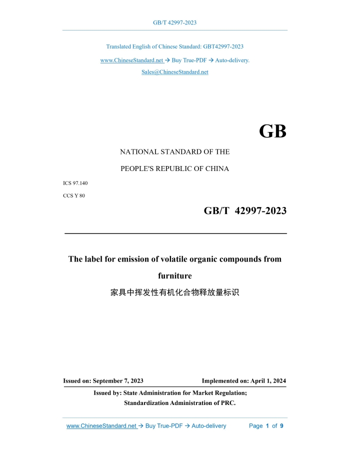 GB/T 42997-2023: The label for emission of volatile organic compounds from furniture Delivery: 9 seconds. True-PDF full-copy in English & invoice will be downloaded + auto-delivered via email. See step-by-step procedure Status: Valid
