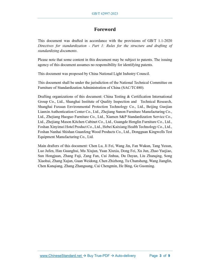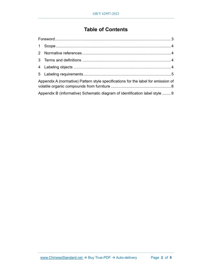 Similar standardsGB/T 42997-2023: The label for emission of volatile organic compounds from furniture---This is an excerpt. Full copy of true-PDF in English version (including equations, symbols, images, flow-chart, tables, and figures etc.), auto-downloaded/delivered in 9 seconds, can be purchased online: https://www.ChineseStandard.net/PDF.aspx/GBT42997-2023GB NATIONAL STANDARD OF THE PEOPLE'S REPUBLIC OF CHINA ICS 97.140 CCS Y 80 The label for emission of volatile organic compounds from furniture ISSUED ON: SEPTEMBER 7, 2023 IMPLEMENTED ON: APRIL 1, 2024 Issued by: State Administration for Market Regulation; Standardization Administration of PRC. Table of ContentsForeword ... 3 1 Scope ... 4 2 Normative references ... 4 3 Terms and definitions ... 4 4 Labeling objects ... 4 5 Labeling requirements ... 5 Appendix A (normative) Pattern style specifications for the label for emission of volatile organic compounds from furniture ... 8 Appendix B (informative) Schematic diagram of identification label style ... 9ForewordThis document was drafted in accordance with the provisions of GB/T 1.1-2020 Directives for standardization - Part 1: Rules for the structure and drafting of standardizing documents. Please note that some content in this document may be subject to patents. The issuing agency of this document assumes no responsibility for identifying patents. This document was proposed by China National Light Industry Council. This document shall be under the jurisdiction of the National Technical Committee on Furniture of Standardization Administration of China (SAC/TC480). Drafting organizations of this document: China Testing & Certification International Group Co., Ltd., Shanghai Institute of Quality Inspection and Technical Research, Shanghai Fuxuan Environmental Protection Technology Co., Ltd., Beijing Guojian Lianxin Authentication Center Co., Ltd., Zhejiang Sunon Furniture Manufacturing Co., Ltd., Zhejiang Haoguo Furniture Co., Ltd., Xiamen S&P Standardization Service Co., Ltd., Zhejiang Mason Kitchen Cabinet Co., Ltd., Guangde Henglin Furniture Co., Ltd., Foshan Xinyimei Hotel Product Co., Ltd., Hebei Kaixiang Health Technology Co., Ltd., Foshan Nanhai Shishan Guanfeng Wood Products Co., Ltd., Dongguan Kingwells Test Equipment Manufacturing Co., Ltd. Main drafters of this document: Chen Lu, Ji Fei, Wang Jin, Fan Wukun, Tang Yuxun, Luo Jufen, Han Guanghui, Mu Xiujun, Yuan Xiuxia, Dong Fei, Xu Jun, Zhao Yuejiao, Sun Hongjuan, Zhang Fuji, Zang Fan, Cui Jinhua, Du Dayan, Liu Zhanqing, Song Xiaohui, Zhang Xujun, Guan Weidong, Chen Zhizhong, Tu Chunsheng, Wang Jianglin, Chen Kunqiang, Zhang Zhanguang, Cai Chengmin, He Bing, Ge Guoming. The label for emission of volatile organic compounds from furniture1 ScopeThis document specifies the terms and definitions, labeling objects, and labeling requirements for labels for emission of volatile organic compounds from furniture. This document applies to the label for the emission of volatile organic compounds from furniture.2 Normative referencesThe following documents contain the provisions which, through normative reference in this document, constitute the essential provisions of this document. For the dated referenced documents, only the versions with the indicated dates are applicable to this document; for the undated referenced documents, only the latest version (including all the amendments) is applicable to this document. GB/T 42996.1-2023 Guidelines for the control of key chemical substances in furniture - Part 1: Wooden furniture GB/T 42996.2-2023 Guidelines for the control of key chemical substances in furniture - Part 2: Upholstered furniture3 Terms and definitionsThe following terms and definitions apply to this document. 3.1 label for emission of volatile organic compounds An information label indicating that the emission of volatile organic compounds (VOCs) from furniture meets the requirements of specified standards.4 Labeling objectsWhen the emission of VOCs from wooden furniture meets the requirements of GB/T 42996.1-2023, or the emission of VOCs from upholstered furniture meets the requirements of GB/T 42996.2-2023, its product manufacturers can use the label for 5.1.4 Pattern requirements 5.1.4.1 The marking of logo patterns can be carried out by posting, spraying, or imprinting. Among them, when marking by posting and spraying, the color of the logo pattern shall comply with the provisions of Appendix A. When marking by imprinting, the true color of the product can be used. 5.1.4.2 The logo pattern shall be clearly visible and shall not impair the performance of the furniture or damage the furniture coating. 5.1.4.3 The logo pattern shall be pasted or hung on an obvious part of the furniture, or it can be marked on the furniture or in the instructions for use. 5.2 Identification label information 5.2.1 Labeling method The logo pattern should be equipped with an identification label, and the identification label should be placed on the right side or below the logo pattern. 5.2.2 Information content The identification label shall contain at least the following information: a) Company name, production date/batch number; b) Product name, specification, and model; c) Product execution standard; d) Types and limits of VOCs specified in the execution standards; e) The statement that "the emission of volatile organic compounds from this furniture meets the limit requirements". 5.2.3 Division of identification label functional areas 5.2.3.1 The identification label consists of two functional areas: "title area" and "information area", see Figure B.1 of Appendix B. 5.2.3.2 The "title area" is located at the top of the label and displays the name information of the label. The left side of the title area is the corporate logo, and the right which corresponds to "EMISSION OF VOLATILE ORGANIC COMPOUNDS FROM FURNITURE" in English capital letters, arranged with Chinese characters at the top and English characters at the bottom. ......Source: A