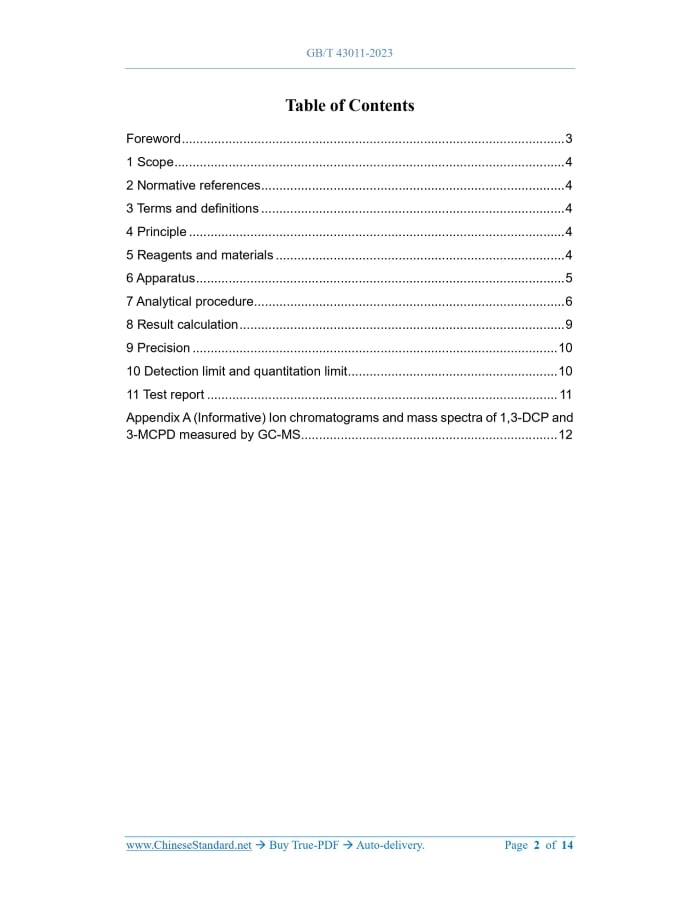 Similar standardsGB/T 43011-2023: Paper, board and paper products - Determination of chloropropanol content---This is an excerpt. Full copy of true-PDF in English version (including equations, symbols, images, flow-chart, tables, and figures etc.), auto-downloaded/delivered in 9 seconds, can be purchased online: https://www.ChineseStandard.net/PDF.aspx/GBT43011-2023GB NATIONAL STANDARD OF THE PEOPLE’S REPUBLIC OF CHINA ICS 85.010 CCS Y 30 Paper, board and paper products - Determination of chloropropanol content ISSUED ON: SEPTEMBER 7, 2023 IMPLEMENTED ON: APRIL 1, 2024 Issued by: State Administration for Market Regulation; Standardization Administration of the PRC. Table of ContentsForeword ... 3 1 Scope ... 4 2 Normative references ... 4 3 Terms and definitions ... 4 4 Principle ... 4 5 Reagents and materials ... 4 6 Apparatus ... 5 7 Analytical procedure ... 6 8 Result calculation ... 9 9 Precision ... 10 10 Detection limit and quantitation limit ... 10 11 Test report ... 11 Appendix A (Informative) Ion chromatograms and mass spectra of 1,3-DCP and 3-MCPD measured by GC-MS ... 12 Paper, board and paper products - Determination of chloropropanol content1 ScopeThis document describes a method for the determination of content of 1,3-dichloro-2- propanol (1,3-DCP) and 3-chloro-1,2-propanediol (3-MCPD) in paper, board and paper products. This document is applicable to all kinds of paper, board and paper products; is used as a reference for pulps and papermaking wet strength agents.2 Normative referencesThe contents of the following documents, through normative references in this text, constitute indispensable provisions of this document. Among them, for dated references, only the edition corresponding to that date applies to this document. For undated references, the latest edition (including all amendments) applies to this document. GB/T 462 Paper, board and pulps - Determination of moisture content of analytical sample GB/T 6682 Water for analytical laboratory use - Specification and test methods3 Terms and definitionsThere are no terms or definitions to be defined in this document.4 PrincipleAfter the sample is chopped, mixed or diluted, add a deuterium-labeled internal standard solution to the specimen; use sodium chloride solution (20%) to extract it. After concentration, use heptafluorobutyrylimidazole to derivatize it; use gas chromatography-mass spectrometry for detection AND the internal standard method for quantification.5 Reagents and materialsUnless otherwise specified, use only analytically pure reagents. 6.7 Nylon microporous filter membrane: Pore size is 0.22 μm. 6.8 Vortex mixer. 6.9 Pipette: 100 μL and 1000 μL. 6.10 Other commonly-used laboratory glassware.7 Analytical procedure7.1 Preparation of standard solutions 7.1.1 Chloropropanol mixed standard stock solution (1000 mg/L): Respectively weigh 50 mg (accurate to 0.1 mg) of 1,3-DCP standard (5.9) and of 3-MCPD standard (5.10); use ethyl acetate (5.3) to dissolve and transfer to a 50 mL volumetric flask; use ethyl acetate (5.3) to dilute to the mark; seal and store at 0 °C~4 °C. The storage period is 6 months. 7.1.2 Chloropropanol mixed standard intermediate solution (10 mg/L): Accurately pipette 0.1 mL of chloropropanol mixed standard stock solution (7.1.1) into a 10 mL volumetric flask; use ethyl acetate (5.3) to dilute to the mark; seal and store at 0 °C~4 °C. The storage period is 3 months. 7.1.3 Chloropropanol mixed standard intermediate solution (1 mg/L): Accurately pipette 0.1 mL of chloropropanol mixed standard stock solution (7.1.1) into a 100 mL volumetric flask; use ethyl acetate (5.3) to dilute to the mark; seal and store at 0 °C~4 °C. The storage period is 3 months. 7.1.4 Chloropropanol internal standard mixed standard stock solution (1000 mg/L): Respectively weigh 50 mg (accurate to 0.1 mg) of 1,3-DCP-D5 standard (5.11) and of 3-MCPD-D5 standard (5.12); use ethyl acetate (5.3) to dissolve and transfer to a 50 mL volumetric flask; use ethyl acetate (5.3) to dilute to the mark; seal and store at 0 °C~4 °C. The storage period is 6 months. 7.1.5 Chloropropanol internal standard mixed standard intermediate solution (10 mg/L): Accurately pipette 0.1 mL of chloropropanol internal standard mixed standard stock solution (7.1.4) into a 10 mL volumetric flask; use ethyl acetate (5.3) to dilute to the mark; seal and store at 0 °C~4 °C. The storage period is 3 months. 7.1.6 Chloropropanol standard working solutions: Respectively pipette 0.01 mL, 0.05 mL, 0.1 mL, 0.2 mL, 0.4 mL, 0.8 mL, 1.6 mL of chloropropanol mixed standard intermediate solution (1 mg/L) (7.1.3) AND 0.32 mL of chloropropanol mixed standard intermediate solution (10 mg/L) (7.1.2) INTO transparent glass tubes with a stopper (cap) of appropriate volume (5 mL or 10 mL) with good airtightness. Respectively add 20 μL of chloropropanol internal standard mixed standard intermediate solution (10 mg/L) (7.1.5); add n-hexane (5.2) to 2 mL and mix well. Prepare a series of standard working solutions containing 10 ng, 50 ng, 100 ng, 200 ng, 400 ng, 800 ng, 1600 ng, and 3200 ng of 1,3-DCP and 3-MCPD respectively; in which the mass of each deuterated chloropropanol is 200 ng. Standard solutions of other concentrations can also be prepared as needed. Prepare the standard working solution at the time of use. 7.2 Sample processing For the sample of paper, board, paper products and pulp, weigh about 10 g of the sample; cut it into small pieces of about 5 mm×5 mm. After mixing well, accurately weigh 1.0 g (accurate to 0.0001 g) of the specimen into a glass test tube (6.5). At the same time, take another specimen from the sample; measure the moisture content according to GB/T 462. For the sample of papermaking wet strength agents, if the chloropropanol content is high, in order to ensure the representativeness of the sampling, use water (5.1) to dilute the sample appropriately step by step. Then accurately weigh 1.0 g (accurate to 0.0001 g) of the diluted an