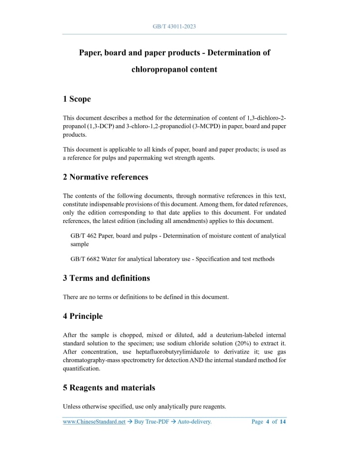 GB/T 43011-2023: Paper, board and paper products - Determination of chloropropanol content Delivery: 9 seconds. True-PDF full-copy in English & invoice will be downloaded + auto-delivered via email. See step-by-step procedure Status: Valid