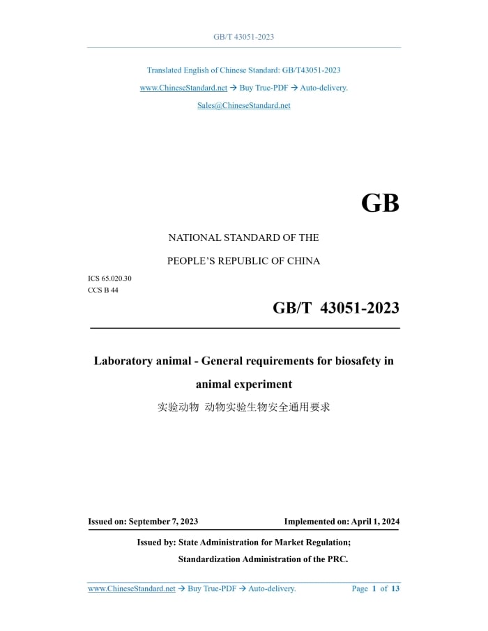 GB/T 43051-2023: Laboratory animal - General requirements for biosafety in animal experiment Delivery: 9 seconds. True-PDF full-copy in English & invoice will be downloaded + auto-delivered via email. See step-by-step procedure Status: Valid