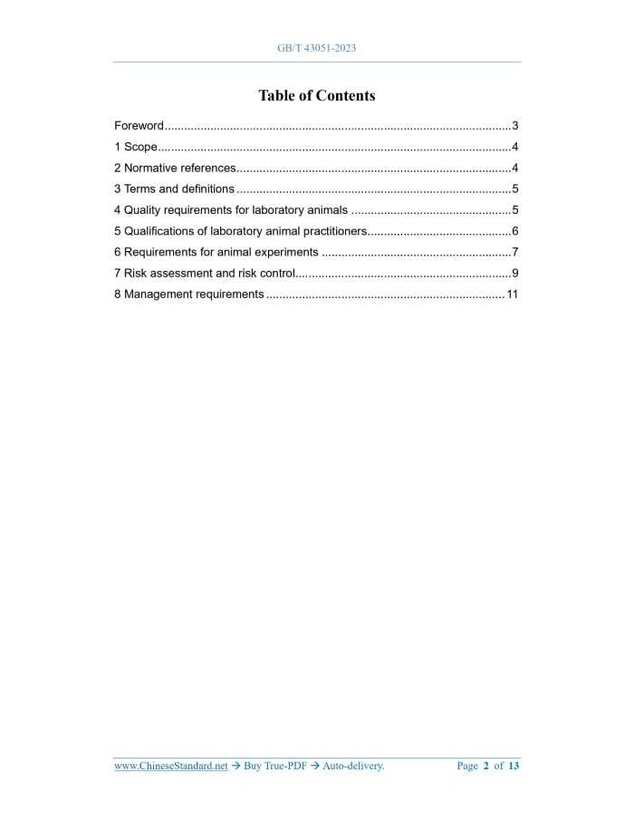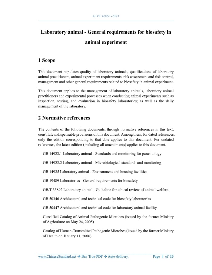 Similar standardsGB/T 43051-2023: Laboratory animal - General requirements for biosafety in animal experiment---This is an excerpt. Full copy of true-PDF in English version (including equations, symbols, images, flow-chart, tables, and figures etc.), auto-downloaded/delivered in 9 seconds, can be purchased online: https://www.ChineseStandard.net/PDF.aspx/GBT43051-2023GB NATIONAL STANDARD OF THE PEOPLE’S REPUBLIC OF CHINA ICS 65.020.30 CCS B 44 Laboratory animal - General requirements for biosafety in animal experiment ISSUED ON: SEPTEMBER 7, 2023 IMPLEMENTED ON: APRIL 1, 2024 Issued by: State Administration for Market Regulation; Standardization Administration of the PRC. Table of ContentsForeword ... 3 1 Scope ... 4 2 Normative references ... 4 3 Terms and definitions ... 5 4 Quality requirements for laboratory animals ... 5 5 Qualifications of laboratory animal practitioners ... 6 6 Requirements for animal experiments ... 7 7 Risk assessment and risk control ... 9 8 Management requirements ... 11 Laboratory animal - General requirements for biosafety in animal experiment1 ScopeThis document stipulates quality of laboratory animals, qualifications of laboratory animal practitioners, animal experiment requirements, risk assessment and risk control, management and other general requirements related to biosafety in animal experiment. This document applies to the management of laboratory animals, laboratory animal practitioners and experimental processes when conducting animal experiments such as inspection, testing, and evaluation in biosafety laboratories; as well as the daily management of the laboratory.2 Normative referencesThe contents of the following documents, through normative references in this text, constitute indispensable provisions of this document. Among them, for dated references, only the edition corresponding to that date applies to this document. For undated references, the latest edition (including all amendments) applies to this document. GB 14922.1 Laboratory animal - Standards and monitoring for parasitology GB 14922.2 Laboratory animal - Microbiological standards and monitoring GB 14925 Laboratory animal - Environment and housing facilities GB 19489 Laboratories - General requirements for biosafety GB/T 35892 Laboratory animal - Guideline for ethical review of animal welfare GB 50346 Architectural and technical code for biosafety laboratories GB 50447 Architectural and technical code for laboratory animal facility Classified Catalog of Animal Pathogenic Microbes (issued by the former Ministry of Agriculture on May 24, 2005) Catalog of Human-Transmitted Pathogenic Microbes (issued by the former Ministry of Health on January 11, 2006) It shall comply with the requirements of GB 14922.1 and GB 14922.2. Laboratory animal production organizations shall provide relevant testing certificates. 4.1.3 When animal experiments last for more than three months, the organization using laboratory animals shall regularly conduct microbial and parasite testing of laboratory animals. It shall pay special attention to the monitoring of zoonotic diseases AND conduct dynamic records. 4.2 Experimental animals 4.2.1 It shall come from organizations or suppliers with animal production and breeding licenses AND be accompanied by relevant qualification certificates. 4.2.2 There shall be health examination and quarantine certificates. 4.2.3 There shall be a zoonotic disease quarantine certificate for the animal. 4.2.4 For special reasons, certain experimental animals (such as rare animals), which cannot be sourced from organizations or suppliers with animal production and breeding licenses, require approval from the regulatory authorities for purchase and use. The authorities shall establish corresponding measures, to ensure the biosafety of animal facilities and laboratory animal practitioners (such as providing necessary protective equipment, etc.). 4.2.5 It shall be ensured that the clinically observed physical health status is good; such as no abnormality in activity, mental state, feeding, etc.; no damage or abnormality in the head, eyes, ears, skin, limbs, tail, coat, etc.; no abnormality in secretions and excretions, etc. 4.2.6 During the experiment, it shall regularly test animal pathogenic microorganisms. It shall pay special attention to zoonotic disease monitoring AND keep dynamic records.5 Qualifications of laboratory animal practitioners5.1 Basic requirements 5.1.1 It shall comply with laws, regulations, standards and institutional rules and regulations related to laboratory animals, biosafety, and laboratory biosafety. 5.1.2 It shall have the corresponding professional education background or organization-related training for the position being engaged in. 5.1.3 It shall meet health requirements for laboratory animal practitioners. 5.1.4 It shall obtain a laboratory animal practitioner position certificate or related qualification certificate AND undergo biosafety training. 5.1.5 It shall be familiar with the risks of animal laboratory facilities, equipment, experimental operations, etc.; master certain risk control knowledge and skills. 5.1.6 It shall have good animal experiment capabilities and biosafety protection capabilities. 5.1.7 It shall be familiar with animal habits; understand the characteristics of test samples; have the ability to identify and control risks. 5.2 Special requirements for performing animal experiments on pathogenic microorganism activities 5.2.1 On the basis of meeting the requirements of 5.1, it shall master good biosafety knowledge; receive specialized biosafety training; obtain competency confirmation. 5.2.2 It shall master good knowledge of laboratory animals and animal experiment skills; including husbandry management, clinical observation, sample collection, anatomical analysis, harmless disposal of tissue materials and carcasses, etc. 5.2.3 It shall master good knowledge and skills in raising laboratory animals; have the ability to operate exp