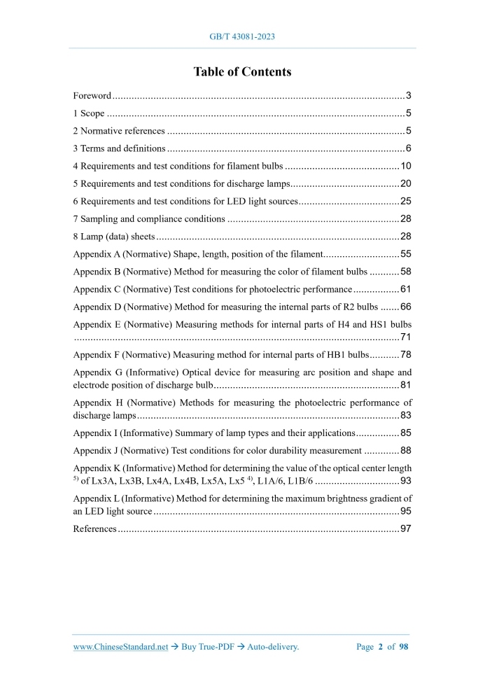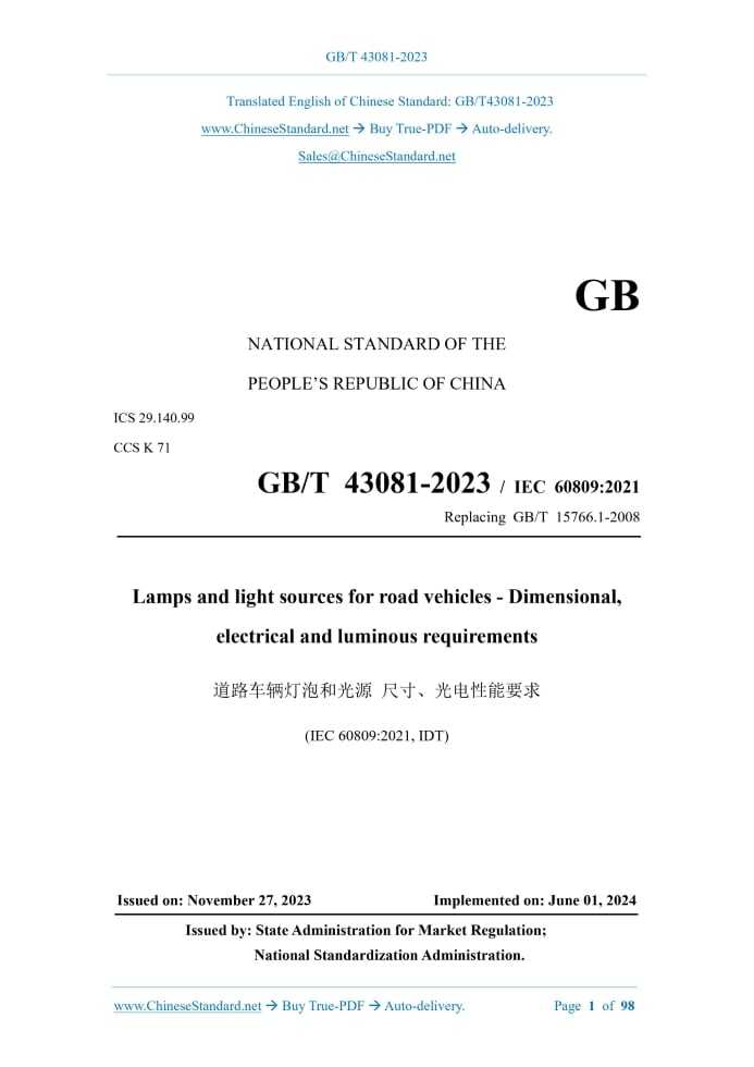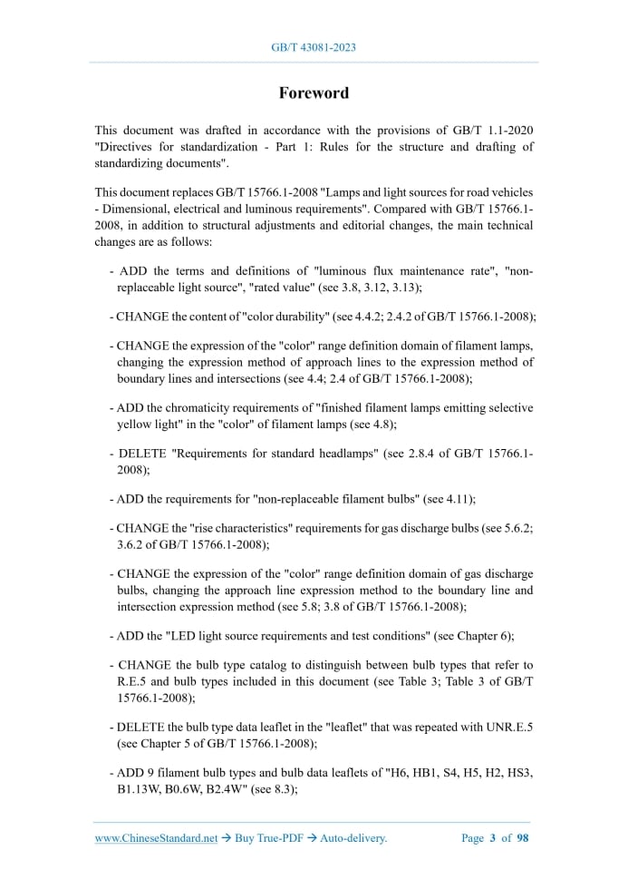 Similar standardsGB/T 43081-2023: Lamps and light sources for road vehicles - Dimensional, electrical and luminous requirements---This is an excerpt. Full copy of true-PDF in English version (including equations, symbols, images, flow-chart, tables, and figures etc.), auto-downloaded/delivered in 9 seconds, can be purchased online: https://www.ChineseStandard.net/PDF.aspx/GBT43081-2023 GB NATIONAL STANDARD OF THE PEOPLE’S REPUBLIC OF CHINA ICS 29.140.99 CCS K 71 GB/T 43081-2023 / IEC 60809:2021 Replacing GB/T 15766.1-2008 Lamps and light sources for road vehicles - Dimensional, electrical and luminous requirements (IEC 60809:2021, IDT) ISSUED ON: NOVEMBER 27, 2023 IMPLEMENTED ON: JUNE 01, 2024 Issued by: State Administration for Market Regulation; National Standardization Administration. Table of ContentsForeword ... 3 1 Scope ... 5 2 Normative references ... 5 3 Terms and definitions ... 6 4 Requirements and test conditions for filament bulbs ... 10 5 Requirements and test conditions for discharge lamps ... 20 6 Requirements and test conditions for LED light sources ... 25 7 Sampling and compliance conditions ... 28 8 Lamp (data) sheets ... 28 Appendix A (Normative) Shape, length, position of the filament... 55 Appendix B (Normative) Method for measuring the color of filament bulbs ... 58 Appendix C (Normative) Test conditions for photoelectric performance ... 61 Appendix D (Normative) Method for measuring the internal parts of R2 bulbs ... 66 Appendix E (Normative) Measuring methods for internal parts of H4 and HS1 bulbs ... 71 Appendix F (Normative) Measuring method for internal parts of HB1 bulbs ... 78 Appendix G (Informative) Optical device for measuring arc position and shape and electrode position of discharge bulb ... 81 Appendix H (Normative) Methods for measuring the photoelectric performance of discharge lamps ... 83 Appendix I (Informative) Summary of lamp types and their applications ... 85 Appendix J (Normative) Test conditions for color durability measurement ... 88 Appendix K (Informative) Method for determining the value of the optical center length 5) of Lx3A, Lx3B, Lx4A, Lx4B, Lx5A, Lx5 4), L1A/6, L1B/6 ... 93 Appendix L (Informative) Method for determining the maximum brightness gradient of an LED light source ... 95 References ... 97ForewordThis document was drafted in accordance with the provisions of GB/T 1.1-2020 "Directives for standardization - Part 1: Rules for the structure and drafting of standardizing documents". This document replaces GB/T 15766.1-2008 "Lamps and light sources for road vehicles - Dimensional, electrical and luminous requirements". Compared with GB/T 15766.1- 2008, in addition to structural adjustments and editorial changes, the main technical changes are as follows: - ADD the terms and definitions of "luminous flux maintenance rate", "non- replaceable light source", "rated value" (see 3.8, 3.12, 3.13); - CHANGE the content of "color durability" (see 4.4.2; 2.4.2 of GB/T 15766.1-2008); - CHANGE the expression of the "color" range definition domain of filament lamps, changing the expression method of approach lines to the expression method of boundary lines and intersections (see 4.4; 2.4 of GB/T 15766.1-2008); - ADD the chromaticity requirements of "finished filament lamps emitting selective yellow light" in the "color" of filament lamps (see 4.8); - DELETE "Requirements for standard headlamps" (see 2.8.4 of GB/T 15766.1- 2008); - ADD the requirements for "non-replaceable filament bulbs" (see 4.11); - CHANGE the "rise characteristics" requirements for gas discharge bulbs (see 5.6.2; 3.6.2 of GB/T 15766.1-2008); - CHANGE the expression of the "color" range definition domain of gas discharge bulbs, changing the approach line expression method to the boundary line and intersection expression method (see 5.8; 3.8 of GB/T 15766.1-2008); - ADD the "LED light source requirements and test conditions" (see Chapter 6); - CHANGE the bulb type catalog to distinguish between bulb types that refer to R.E.5 and bulb types included in this document (see Table 3; Table 3 of GB/T 15766.1-2008); - DELETE the bulb type data leaflet in the "leaflet" that was repeated with UNR.E.5 (see Chapter 5 of GB/T 15766.1-2008); - ADD 9 filament bulb types and bulb data leaflets of "H6, HB1, S4, H5, H2, HS3, B1.13W, B0.6W, B2.4W" (see 8.3); Lamps and light sources for road vehicles - Dimensional, electrical and luminous requirements1 ScopeThis document applies to electric light sources in road vehicle lighting devices and/or light signal devices (see Note 1). It is particularly applicable to light sources listed in UN Resolution R.E.5 and light sources subject to other regulations. This document specifies the technical requirements for interchangeability, including dimensions, optoelectronic performance, as well as corresponding measurement methods. For the light sources listed in this document, their leaflets are either included in this document or refer to UN Resolution R.E.5. IEC 60810 specifies requirements for light source life, torsion strength, vibration and impact resistance. IEC 60983 specifies small road motor vehicle bulbs for auxiliary purposes that are not covered by regulations. Note 1: In this document, the terms "bulb" and "light source" refer to the same product, as these two terms are interchangeable in this document. Note 2: In different vocabularies and standards, different terms are used for "incandescent lamp" (845-07-04 in GB/T 2900.65-2004), "discharge lamp" (845-07-17 in GB/T 2900.65- 2004), "LED lamp". In this document, "filament lamp", "discharge lamp", "LED light source" are used. However, when only "lamp" and "light source" are written, it refers to lamps of these three technologies, unless the context clearly indicates that it is used to refer to lamps of a certain technology only. In UN regulations, the term "light source" is used for products specified in this document. Note 3: "Device" in this document refers to equipment used for lightin