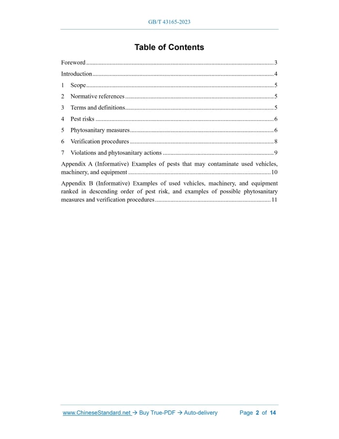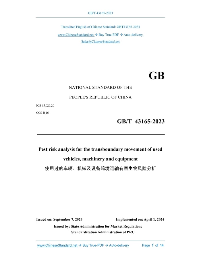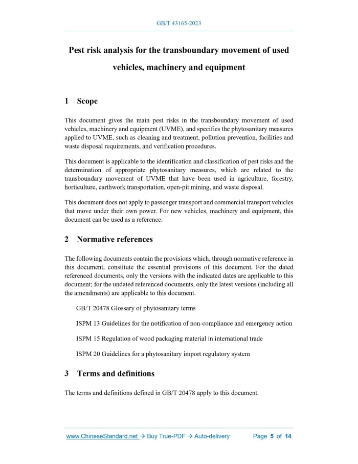 Similar standardsGB/T 43165-2023: Pest risk analysis for the transboundary movement of used vehicles, machinery and equipment---This is an excerpt. Full copy of true-PDF in English version (including equations, symbols, images, flow-chart, tables, and figures etc.), auto-downloaded/delivered in 9 seconds, can be purchased online: https://www.ChineseStandard.net/PDF.aspx/GBT43165-2023 GB NATIONAL STANDARD OF THE PEOPLE'S REPUBLIC OF CHINA ICS 65.020.20 CCS B 16 Pest risk analysis for the transboundary movement of used vehicles, machinery and equipment ISSUED ON: SEPTEMBER 7, 2023 IMPLEMENTED ON: APRIL 1, 2024 Issued by: State Administration for Market Regulation; Standardization Administration of PRC. Table of ContentsForeword ... 3 Introduction ... 4 1 Scope ... 5 2 Normative references ... 5 3 Terms and definitions ... 5 4 Pest risks ... 6 5 Phytosanitary measures ... 6 6 Verification procedures ... 8 7 Violations and phytosanitary actions ... 9 Appendix A (Informative) Examples of pests that may contaminate used vehicles, machinery, and equipment ... 10 Appendix B (Informative) Examples of used vehicles, machinery, and equipment ranked in descending order of pest risk, and examples of possible phytosanitary measures and verification procedures ... 11 Pest risk analysis for the transboundary movement of used vehicles, machinery and equipment1 ScopeThis document gives the main pest risks in the transboundary movement of used vehicles, machinery and equipment (UVME), and specifies the phytosanitary measures applied to UVME, such as cleaning and treatment, pollution prevention, facilities and waste disposal requirements, and verification procedures. This document is applicable to the identification and classification of pest risks and the determination of appropriate phytosanitary measures, which are related to the transboundary movement of UVME that have been used in agriculture, forestry, horticulture, earthwork transportation, open-pit mining, and waste disposal. This document does not apply to passenger transport and commercial transport vehicles that move under their own power. For new vehicles, machinery and equipment, this document can be used as a reference.2 Normative referencesThe following documents contain the provisions which, through normative reference in this document, constitute the essential provisions of this document. For the dated referenced documents, only the versions with the indicated dates are applicable to this document; for the undated referenced documents, only the latest versions (including all the amendments) are applicable to this document. GB/T 20478 Glossary of phytosanitary terms ISPM 13 Guidelines for the notification of non-compliance and emergency action ISPM 15 Regulation of wood packaging material in international trade ISPM 20 Guidelines for a phytosanitary import regulatory system3 Terms and definitionsThe terms and definitions defined in GB/T 20478 apply to this document.4 Pest risks4.1 Main pest risks The main pest risks associated with UVME are contamination of soil, pests, plant debris, seeds, and other plant parts capable of reproduction. Since plants themselves can become pests or potentially harbor pests, seeds and other plant organs capable of reproduction are of great concern. Pests with stress resistance or dormant growth stages that can survive transport to threatened areas are of particular concern. See Appendix A for examples of pests that may contaminate UVME. The pest risk of UVME contaminants is difficult to assess. Therefore, the usual procedures of conducting a pest risk analysis to determine the need for phytosanitary measures and the intensity of these measures may not be applicable. For this reason, in order to reduce the risk of the introduction and spread of quarantine pests, UVME transported across borders needs to be free of contaminants in accordance with this document. 4.2 Elements of pest risk classification The following elements of UVME can influence the level of pest risk: -- Moving distance: UVME used immediately after short-distance cross-border movement by its own power has a low pest risk; -- Type: UVME with complex structure has more areas that may be contaminated; -- Original and earlier uses: UVME used in farms, farmland, forests, close to vegetation, or transporting organic matter is more susceptible to contamination; -- Storage: UVME stored outdoors and near vegetation or lights that attract insects is more susceptible to contamination; -- Intended location or use: UVME that will be used in agricultural areas, forests, or close to vegetation is more likely to provide pathways for the introduction of pests. Examples of UVME ranked in descending order of pest risk and examples of possible phytosanitary measures and verification procedures are provided in Appendix B.5 Phytosanitary measures5.1 Basic requirements UVME transported across borders shall be pollution-free. 5.4 Facilities and waste disposal requirements The type of equipment and facility characteristics necessary for UVME cleaning and treatment depend on the location where these procedures are employed. Inspection, cleaning, and treatment usually occur when the exporting country fulfills the phytosanitary import requirements of the destination country. Because contamination may be of local origin, facilities in the exporting country do not need elaborate solid waste and wastewater management systems. Facilities required for UVME inspection, cleaning, and treatment include: -- Countertops that prevent contact with soil, including soil traps and wastewater management systems; -- Temperature treatment facilities; -- Fumigation and chemical treatment facilities. Disposal of soil and contaminated cleaning water must comply with environmental requirements. Containment and disposal methods shall be adequate to prevent the spread of pests and may include soil traps, bagging, deep burial, incineration, fumigation, chemical treatments, composting, and wastewate