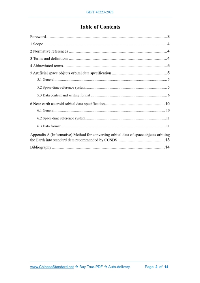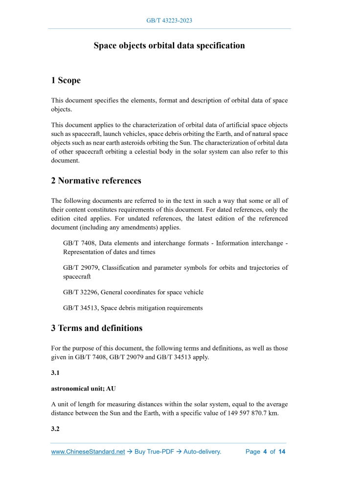 Similar standardsGB/T 43223-2023: Space objects orbital data specification---This is an excerpt. Full copy of true-PDF in English version (including equations, symbols, images, flow-chart, tables, and figures etc.), auto-downloaded/delivered in 9 seconds, can be purchased online: https://www.ChineseStandard.net/PDF.aspx/GBT43223-2023GB NATIONAL STANDARD OF THE PEOPLE’S REPUBLIC OF CHINA ICS 49.140 CCS V 70 Space objects orbital data specification ISSUED ON: SEPTEMBER 07, 2023 IMPLEMENTED ON: JANUARY 01, 2024 Issued by: State Administration for Market Regulation; Standardization Administration of the People’s Republic of China. Table of ContentsForeword ... 3 1 Scope ... 4 2 Normative references ... 4 3 Terms and definitions ... 4 4 Abbreviated terms ... 5 5 Artificial space objects orbital data specification ... 5 5.1 General ... 5 5.2 Space-time reference system ... 5 5.3 Data content and writing format ... 6 6 Near earth asteroid orbital data specification ... 10 6.1 General ... 10 6.2 Space-time reference system ... 11 6.3 Data format ... 11 Appendix A (Informative) Method for converting orbital data of space objects orbiting the Earth into standard data recommended by CCSDS ... 13 Bibliography ... 14 Space objects orbital data specification1 ScopeThis document specifies the elements, format and description of orbital data of space objects. This document applies to the characterization of orbital data of artificial space objects such as spacecraft, launch vehicles, space debris orbiting the Earth, and of natural space objects such as near earth asteroids orbiting the Sun. The characterization of orbital data of other spacecraft orbiting a celestial body in the solar system can also refer to this document.2 Normative referencesThe following documents are referred to in the text in such a way that some or all of their content constitutes requirements of this document. For dated references, only the edition cited applies. For undated references, the latest edition of the referenced document (including any amendments) applies. GB/T 7408, Data elements and interchange formats - Information interchange - Representation of dates and times GB/T 29079, Classification and parameter symbols for orbits and trajectories of spacecraft GB/T 32296, General coordinates for space vehicle GB/T 34513, Space debris mitigation requirements3 Terms and definitionsFor the purpose of this document, the following terms and definitions, as well as those given in GB/T 7408, GB/T 29079 and GB/T 34513 apply. 3.1 astronomical unit; AU A unit of length for measuring distances within the solar system, equal to the average distance between the Sun and the Earth, with a specific value of 149 597 870.7 km. 3.2 near earth asteroid; NEA Asteroids orbiting the Sun in the solar system, whose perihelion is within 1.3 astronomical units of the heliocenter.4 Abbreviated termsFor the purposes of this document, the following abbreviated terms apply. CCSDS: Consultative Committee for Space Data Systems GCRS: Geocentric Celestial Reference System IAU: International Astronomical Union ICRS: International Celestial Reference System MPC: Minor Planet Center OEM: Orbit Element Message OMM: Orbit Mean-element Message OPM: Orbit Parameter Message UTC: Coordinated Universal Time5 Artificial space objects orbital data specification5.1 General The artificial space objects orbital data is used to describe the state parameters of the orbit of the corresponding artificial space objects around a certain central celestial body, usually including orbital data and related dynamic parameters. 5.2 Space-time reference system The time reference system uses UTC; the space reference system is defined according to GB/T 32296 and is based on ICRS: the coordinate origin is the center of mass of the central gravitational body, and the coordinate plane and coordinate axis point in the same direction as ICRS. Note: Taking an artificial space object orbiting the Earth as an example, the corresponding coordinate system is GCRS. For the calculation of parameters such as precession and nutation related to the coordinate system, it is recommended to use the IAU1980 and newer models.Appendix A(Informative) Method for converting orbital data of space objects orbiting the Earth into standard data recommended by CCSDS A.1 General CCSDS provides three recommended orbital data standards: OEM, OPM, and OMM. The conversion methods between the orbital data format specified in this document and the OEM and OPM data formats are shown in A.2 and A.3 respectively. A.2 Conversion with OPM In OPM, EME2000 is used to represent the celestial coordinate system of the J2000.0 epoch. The orbital elements can be directly obtained by coordinate transformation using the data in this document. The difference is that in OPM, atmospheric drag and solar radiation pressure are represented by the drag coefficient/radiation pressure coefficient and the effective area, respectively, but the effective area can be calculated by giving the mass of the object and the drag coefficient. OPM data is usually for spacecraft that are effectively operating on orbit, so there is a reference value for mass. A.3 Conversion with OEM OEM is the orbital ephemeris information. The user of this document only needs to convert the six Kepler orbit elements into position and velocity vectors in the corresponding coordinate system or directly use the ephemeris data. In addition, this document provides covariance data as optional data, and its format is consistent with OEM. ......Source: Above contents are excerpted from the full-copy PDF -- translated/reviewed by: www.ChineseStandard.net / Wayne Zheng et al. Tips & Frequently Asked Questions:Question 1: How long will the true-PDF of English version of GB/T 43223-2023 be delivered?Answer: The full copy PDF of English version of GB/T 43223-2023 can be downloaded in 9 seconds, and it will also be emailed to you in 9 seconds (double mechanisms to ensure the delivery
