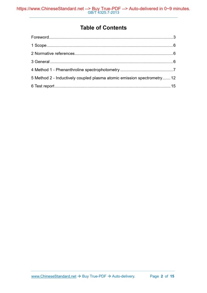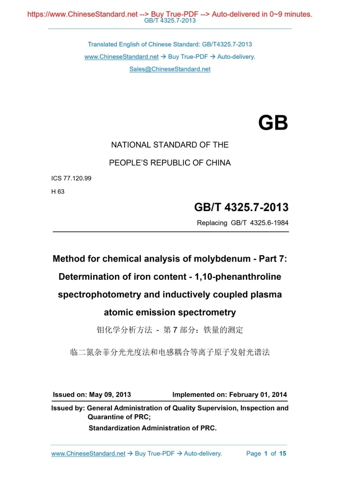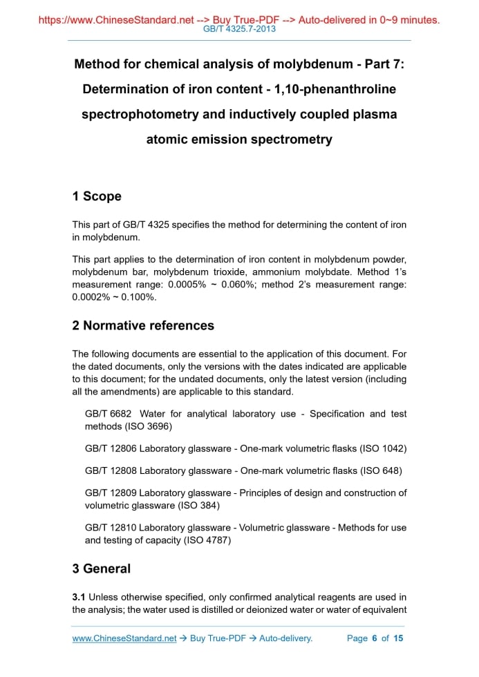 Similar standardsGB/T 4325.7-2013: Methods for chemical analysis of molybdenum - Part 7: Determination of iron content - 1,10-phenanthroline spectrophotometry and inductively coupled plasma atomic emission spectrometry---This is an excerpt. Full copy of true-PDF in English version (including equations, symbols, images, flow-chart, tables, and figures etc.), auto-downloaded/delivered in 9 seconds, can be purchased online: https://www.ChineseStandard.net/PDF.aspx/GBT4325.7-2013 GB NATIONAL STANDARD OF THE PEOPLE’S REPUBLIC OF CHINA ICS 77.120.99 H 63 Replacing GB/T 4325.6-1984 Method for chemical analysis of molybdenum - Part 7: Determination of iron content - 1,10-phenanthroline spectrophotometry and inductively coupled plasma atomic emission spectrometry ISSUED ON: MAY 09, 2013 IMPLEMENTED ON: FEBRUARY 01, 2014 Issued by: General Administration of Quality Supervision, Inspection and Quarantine of PRC; Standardization Administration of PRC. Table of ContentsForeword ... 3 1 Scope ... 6 2 Normative references ... 6 3 General ... 6 4 Method 1 - Phenanthroline spectrophotometry ... 7 5 Method 2 - Inductively coupled plasma atomic emission spectrometry ... 12 6 Test report ... 15 Method for chemical analysis of molybdenum - Part 7: Determination of iron content - 1,10-phenanthroline spectrophotometry and inductively coupled plasma atomic emission spectrometry1 ScopeThis part of GB/T 4325 specifies the method for determining the content of iron in molybdenum. This part applies to the determination of iron content in molybdenum powder, molybdenum bar, molybdenum trioxide, ammonium molybdate. Method 1’s measurement range: 0.0005% ~ 0.060%; method 2’s measurement range: 0.0002% ~ 0.100%.2 Normative referencesThe following documents are essential to the application of this document. For the dated documents, only the versions with the dates indicated are applicable to this document; for the undated documents, only the latest version (including all the amendments) are applicable to this standard. GB/T 6682 Water for analytical laboratory use - Specification and test methods (ISO 3696) GB/T 12806 Laboratory glassware - One-mark volumetric flasks (ISO 1042) GB/T 12808 Laboratory glassware - One-mark volumetric flasks (ISO 648) GB/T 12809 Laboratory glassware - Principles of design and construction of volumetric glassware (ISO 384) GB/T 12810 Laboratory glassware - Volumetric glassware - Methods for use and testing of capacity (ISO 4787)3 General3.1 Unless otherwise specified, only confirmed analytical reagents are used in the analysis; the water used is distilled or deionized water or water of equivalent 3 g of potassium iodide; after dissolving, use quick quantitative filter paper to filter in a separatory funnel; use water to dilute it to 500 mL; add 20 mL ~ 30 mL of trichloromethane (4.2.5); oscillate for 2 minutes; stand still for stratification; discard the organic phase; use trichloromethane (4.2.5) to repeatedly extract the water until the organic phase is colorless; put the water phase into the reagent bottle to prepare for use. 4.2.12 Citric acid solution (500 g/L). The purification steps are as follows: Weigh 250 g of citric acid; place it in a 1000 mL beaker; add 200 mL of water to dissolve it; use ammonia (4.2.4) to adjust to pH 7 (check with pH test paper); add 2.5 mL of sodium perchlorate solution (4.2.8), 2 g of hydroxylamine hydrochloride, 20 mL of o-phenanthroline solution (4.2.10); heat to boil it; cool it down; add 3 g of potassium iodide; after dissolving, use quick quantitative filter paper to filter it in a separatory funnel; use water to dilute it to 500 mL; use trichloromethane (4.2.5) to make extraction several times (20 mL each time, shaking for 2 min), until the organic phase is colorless; discard the organic phase; put the aqueous phase in the reagent bottle to prepare for use. 4.2.13 Citric acid-ammonia mixed solution: Pipette 150 mL of citric acid solution (4.2.12), 80 mL of ammonia (4.2.4), 70 mL of water; mix well to prepare for use. 4.2.14 Potassium iodide solution (300 g/L): Weigh 150 g of potassium iodide (excellent grade pure); place it in a 1000 mL beaker; add 400 mL of water to dissolve it; use ammonia (4.2.4) to adjust to pH 7 (check with pH test paper); add 15 mL of hydroxylamine hydrochloride solution (4.2.15); use water to dilute it to 500 mL; mix well to prepare for use. 4.2.15 Hydroxylamine hydrochloride solution (200 g/L). The purification steps are as follows: Weigh 50 g of hydroxylamine hydrochloride; place it in a 500 mL beaker; add 150 mL of water to dissolve it; use ammonia (4.2.4) to adjust to pH 7 (check with pH test paper); add 20 mL of phenanthroline solution (4.2.10); heat to boiling; cool it down; add 3 g of potassium iodide; after dissolving, use water to transfer to a separatory funnel and dilute to a volume of 250 mL; trichloromethane (4.2.5) to make extraction several times (20 mL each time, shaking for 2 min), until the organic phase is colorless; discard the organic phase; put the aqueous phase in the reagent bottle to prepare for use. 4.2.16 Disodium ethylenediaminetetraacetic acid (EDTA) solution (100 g/L): Weigh 10 g of EDTA (excellent grade pure); put it in a 250 mL beaker; add 90 mL of water and heat (50 °C ~ 60 °C) to dissolve; use ammonia water (4.2.4) to adjust to pH 7 (check with pH test paper); use water to dilute it to 100 mL; mix it uniformly to prepare for use. 4.2.17 Buffer solution: Pipette 100 mL of acetic acid (1 mol/L) and 100 mL of ammonia (1 mol/L); mix it uniformly to prepare for use. 70 mL; add 10 mL of trichloromethane (4.2.5); shake for 1 min; stand for stratification; put the organic phase into a dry 25 mL colorimetric tube; shake with 5 mL of trichloromethane (4.2.5) for 1 min; combine the organic phases in the colorimetric tube; add a small amount of anhydrous sodium sulfate (4.2.1); mix well. 4.5.4.1.4 Transfer part of the solution into a 1 cm cuvette; use trichloromethane (4.2.5) as a reference, to measu