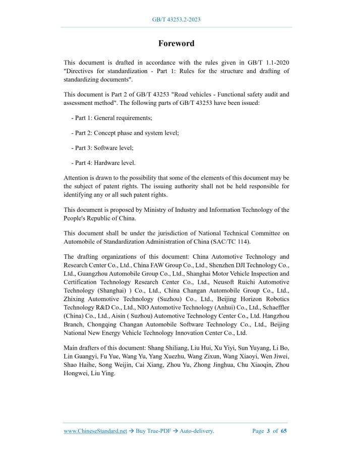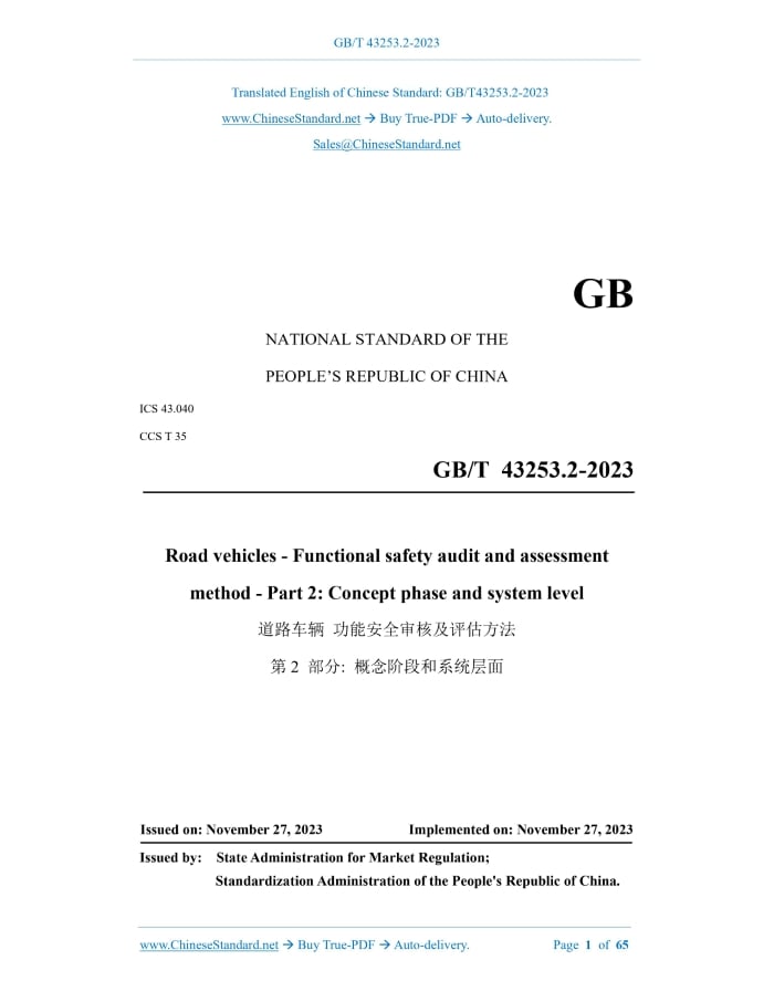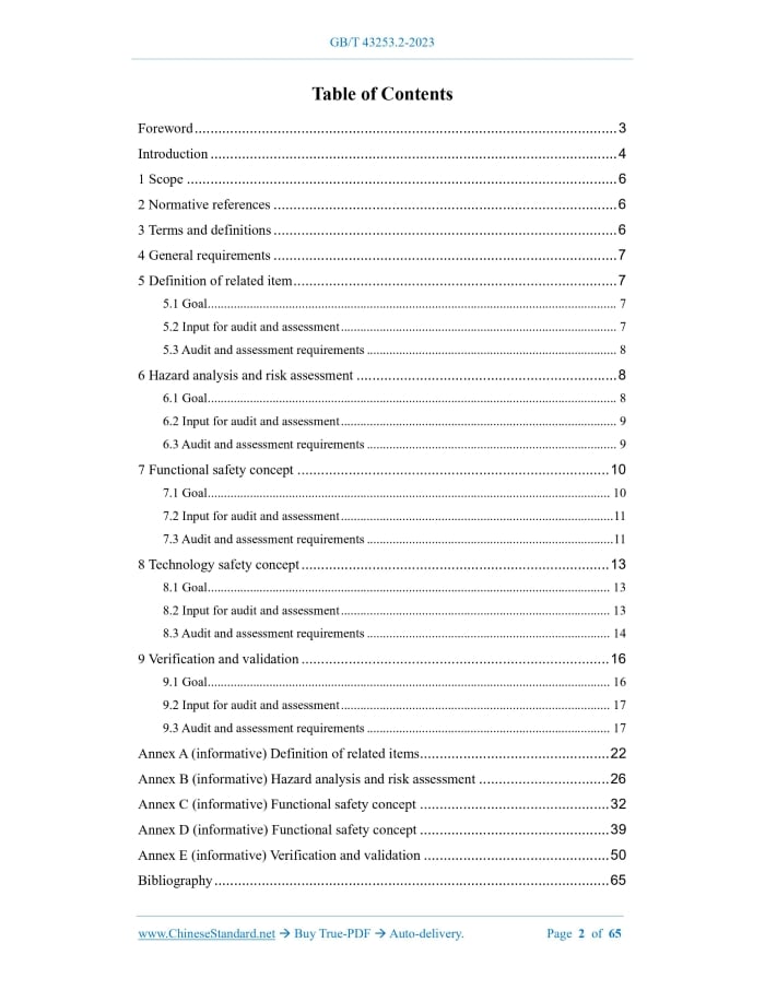 Similar standardsGB/T 43253.2-2023: Road vehicles - Functional safety audit and assessment method - Part 2: Concept phase and system level---This is an excerpt. Full copy of true-PDF in English version (including equations, symbols, images, flow-chart, tables, and figures etc.), auto-downloaded/delivered in 9 seconds, can be purchased online: https://www.ChineseStandard.net/PDF.aspx/GBT43253.2-2023 GB NATIONAL STANDARD OF THE PEOPLE’S REPUBLIC OF CHINA ICS 43.040 CCS T 35 Road vehicles - Functional safety audit and assessment method - Part 2.Concept phase and system level Issued on. NOVEMBER 27, 2023 Implemented on. NOVEMBER 27, 2023 Issued by. State Administration for Market Regulation; Standardization Administration of the People's Republic of China. Table of ContentsForeword... 3 Introduction... 4 1 Scope... 6 2 Normative references... 6 3 Terms and definitions... 6 4 General requirements... 7 5 Definition of related item... 7 5.1 Goal... 7 5.2 Input for audit and assessment... 7 5.3 Audit and assessment requirements... 8 6 Hazard analysis and risk assessment... 8 6.1 Goal... 8 6.2 Input for audit and assessment... 9 6.3 Audit and assessment requirements... 9 7 Functional safety concept... 10 7.1 Goal... 10 7.2 Input for audit and assessment... 11 7.3 Audit and assessment requirements... 11 8 Technology safety concept... 13 8.1 Goal... 13 8.2 Input for audit and assessment... 13 8.3 Audit and assessment requirements... 14 9 Verification and validation... 16 9.1 Goal... 16 9.2 Input for audit and assessment... 17 9.3 Audit and assessment requirements... 17 Annex A (informative) Definition of related items... 22 Annex B (informative) Hazard analysis and risk assessment... 26 Annex C (informative) Functional safety concept... 32 Annex D (informative) Functional safety concept... 39 Annex E (informative) Verification and validation... 50 Bibliography... 65ForewordThis document is drafted in accordance with the rules given in GB/T 1.1-2020 "Directives for standardization - Part 1.Rules for the structure and drafting of standardizing documents". This document is Part 2 of GB/T 43253 "Road vehicles - Functional safety audit and assessment method". The following parts of GB/T 43253 have been issued. - Part 1.General requirements; - Part 2.Concept phase and system level; - Part 3.Software level; - Part 4.Hardware level. Attention is drawn to the possibility that some of the elements of this document may be the subject of patent rights. The issuing authority shall not be held responsible for identifying any or all such patent rights. This document is proposed by Ministry of Industry and Information Technology of the People's Republic of China. This document shall be under the jurisdiction of National Technical Committee on Automobile of Standardization Administration of China (SAC/TC 114). The drafting organizations of this document. China Automotive Technology and Research Center Co., Ltd., China FAW Group Co., Ltd., Shenzhen DJI Technology Co., Ltd., Guangzhou Automobile Group Co., Ltd., Shanghai Motor Vehicle Inspection and Certification Technology Research Center Co., Ltd., Neusoft Ruichi Automotive Technology (Shanghai)) Co., Ltd., China Changan Automobile Group Co., Ltd., Zhixing Automotive Technology (Suzhou) Co., Ltd., Beijing Horizon Robotics Technology R&D Co., Ltd., NIO Automotive Technology (Anhui) Co., Ltd., Schaeffler (China) Co., Ltd., Aisin (Suzhou) Automotive Technology Center Co., Ltd. Hangzhou Branch, Chongqing Changan Automobile Software Technology Co., Ltd., Beijing National New Energy Vehicle Technology Innovation Center Co., Ltd. Main drafters of this document. Shang Shiliang, Liu Hui, Xu Yiyi, Sun Yuyang, Li Bo, Lin Guangyi, Fu Yue, Wang Yu, Yang Xuezhu, Wang Zixun, Wang Xiaoyi, Wen Jiwei, Shao Haihe, Song Weijin, Cai Xiang, Zhou Yu, Zhong Jinghua, Chu Xiaoqin, Zhou Hongwei, Liu Ying.1 ScopeThis document specifies the requirements and methods for carrying out functional safety audits and assessments of functional safety-related activities and work results at the concept stage and system level of safety-related electrical/electronic (E/E) systems, so as to inspect and judge the development process and conformity of work products with respect to functional safety. This document applies to safety-related systems containing one or more electrical/electronic (E/E) systems installed on production road vehicles other than mopeds. This document does not apply to specific electrical/electronic (E/E) systems on special purpose vehicles, for example, vehicle systems designed for disabled drivers.2 Normative referencesThe following referenced documents are indispensable for the application of this document. For dated references, only the edition cited applies. For undated references, the latest edition of the referenced document (including any amendments) applies. GB/T 34590.1~34590.12-2022, Road vehicles -- Functional safety -- Part 1. Vocabulary GB/T 43253.1-2023, Road vehicles -- Functional safety audit and assessment method -- Part 1.General requirements GB/T 43253.3-2023, Road vehicles -- Functional safety audit and assessment method -- Part 3.Software level GB/T 43253.4-2023, Road vehicles -- Functional safety audit and assessment method -- Part 4.Hardware level3 Terms and definitionsFor the purposes of this document, the terms and definitions defined in GB/T 34590.1- 2022 apply.4 General requirementsThe audit and assessment requirements defined in GB/T 43253.1-2023 apply to this document. Functional safety audits and assessments at the conceptual stage and system level mainly involve the following contents.5 Definition of related item5.1 Goal The goal of this chapter is to audit and assess the definition documents of relevant items as functional safety development objects, so as to check whether their definitions are accurate and sufficient to support subsequent functional safety activities. 5.2 Input for audit and assessment To carry out the audit and assessment process sp