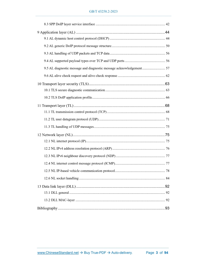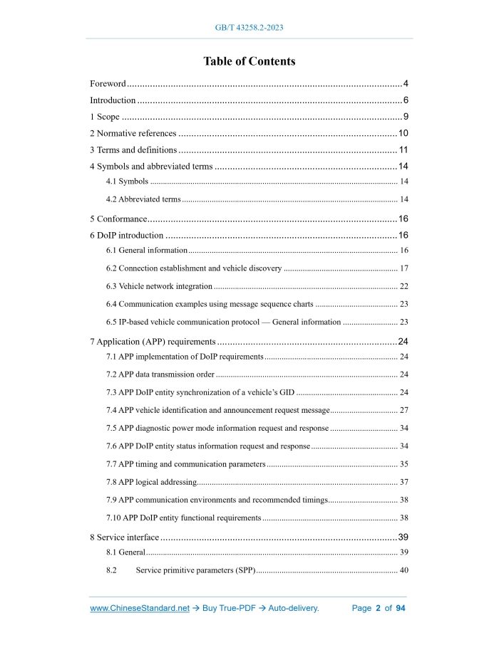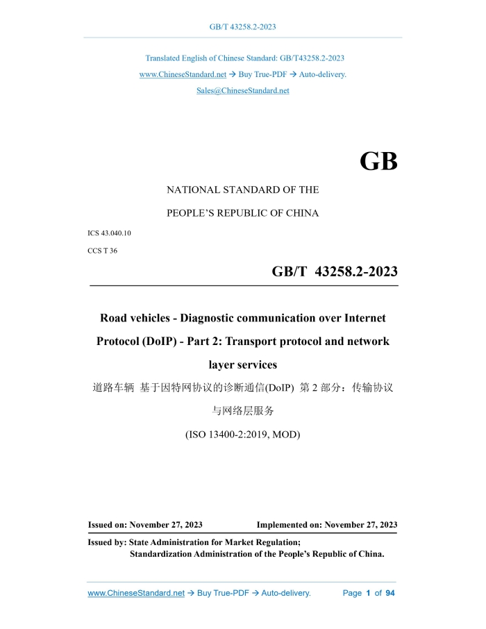 Similar standardsGB/T 43258.2-2023: Road vehicles - Diagnostic communication over Internet Protocol (DoIP) - Part 2: Transport protocol and network layer services---This is an excerpt. Full copy of true-PDF in English version (including equations, symbols, images, flow-chart, tables, and figures etc.), auto-downloaded/delivered in 9 seconds, can be purchased online: https://www.ChineseStandard.net/PDF.aspx/GBT43258.2-2023 GB NATIONAL STANDARD OF THE PEOPLE’S REPUBLIC OF CHINA ICS 43.040.10 CCS T 36 Road vehicles - Diagnostic communication over Internet Protocol (DoIP) - Part 2.Transport protocol and network layer services (ISO 13400-2.2019, MOD) Issued on. NOVEMBER 27, 2023 Implemented on. NOVEMBER 27, 2023 Issued by. State Administration for Market Regulation; Standardization Administration of the People’s Republic of China. Table of ContentsForeword... 4 Introduction... 6 1 Scope... 9 2 Normative references... 10 3 Terms and definitions... 11 4 Symbols and abbreviated terms... 14 4.1 Symbols... 14 4.2 Abbreviated terms... 14 5 Conformance... 16 6 DoIP introduction... 16 6.1 General information... 16 6.2 Connection establishment and vehicle discovery... 17 6.3 Vehicle network integration... 22 6.4 Communication examples using message sequence charts... 23 6.5 IP-based vehicle communication protocol — General information... 23 7 Application (APP) requirements... 24 7.1 APP implementation of DoIP requirements... 24 7.2 APP data transmission order... 24 7.3 APP DoIP entity synchronization of a vehicle’s GID... 24 7.4 APP vehicle identification and announcement request message... 27 7.5 APP diagnostic power mode information request and response... 34 7.6 APP DoIP entity status information request and response... 34 7.7 APP timing and communication parameters... 35 7.8 APP logical addressing... 37 7.9 APP communication environments and recommended timings... 38 7.10 APP DoIP entity functional requirements... 38 8 Service interface... 39 8.1 General... 39 8.2 Service primitive parameters (SPP)... 40 8.3 SPP DoIP layer service interface... 42 9 Application layer (AL)... 44 9.1 AL dynamic host control protocol (DHCP)... 44 9.2 AL generic DoIP protocol message structure... 50 9.3 AL handling of UDP packets and TCP data... 56 9.4 AL supported payload types over TCP and UDP ports... 56 9.5 AL diagnostic message and diagnostic message acknowledgement... 57 9.6 AL alive check request and alive check response... 62 10 Transport layer security (TLS)... 63 10.1 TLS secure diagnostic communication... 63 10.2 TLS DoIP application profile... 66 11 Transport layer (TL)... 68 11.1 TL transmission control protocol (TCP)... 68 11.2 TL user datagram protocol (UDP)... 71 11.3 TL handling of UDP messages... 75 12 Network layer (NL)... 75 12.1 NL internet protocol (IP)... 75 12.2 NL IPv4 address resolution protocol (ARP)... 76 12.3 NL IPv6 neighbour discovery protocol (NDP)... 77 12.4 NL internet control message protocol (ICMP)... 77 12.5 NL IP-based vehicle communication protocol... 78 12.6 NL socket handling... 84 13 Data link layer (DLL)... 92 13.1 DLL general... 92 13.2 DLL MAC-layer... 92 Bibliography... 93ForewordThis document is drafted in accordance with the rules provided in GB/T 1.1-2020 Directives for standardization - Part 1.Rules for the structure and drafting of standardizing documents. This document is part 2 of GB/T 43258 Road vehicles - Diagnostic communication over Internet Protocol (DoIP). The following parts have been issued for GB/T 43258. — Part 2.Transport protocol and network layer services; — Part 3.Wired vehicle interface based on IEEE 802.3; — Part 4.Ethernet-based high-speed data link connector. This document adopts ISO 13400-2.2019 Road vehicles - Diagnostic communication over Internet Protocol (DoIP) - Part 2.Transport protocol and network layer services by modification. The technical differences between this document and ISO 13400-2.2019, and the causes for these differences are as follows. — USE the normatively referenced GB 16735 to replace ISO 3779 (see Table 4 and Table 5), to adapt to the technical conditions in China and to improve operability; — ADD the symbol < k> (see 4.1), to improve the usability of the document; — ADD the abbreviated terms AutoIP, PDU and OTA, and DELETE the unused abbreviated term FMI (see 4.2), to improve the usability of the document; — CHANGE “the DoIP entity has an IP address configured in approximately two seconds” to “the DoIP entity has an IP address configured in approximately seven seconds”, and CHANGE “an IP address is configured after approximately seven seconds” to “an IP address is configured after approximately two seconds” (see 9.1.2.2), so that the timing parameters are consistent with those in Table 15; — CHANGE “node management (××1616)” to “0×××16” (see 9.2), to adapt to the technical conditions in China and improve the operability; — CHANGE “Response by the DoIP gateway” to “Response by the DoIP entity” (see Table 48), to improve the technical application flexibility. Please note that some of the contents of this document may involve patents. The issuing organization of this document is not responsible for identifying patents. This document was proposed by the Ministry of Industry and Information Technology of the People's Republic of China. This document shall be under the jurisdiction of National Technical Committee of Auto Standardization (SAC/TC 114). Drafting organizations of this document. Pan Asia Technical Automotive Center Co., Ltd., China Automotive Technology and Research Center Co., Ltd., Neusoft Group (Dalian) Ltd., Nanjing Forestry University, ZEEKR (Ningbo Hangzhou Bay New Area) Co., Ltd., Dongfeng Motor Corporation Technical Center, Great Wall Motor Company Limited, CATARC (Tianjin) Automotive Engineering Research Institute Co., Ltd., Beijing National New Energy Vehicle Technology Innovation Center Co., Ltd., SAIC MAXUS Automotive Co., Ltd., China Automoti