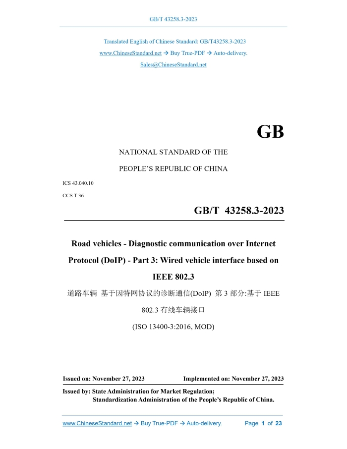 GB/T 43258.3-2023: Road vehicles - Diagnostic communication over Internet Protocol (DoIP) - Part 3: Wired vehicle interface based on IEEE 802.3 Delivery: 9 seconds. True-PDF full-copy in English & invoice will be downloaded + auto-delivered via email. See step-by-step procedure Status: Valid