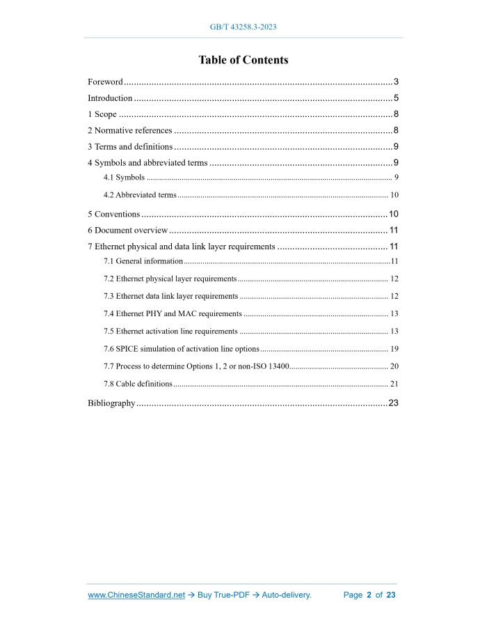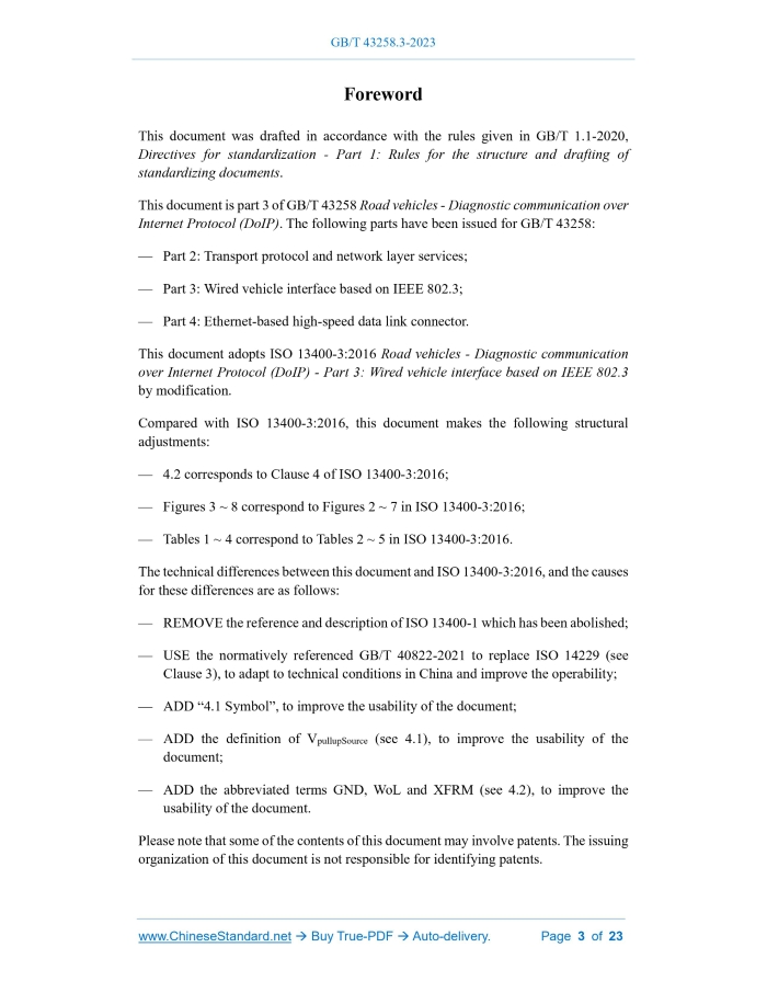 Similar standardsGB/T 43258.3-2023: Road vehicles - Diagnostic communication over Internet Protocol (DoIP) - Part 3: Wired vehicle interface based on IEEE 802.3---This is an excerpt. Full copy of true-PDF in English version (including equations, symbols, images, flow-chart, tables, and figures etc.), auto-downloaded/delivered in 9 seconds, can be purchased online: https://www.ChineseStandard.net/PDF.aspx/GBT43258.3-2023 GB NATIONAL STANDARD OF THE PEOPLE’S REPUBLIC OF CHINA ICS 43.040.10 CCS T 36 Road vehicles - Diagnostic communication over Internet Protocol (DoIP) - Part 3: Wired vehicle interface based on IEEE 802.3 (ISO 13400-3:2016, MOD) ISSUED ON: NOVEMBER 27, 2023 IMPLEMENTED ON: NOVEMBER 27, 2023 Issued by: State Administration for Market Regulation; Standardization Administration of the People’s Republic of China. Table of ContentsForeword ... 3 Introduction ... 5 1 Scope ... 8 2 Normative references ... 8 3 Terms and definitions ... 9 4 Symbols and abbreviated terms ... 9 4.1 Symbols ... 9 4.2 Abbreviated terms ... 10 5 Conventions ... 10 6 Document overview ... 11 7 Ethernet physical and data link layer requirements ... 11 7.1 General information ... 11 7.2 Ethernet physical layer requirements ... 12 7.3 Ethernet data link layer requirements ... 12 7.4 Ethernet PHY and MAC requirements ... 13 7.5 Ethernet activation line requirements ... 13 7.6 SPICE simulation of activation line options ... 19 7.7 Process to determine Options 1, 2 or non-ISO 13400 ... 20 7.8 Cable definitions ... 21 Bibliography ... 23ForewordThis document was drafted in accordance with the rules given in GB/T 1.1-2020, Directives for standardization - Part 1: Rules for the structure and drafting of standardizing documents. This document is part 3 of GB/T 43258 Road vehicles - Diagnostic communication over Internet Protocol (DoIP). The following parts have been issued for GB/T 43258: — Part 2: Transport protocol and network layer services; — Part 3: Wired vehicle interface based on IEEE 802.3; — Part 4: Ethernet-based high-speed data link connector. This document adopts ISO 13400-3:2016 Road vehicles - Diagnostic communication over Internet Protocol (DoIP) - Part 3: Wired vehicle interface based on IEEE 802.3 by modification. Compared with ISO 13400-3:2016, this document makes the following structural adjustments: — 4.2 corresponds to Clause 4 of ISO 13400-3:2016; — Figures 3 ~ 8 correspond to Figures 2 ~ 7 in ISO 13400-3:2016; — Tables 1 ~ 4 correspond to Tables 2 ~ 5 in ISO 13400-3:2016. The technical differences between this document and ISO 13400-3:2016, and the causes for these differences are as follows: — REMOVE the reference and description of ISO 13400-1 which has been abolished; — USE the normatively referenced GB/T 40822-2021 to replace ISO 14229 (see Clause 3), to adapt to technical conditions in China and improve the operability; — ADD “4.1 Symbol”, to improve the usability of the document; — ADD the definition of VpullupSource (see 4.1), to improve the usability of the document; — ADD the abbreviated terms GND, WoL and XFRM (see 4.2), to improve the usability of the document. Please note that some of the contents of this document may involve patents. The issuing organization of this document is not responsible for identifying patents. Road vehicles - Diagnostic communication over Internet Protocol (DoIP) - Part 3: Wired vehicle interface based on IEEE 802.31 ScopeThis document specifies the vehicle communication interface and test equipment requirements for a physical and data link layer based on IEEE 802.3 100BASE-TX. This document applies to the design for the physical and data link layer in vehicle communication interface and test equipment based on IEEE 802.3 100BASE-TX. This interface serves as the physical basis for IP-based communication between the vehicle and test equipment. This document specifies the following aspects: — requirements for signal and wiring schematics in order to ensure physical layer compatibility of the vehicle interface and Ethernet networks and test equipment communication interfaces; — discovery/identification of the in-vehicle diagnostic Ethernet interface; — activation and deactivation of the in-vehicle diagnostic Ethernet interface; — mechanical and electrical diagnostic connector requirements; — this edition has been modified to include the identification of two Ethernet pin assignments.2 Normative referencesThe following documents are referred to in the text in such a way that some or all of their content constitutes requirements of this document. For dated references, only the edition cited applies. For undated references, the latest edition of the referenced document (including any amendments) applies. GB/T 40822-2021 Road vehicles - Unified diagnostic services [ISO 14229-1:2020, ISO 14229-2:2013, ISO 14229-3:2012, ISO 14229-4:2012, ISO 14229-5:2013, ISO 14229-6:2013, ISO 14229-7:2015, ISO 14229-8:2020, MOD] IEC 60950-1, Information technology equipment - Safety - Part 1: General requirements port of the patch cable are connected to the Rx pins on the destination port and vice versa. Depending on the Auto-MDI(X) capabilities of the Ethernet implementation, it is possible that cross-linked connections or 1:1 connections can be used interchangeably. This depends on the Auto-MDI(X) capabilities of the PHY. The Auto-MDI(X) feature was developed to allow for plug and play use of both types of patch cable. 7.2 Ethernet physical layer requirements This subclause specifies the requirements for implementation of the physical layer of Ethernet by the DoIP Edge Node, including stub length in the vehicle and maximum cable length between test equipment and the DoIP Edge Node PHY so as to allow for guaranteed operation even in noisy environments. [DoEth-001] The DoIP Edge Node shall support the 100BASE-TX (100 Mbit/s Ethernet) standard as specified in IEEE 802.3. [DoEth-002] The DoIP Edge Node shall support the 10BASE-T (10 Mbit/s E