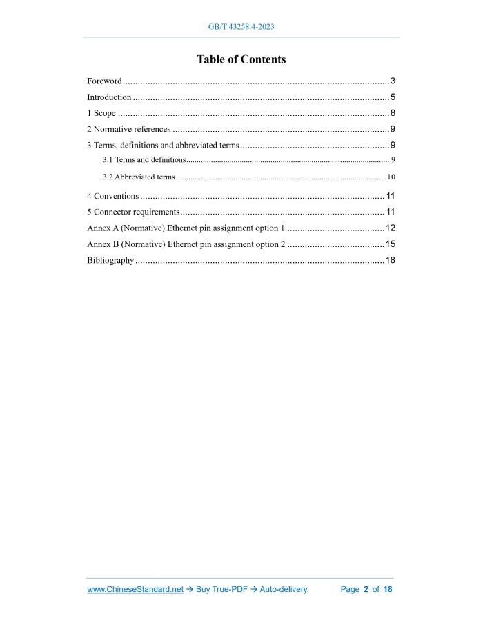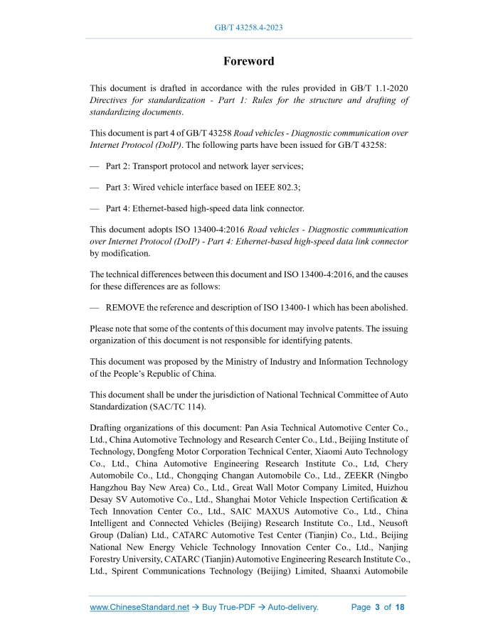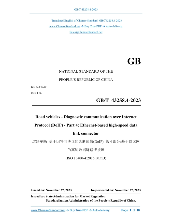 Similar standardsGB/T 43258.4-2023: Road vehicles - Diagnostic communication over Internet Protocol (DoIP) - Part 4: Ethernet-based high-speed data link connector---This is an excerpt. Full copy of true-PDF in English version (including equations, symbols, images, flow-chart, tables, and figures etc.), auto-downloaded/delivered in 9 seconds, can be purchased online: https://www.ChineseStandard.net/PDF.aspx/GBT43258.4-2023 GB NATIONAL STANDARD OF THE PEOPLE’S REPUBLIC OF CHINA ICS 43.040.10 CCS T 36 Road vehicles - Diagnostic communication over Internet Protocol (DoIP) - Part 4: Ethernet-based high-speed data link connector (ISO 13400-4:2016, MOD) ISSUED ON: NOVEMBER 27, 2023 IMPLEMENTED ON: NOVEMBER 27, 2023 Issued by: State Administration for Market Regulation; Standardization Administration of the People’s Republic of China. Table of ContentsForeword ... 3 Introduction ... 5 1 Scope ... 8 2 Normative references ... 9 3 Terms, definitions and abbreviated terms ... 9 3.1 Terms and definitions ... 9 3.2 Abbreviated terms ... 10 4 Conventions ... 11 5 Connector requirements ... 11 Annex A (Normative) Ethernet pin assignment option 1... 12 Annex B (Normative) Ethernet pin assignment option 2 ... 15 Bibliography ... 18ForewordThis document is drafted in accordance with the rules provided in GB/T 1.1-2020 Directives for standardization - Part 1: Rules for the structure and drafting of standardizing documents. This document is part 4 of GB/T 43258 Road vehicles - Diagnostic communication over Internet Protocol (DoIP). The following parts have been issued for GB/T 43258: — Part 2: Transport protocol and network layer services; — Part 3: Wired vehicle interface based on IEEE 802.3; — Part 4: Ethernet-based high-speed data link connector. This document adopts ISO 13400-4:2016 Road vehicles - Diagnostic communication over Internet Protocol (DoIP) - Part 4: Ethernet-based high-speed data link connector by modification. The technical differences between this document and ISO 13400-4:2016, and the causes for these differences are as follows: — REMOVE the reference and description of ISO 13400-1 which has been abolished. Please note that some of the contents of this document may involve patents. The issuing organization of this document is not responsible for identifying patents. This document was proposed by the Ministry of Industry and Information Technology of the People’s Republic of China. This document shall be under the jurisdiction of National Technical Committee of Auto Standardization (SAC/TC 114). Drafting organizations of this document: Pan Asia Technical Automotive Center Co., Ltd., China Automotive Technology and Research Center Co., Ltd., Beijing Institute of Technology, Dongfeng Motor Corporation Technical Center, Xiaomi Auto Technology Co., Ltd., China Automotive Engineering Research Institute Co., Ltd, Chery Automobile Co., Ltd., Chongqing Changan Automobile Co., Ltd., ZEEKR (Ningbo Hangzhou Bay New Area) Co., Ltd., Great Wall Motor Company Limited, Huizhou Desay SV Automotive Co., Ltd., Shanghai Motor Vehicle Inspection Certification & Tech Innovation Center Co., Ltd., SAIC MAXUS Automotive Co., Ltd., China Intelligent and Connected Vehicles (Beijing) Research Institute Co., Ltd., Neusoft Group (Dalian) Ltd., CATARC Automotive Test Center (Tianjin) Co., Ltd., Beijing National New Energy Vehicle Technology Innovation Center Co., Ltd., Nanjing Forestry University, CATARC (Tianjin) Automotive Engineering Research Institute Co., Ltd., Spirent Communications Technology (Beijing) Limited, Shaanxi Automobile Road vehicles - Diagnostic communication over Internet Protocol (DoIP) - Part 4: Ethernet-based high-speed data link connector1 ScopeThis document specifies a minimum set of diagnostic Ethernet connector requirements which are based on ISO 15031-3. The diagnostic connection specified in this document consists of two mating connectors: the vehicle connector and the external test equipment connector as specified in ISO 15031-3. This document specifies: — the functional requirements for the vehicle connector. These functional requirements are separated into two principal areas: connector contact allocation and electrical requirements for connector and related electrical circuits; — the functional requirements for the external test equipment connector. These functional requirements are separated into two principal areas: connector contact allocation and electrical requirements for connector and related electrical circuits. Two different connector layouts and pin-outs are specified in this document: — Ethernet pin assignment option 1; — Ethernet pin assignment option 2. Historically, option 1 is specified to meet Ethernet pin assignment of road vehicles already launched onto the market and may be used to resolve conflicts with vehicle manufacturer-specific usage of discretionary pins, e.g. pins 1 and 9. Option 2 is specified to meet the Ethernet pin assignment of road vehicles to resolve conflicts with vehicle manufacturer-specific usage of discretionary pins, e.g. pins 3 and 11. A discovery/identification and activation method of the vehicle’s Ethernet via the “Ethernet Activation Line” is specified in ISO 13400-3. This document applies to the design and use based on 100BASE-TX diagnostic Ethernet connector.2 Normative referencesThe following documents, in whole or in part, are normatively referenced in this document and are indispensable for its application. For dated references, only the edition cited applies. For undated references, the latest edition of the referenced document (including any amendments) applies. ISO 13400-2, Road vehicles - Diagnostic communication over Internet Protocol - Part 2: Transport protocol and network layer services Note: GB/T 43258.2-2023, Road vehicles - Diagnostic communication over Internet Protocol - Part 2: Transport protocol and network layer services (ISO 13400-2:2019, MOD) ISO 13400-3, Road vehicles - Diagnostic communicat