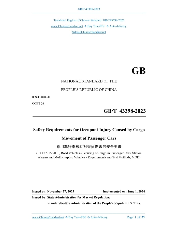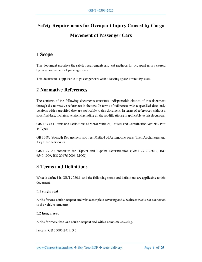 Similar standardsGB/T 43398-2023: Safety requirements for occupant injury caused by cargo movement of passenger cars---This is an excerpt. Full copy of true-PDF in English version (including equations, symbols, images, flow-chart, tables, and figures etc.), auto-downloaded/delivered in 9 seconds, can be purchased online: https://www.ChineseStandard.net/PDF.aspx/GBT43398-2023 GB NATIONAL STANDARD OF THE PEOPLE’S REPUBLIC OF CHINA ICS 43.040.60 CCS T 26 Safety Requirements for Occupant Injury Caused by Cargo Movement of Passenger Cars (ISO 27955:2010, Road Vehicles - Securing of Cargo in Passenger Cars, Station Wagons and Multi-purpose Vehicles - Requirements and Test Methods, MOD) ISSUED ON: NOVEMBER 27, 2023 IMPLEMENTED ON: JUNE 1, 2024 Issued by: State Administration for Market Regulation; Standardization Administration of the People’s Republic of China. Table of ContentsForeword ... 3 1 Scope ... 6 2 Normative References ... 6 3 Terms and Definitions ... 6 4 Technical Requirements ... 9 5 Test Methods ... 13 Safety Requirements for Occupant Injury Caused by Cargo Movement of Passenger Cars1 ScopeThis document specifies the safety requirements and test methods for occupant injury caused by cargo movement of passenger cars. This document is applicable to passenger cars with a loading space limited by seats.2 Normative ReferencesThe contents of the following documents constitute indispensable clauses of this document through the normative references in the text. In terms of references with a specified date, only versions with a specified date are applicable to this document. In terms of references without a specified date, the latest version (including all the modifications) is applicable to this document. GB/T 3730.1 Terms and Definitions of Motor Vehicles, Trailers and Combination Vehicle - Part 1: Types GB 15083 Strength Requirement and Test Method of Automobile Seats, Their Anchorages and Any Head Restraints GB/T 29120 Procedure for H-point and R-point Determination (GB/T 29120-2012, ISO 6549:1999, ISO 20176:2006, MOD)3 Terms and DefinitionsWhat is defined in GB/T 3730.1, and the following terms and definitions are applicable to this document. 3.1 single seat A ride for one adult occupant and with a complete covering and a backrest that is not connected to the vehicle structure. 3.2 bench seat A ride for more than one adult occupant and with a complete covering. [source: GB 15083-2019, 3.3] NOTE: such as: horizontal rings, vertical rings, cables, hooks, eyelets, lugs, edge hooks, threaded connections and guide rails, etc. 3.10 lashing device A device connected to a lashing point to secure the load (luggage and cargo) in the vehicle. NOTE: such devices generally consist of nets, tensioning devices (such as: webbing and belts), tensioning elements (such as: wrenches and ratchets) and connectors (such as: hooks and eyelets) and are defined by the vehicle manufacturer. 3.11 partitioning system In addition to the backrest, other components or devices (such as: partitions, bulkheads, grilles and nets) used to protect occupants from injury due to movement of luggage. NOTE 1: in particular, it refers to partitioning system composed of mesh or metal mesh, located above the backrest in the upright or folded position. NOTE 2: if a partitioning system is installed on the head restraint as standard configuration of the vehicle, then, the head restraint (excluding the seat equipped with the head restraint) is considered to be part of the partitioning system. NOTE 3: it is up to the vehicle manufacturer to define whether the head restraint or other integrated vehicle components (for example, foldable backrest) assume the function of the partitioning system. [source: GB 15083-2019, 3.15, modified] 3.12 longitudinal plane A plane parallel to the longitudinal center plane of the vehicle. [source: GB 15083-2019, 3.11] 3.13 transverse plane A vertical plane orthogonal to the longitudinal center plane of the vehicle. [source: GB 15083-2019, 3.10] 3.14 test block A standard module to simulate cargo. 3.15 luggage compartment The area in a vehicle behind the second row of seats or the non-foldable / non-removable last row of seats (the row farther back) that is used for transporting cargo. 3.16 loading space The area in a vehicle that consists of the luggage compartment and an area that can be adapted to transport passengers and / or cargo, as defined by the vehicle manufacturer. 3.17 cargo A load that can be transported within the loading space. NOTE: such as: luggage and items. 3.18 backrest A part of a seat designed to support the occupant’s back, shoulders and head.4 Technical Requirements4.1 General Requirements 4.1.1 The backrest of passenger cars whose loading space is limited by backrests shall be tested in accordance with 5.3 and satisfy the requirements of 4.2. 4.1.2 If the passenger cars (except multi-purpose passenger cars) with a loading space limited by backrests are equipped with a partitioning system, they shall be tested in accordance with 5.3 and satisfy the requirements of 4.3; multi-purpose passenger cars with a loading space limited by backrests shall at least be equipped with a partitioning system, and the partitioning system shall be tested in accordance with 5.3 and satisfy the requirements of 4.3. If the multi- purpose passenger cars cannot arrange test blocks in accordance with 5.2.3, then, it is unnecessary to satisfy the above-mentioned requirements. 4.1.3 If the passenger cars (except multi-purpose passenger cars) with a loading space limited by backrests are equipped with a lashing point, they shall be tested in accordance with 5.4 and satisfy the requirements of 4.4; multi-purpose passenger cars with a loading space limited by backrests shall at least be equipped with a lashing point, and the lashing point shall be tested in accordance with 5.4 and satisfy the requirements of 4.4. 4.2 Backrests 4.2.1 The backrests shall satisfy the requirements of 4.2.2 and 4.2.3. Seat sy