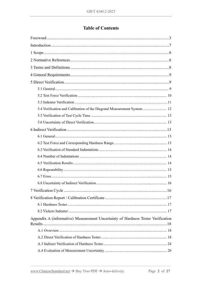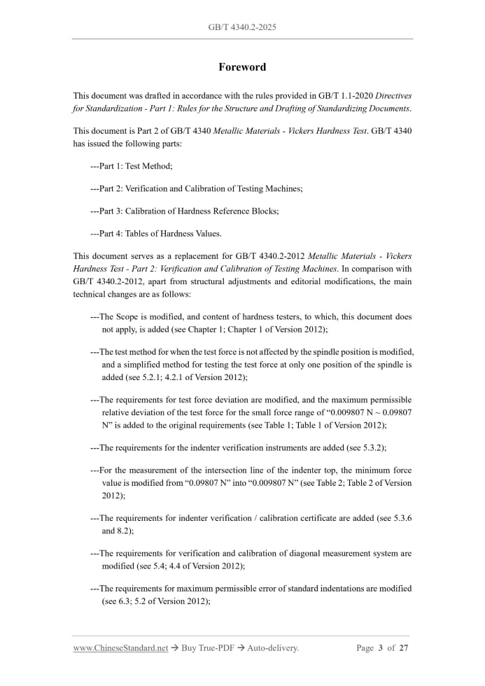 Similar standardsGB/T 4340.2-2025: Metallic materials - Vickers hardness test - Part 2: Verification and calibration of testing machines---This is an excerpt. Full copy of true-PDF in English version (including equations, symbols, images, flow-chart, tables, and figures etc.), auto-downloaded/delivered in 9 seconds, can be purchased online: https://www.ChineseStandard.net/PDF.aspx/GBT4340.2-2025 GB NATIONAL STANDARD OF THE PEOPLE’S REPUBLIC OF CHINA ICS 19.060; 77.040.10 CCS N 71 Replacing GB/T 4340.2-2012 Metallic Materials - Vickers Hardness Test - Part 2. Verification and Calibration of Testing Machines (ISO 6507-2.2018, MOD) Issued on: MARCH 28, 2025 Implemented on: OCTOBER 1, 2025 Issued by. State Administration for Market Regulation; Standardization Administration of the People’s Republic of China. Table of ContentsForeword... 3 Introduction... 7 1 Scope... 8 2 Normative References... 8 3 Terms and Definitions... 8 4 General Requirements... 9 5 Direct Verification... 9 5.1 General... 9 5.2 Test Force Verification... 10 5.3 Indenter Verification... 11 5.4 Verification and Calibration of the Diagonal Measurement System... 12 5.5 Verification of Test Cycle Time... 13 5.6 Uncertainty of Direct Verification... 13 6 Indirect Verification... 13 6.1 General... 13 6.2 Test Force and Corresponding Hardness Range... 13 6.3 Verification of Standard Indentations... 14 6.4 Number of Indentations... 14 6.5 Verification Results... 14 6.6 Repeatability... 15 6.7 Error... 15 6.8 Uncertainty of Indirect Verification... 16 7 Verification Cycle... 16 8 Verification Report / Calibration Certificate... 17 8.1 Hardness Tester... 17 8.2 Vickers Indenter... 17 Appendix A (informative) Measurement Uncertainty of Hardness Tester Verification Results... 18 A.1 Overview... 18 A.2 Direct Verification of Hardness Tester... 18 A.3 Indirect Verification of Hardness Tester... 24 A.4 Evaluation of Measurement Uncertainty... 26ForewordThis document was drafted in accordance with the rules provided in GB/T 1.1-2020 Directives for Standardization - Part 1.Rules for the Structure and Drafting of Standardizing Documents. This document is Part 2 of GB/T 4340 Metallic Materials - Vickers Hardness Test. GB/T 4340 has issued the following parts. ---Part 1.Test Method; ---Part 2.Verification and Calibration of Testing Machines; ---Part 3.Calibration of Hardness Reference Blocks; ---Part 4.Tables of Hardness Values. This document serves as a replacement for GB/T 4340.2-2012 Metallic Materials - Vickers Hardness Test - Part 2.Verification and Calibration of Testing Machines. In comparison with GB/T 4340.2-2012, apart from structural adjustments and editorial modifications, the main technical changes are as follows. ---The Scope is modified, and content of hardness testers, to which, this document does not apply, is added (see Chapter 1; Chapter 1 of Version 2012); ---The test method for when the test force is not affected by the spindle position is modified, and a simplified method for testing the test force at only one position of the spindle is added (see 5.2.1; 4.2.1 of Version 2012); ---The requirements for test force deviation are modified, and the maximum permissible relative deviation of the test force for the small force range of “0.009807 N ~ 0.09807 N” is added to the original requirements (see Table 1; Table 1 of Version 2012); ---The requirements for the indenter verification instruments are added (see 5.3.2); ---For the measurement of the intersection line of the indenter top, the minimum force value is modified from “0.09807 N” into “0.009807 N” (see Table 2; Table 2 of Version 2012); ---The requirements for indenter verification / calibration certificate are added (see 5.3.6 and 8.2); ---The requirements for verification and calibration of diagonal measurement system are modified (see 5.4; 4.4 of Version 2012); ---The requirements for maximum permissible error of standard indentations are modified (see 6.3; 5.2 of Version 2012); Metallic Materials - Vickers Hardness Test - Part 2. Verification and Calibration of Testing Machines1 ScopeThis document specifies the verification and calibration methods for Vickers hardness tester and diagonal measurement system used to determine Vickers hardness in accordance with GB/T 4340.1. The direct verification method specified in this document applies to the verification and calibration of the hardness tester, indenter and diagonal measurement system. The indirect verification method applies to the verification of the entire Vickers hardness tester using a standard block. If the Vickers hardness tester is also used for hardness testing by other methods, then, the Vickers hardness tester shall be respectively verified in accordance with the corresponding methods. This document also applies to the verification and calibration of portable Vickers hardness testers. This document does not apply to hardness testers that measure hardness using other different principles (for example, ultrasonic impedance method).2 Normative ReferencesThe contents of the following documents constitute indispensable clauses of this document through the normative references in the text. In terms of references with a specified date, only versions with a specified date are applicable to this document. In terms of references without a specified date, the latest version (including all the modifications) is applicable to this document. GB/T 4340.1 Metallic Materials - Vickers Hardness Test - Part 1.Test Method (GB/T 4340.1- 2024, ISO 6507-1.2023, MOD) GB/T 4340.3 Metallic Materials - Vickers Hardness Test - Part 3.Calibration of Reference Blocks (GB/T 4340.3-2025, ISO 6507-3.2018, MOD) GB/T 13634 Metallic Materials - Calibration of Force-proving Instruments Used for the Verification of Uniaxial Testing Machines (GB/T 13634-2019, ISO 376.2011, IDT)3 Terms and DefinitionsThis document does not have terms or definitions that need to be defined.4 General RequirementsBefore verification, the Vicker