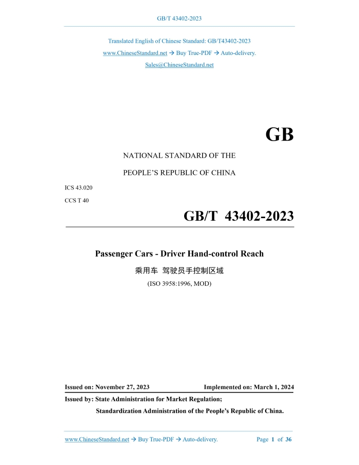 GB/T 43402-2023: Passenger cars - Driver hand-control reach Delivery: 9 seconds. True-PDF full-copy in English & invoice will be downloaded + auto-delivered via email. See step-by-step procedure Status: Valid