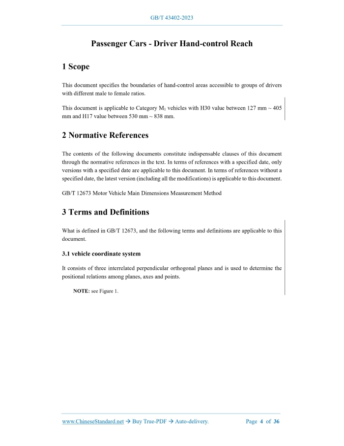 Similar standardsGB/T 43402-2023: Passenger cars - Driver hand-control reach---This is an excerpt. Full copy of true-PDF in English version (including equations, symbols, images, flow-chart, tables, and figures etc.), auto-downloaded/delivered in 9 seconds, can be purchased online: https://www.ChineseStandard.net/PDF.aspx/GBT43402-2023GB NATIONAL STANDARD OF THE PEOPLE’S REPUBLIC OF CHINA ICS 43.020 CCS T 40 Passenger Cars - Driver Hand-control Reach (ISO 3958:1996, MOD) ISSUED ON: NOVEMBER 27, 2023 IMPLEMENTED ON: MARCH 1, 2024 Issued by: State Administration for Market Regulation; Standardization Administration of the People’s Republic of China. Table of ContentsForeword ... 3 1 Scope ... 4 2 Normative References ... 4 3 Terms and Definitions ... 4 4 General Requirements ... 8 Appendix A (informative) A Comparison of Structural No. between This Document and ISO 3958:1996 ... 10 Appendix B (informative) Technical Differences between This Document and ISO 3958:1996 and the Causes for These Differences ... 11 Appendix C (informative) Verification Process ... 13 Appendix D (normative) Hand-reach Table ... 15 Passenger Cars - Driver Hand-control Reach1 ScopeThis document specifies the boundaries of hand-control areas accessible to groups of drivers with different male to female ratios. This document is applicable to Category M1 vehicles with H30 value between 127 mm ~ 405 mm and H17 value between 530 mm ~ 838 mm.2 Normative ReferencesThe contents of the following documents constitute indispensable clauses of this document through the normative references in the text. In terms of references with a specified date, only versions with a specified date are applicable to this document. In terms of references without a specified date, the latest version (including all the modifications) is applicable to this document. GB/T 12673 Motor Vehicle Main Dimensions Measurement Method3 Terms and DefinitionsWhat is defined in GB/T 12673, and the following terms and definitions are applicable to this document. 3.1 vehicle coordinate system It consists of three interrelated perpendicular orthogonal planes and is used to determine the positional relations among planes, axes and points. NOTE: see Figure 1. The design H point position set by the manufacturer, specifically designated as R point or SgRP, and satisfy all the following requirements: a) The basic datum point used to establish occupant adjustment tools and dimensions; b) Simulate the hinge center position of the human trunk and thigh; c) With coordinates established relative to the structure of the vehicle being designed; d) The H point at the rearmost position of each designated seating position or the normal driving and seating position specified by the manufacturer is established. It takes into account all adjustment states of the seat, including horizontal, vertical and tilting, but seat movement for non-normal driving and riding purposes is not included. [source: GB/T 12673-2019, 3.2.3] 3.6 accelerator heel point; AHP When the ankle angle is 87, and the shoe is placed on the uncompressed accelerator pedal plane, the intersection of the heel of the shoe and the compressed floor covering. NOTE: if the intersection of the shoe and the lateral support does not cause the AHP and BOFRP to shift, then, the lateral position (the Y coordinate) is the same as the BOFRP. [source: GB/T 12673-2019, 3.3.10] 3.7 center plane of occupant C/PO The Y coordinate plane of each designated riding position R-point. NOTE: for single seats, it generally refers to the center plane of the seats. For bench seats, the center plane of occupant is specified by the manufacturer. [source: GB/T 12673-2019, 3.3.16, modified] 3.8 general package factor A single index value that characterizes the spatial position of the driver of a specific vehicle (see Formula 1). NOTE: G is a comprehensive variable that provides a quantitative indicator of the geometric structure of the driver’s workspace. It is calculated by substituting the main dimensions (see Figure 2) of the vehicle seat configuration into Formula (1), and the unit is (mm).Appendix C(informative) Verification Process C.1 Determination of Reference Origin Position the reference origin at R-point of the vehicle seat. C.2 Determination of Datum Plane In accordance with a set of orthogonal datum planes, position the hand-reach envelope inside the vehicle. The orthogonal datum planes are the X datum plane passing through R-point, the plane parallel to the Y datum plane and passing through R-point, and the Z datum plane passing through the R-point. C.3 Selection of Hand-reach Table to be Used Explicitly describe the dimensions of the geometric structure of the vehicle seat configuration and calculate the value of the general package factor G defined in 3.8. In accordance with the value of the general package factor G, the type of torso restraint and the male-female mix ratio, select the hand-reach table from Appendix D that is suitable for the vehicle and the designated driver group. C.4 Determination of Whether the Control is within Reach Method 1: in accordance with the following steps, respectively draw the hand-reach envelope on the left side of C/PO and the right side of C/PO. a) Based on the reference origin, position the horizontal angle as 30, the vertical angle as 0 and the radius as the coordinate point of corresponding values in the hand-reach table. Along the vertical direction, successively position the coordinate points upward and downward when the vertical angle is 15, 15, 30, 45 and 60; b) In accordance with the above steps, successively position the coordinate points when the horizontal angle is 45, 60, 75 and 90, and the vertical angle is 15, 0, 15, 30, 45 and 60; c) Fit the coordinate points at the same horizontal angle to a straight line, fit the uppermost point in the Z direction to a straight line, and fit the bottommost point in the Z direction to a straight line; d) Fit all straight lines into a curve