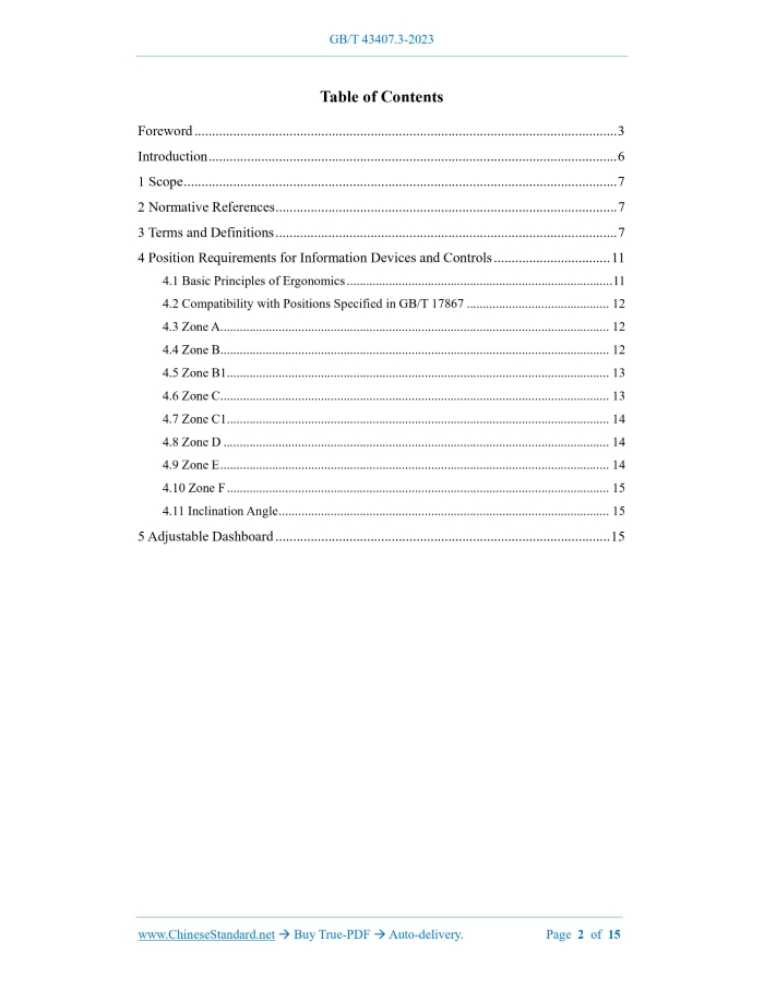 Similar standardsGB/T 43407.3-2023: Road vehicles -- Ergonomic requirements for the driver' s compartment in low-floor line-service buses -- Part 3: Information devices and controls---This is an excerpt. Full copy of true-PDF in English version (including equations, symbols, images, flow-chart, tables, and figures etc.), auto-downloaded/delivered in 9 seconds, can be purchased online: https://www.ChineseStandard.net/PDF.aspx/GBT43407.3-2023 GB NATIONAL STANDARD OF THE PEOPLE’S REPUBLIC OF CHINA ICS 43.080.20 CCS T 42 Road Vehicles - Ergonomic Requirements for the Driver’s Compartment in Low-floor Line-service Buses - Part 3: Information Devices and Controls (ISO 16121-3:2011, Road Vehicles - Ergonomic Requirements for the Driver’s Workplace in Line-service Buses - Part 3: Information Devices and Controls, MOD) ISSUED ON: NOVEMBER 27, 2023 IMPLEMENTED ON: MARCH 1, 2024 Issued by: State Administration for Market Regulation; Standardization Administration of the People’s Republic of China. Table of ContentsForeword ... 3 Introduction ... 6 1 Scope ... 7 2 Normative References ... 7 3 Terms and Definitions ... 7 4 Position Requirements for Information Devices and Controls ... 11 4.1 Basic Principles of Ergonomics ... 11 4.2 Compatibility with Positions Specified in GB/T 17867 ... 12 4.3 Zone A... 12 4.4 Zone B... 12 4.5 Zone B1 ... 13 4.6 Zone C... 13 4.7 Zone C1 ... 14 4.8 Zone D ... 14 4.9 Zone E ... 14 4.10 Zone F ... 15 4.11 Inclination Angle ... 15 5 Adjustable Dashboard ... 15 Road Vehicles - Ergonomic Requirements for the Driver’s Compartment in Low-floor Line-service Buses - Part 3: Information Devices and Controls1 ScopeThis document specifies the position requirements for information devices and controls in the driver’s compartment. This document is applicable to the design of the driver’s compartment of Category-M3 low- floor line-service buses with a width greater than 2.30 m. Other buses may take this as a reference.2 Normative ReferencesThe contents of the following documents constitute indispensable clauses of this document through the normative references in the text. In terms of references with a specified date, only versions with a specified date are applicable to this document. In terms of references without a specified date, the latest version (including all the modifications) is applicable to this document. GB 4094 Symbols for Controls, Indicators and Tell-tales of Motor Vehicles GB/T 17867 Location of Hand Controls, Indicators and Tell-tales in Motor Vehicles (GB/T 17867-2023, ISO 4040:2009, MOD) GB/T 43407.1 Road Vehicles - Ergonomic Requirements for the Driver’s Compartment in Low- floor Line-service Buses - Part 1: General Description and Basic Requirements (GB/T 43407.1- 2023, ISO 16121-1:2012, MOD)3 Terms and DefinitionsWhat is defined in GB/T 43407.1-2023, and the following terms and definitions are applicable to this document. 3.1 early warning Visual warning signal that does not require immediate action. 3.2 alert Visual warning signal that requires immediate action. 3.3 Zone A The dashboard area located beneath the steering wheel, whose range is bounded by a horizontal tangent to the top of the steering column at its uppermost position, two vertical lines respectively projected from the left and right outer edges of the steering wheel and the top of the dashboard (see Figure 1). 3.4 Zone B The dashboard area located to the left of the steering wheel, its right side is bounded by the vertical line tangent to the left outer edge of the steering wheel, its left side and front side are bounded by the “hand reach range” R value (see Figure 1 and Figure 2), and its rear is bounded by a transverse plane perpendicular to the upper plane of the steering wheel. The maximum distance between this transverse plane and the lower center (when the steering wheel is in the middle position recommended by the manufacturer) of the steering wheel is 60 mm. 3.5 Zone C The dashboard area located to the right of the steering wheel, which has the same shape as Zone B, but is a mirror image of each other (see Figure 1). 3.6 Zone B1 This is an auxiliary plane area, starting from the end of Zone B closest to the driver, with the same width as Zone B, and continues to extend downward (see Figure 1). NOTE: Zone B1 can be integrated with Zone B. 3.7 Zone C1 This is an auxiliary plane area that mirrors Zone B1 and is adjacent to Zone C (see Figure 1). NOTE: Zone C1 can be integrated with Zone C. 3.8 Zone D The side console area on the driver’s left side. The distance between the right side and the outer edge of the widest part of the seat cushion is not less than 60 mm (not less than 100 mm is recommended). It is limited to the front by the rear border of Zone B1 and limited to the left and rear by the cabin walls (see Figure 1). 3.9 Zone E The side console area on the driver’s right side. The distance between the left side and the outer edge of the widest part of the seat cushion is not less than 100 mm. It is limited to the front by the rear border of Zone C1, limited to the right by the left border of the passenger passage specified in relevant standards, and limited to the rear by the cabin walls (see Figure 1). B---Zone B (3.4); B1---Zone B1 (3.6); C---Zone C (3.5); C1---Zone C1 (3.7); D---Zone D (3.8); E---Zone E (3.9); F---Zone F (3.10); H---seat point-H; R---hand reach range, = 750 mm; SP---shoulder point. Figure 2 -- Definition of Zones - Side View4 Position Requirements for Information Devices andControls 4.1 Basic Principles of Ergonomics The design of information units (equipment) shall follow the following ergonomic principles: ---The driver shall have easy access to the control devices in the normal driving position, and try to avoid bending the body forward; ---The cash register and ticket vending machine shall be easy to operate; ---There shall be no obstruction of sight from the front and sides; ---The driver shall have no visibility obstruction when o