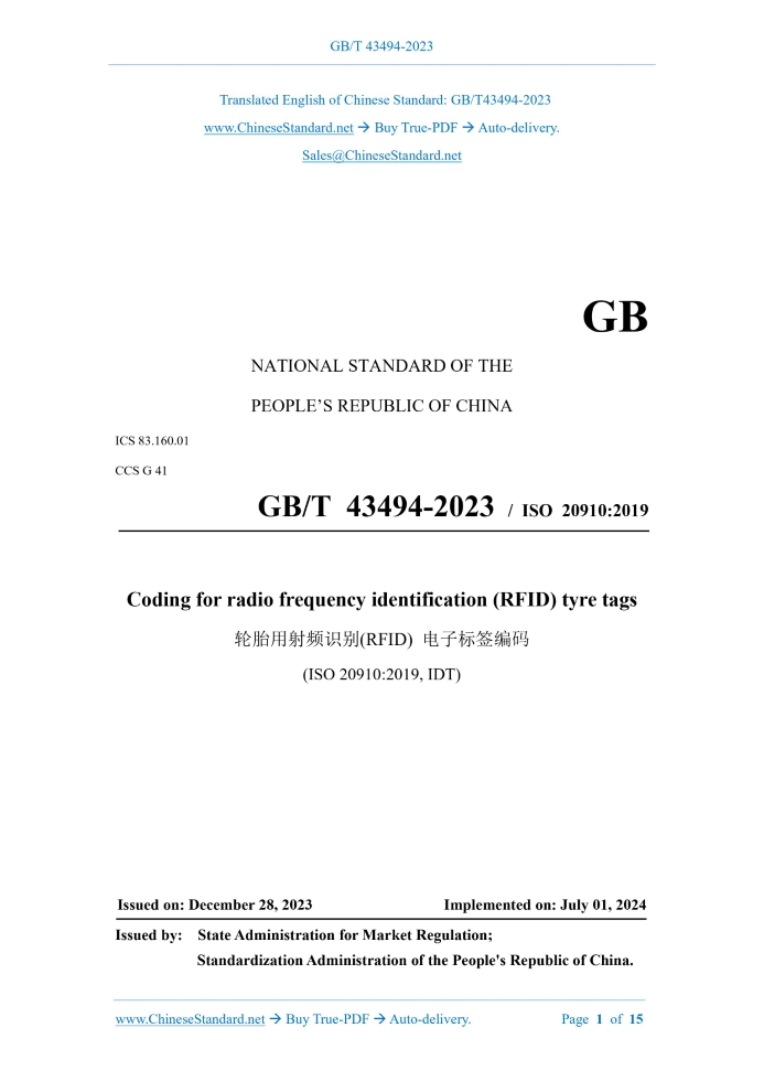 GB/T 43494-2023: Coding for radio frequency identification (RFID) tyre tags Delivery: 9 seconds. True-PDF full-copy in English & invoice will be downloaded + auto-delivered via email. See step-by-step procedure Status: Valid