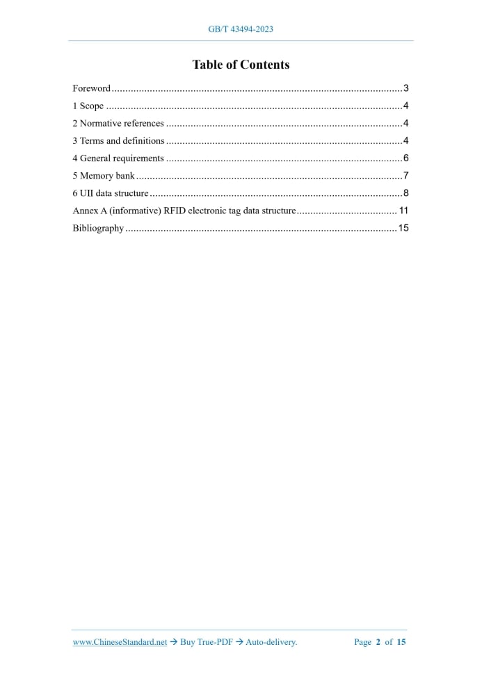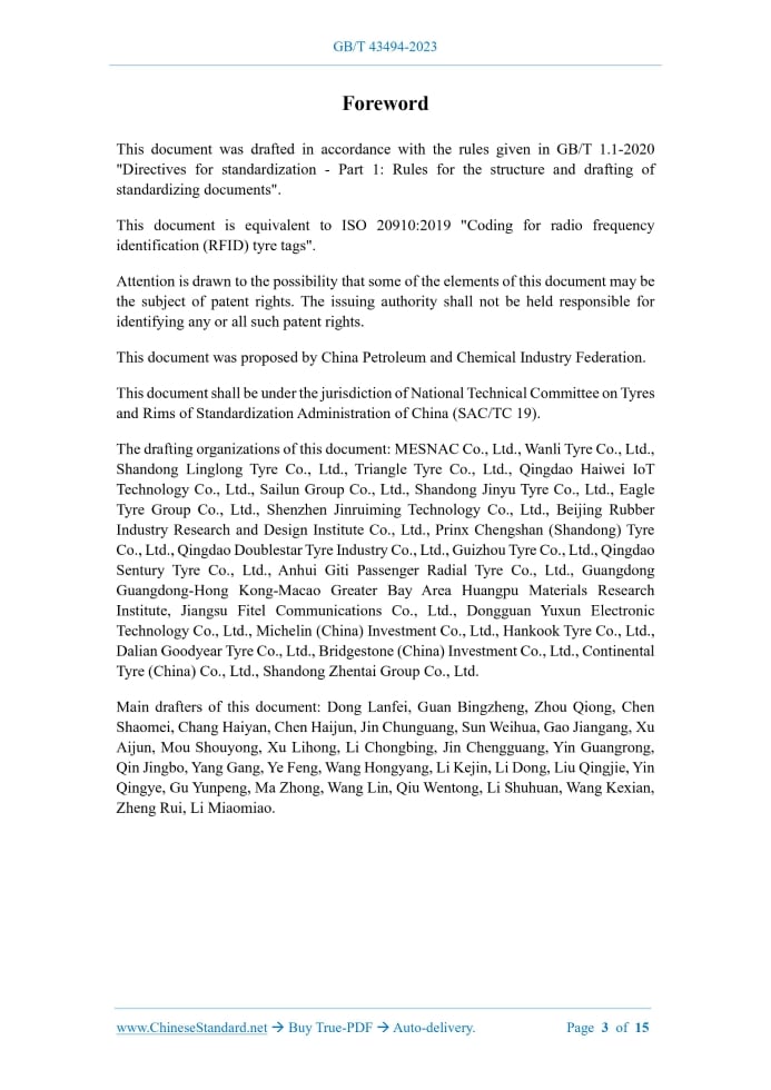 Similar standardsGB/T 43494-2023: Coding for radio frequency identification (RFID) tyre tags---This is an excerpt. Full copy of true-PDF in English version (including equations, symbols, images, flow-chart, tables, and figures etc.), auto-downloaded/delivered in 9 seconds, can be purchased online: https://www.ChineseStandard.net/PDF.aspx/GBT43494-2023GB NATIONAL STANDARD OF THE PEOPLE’S REPUBLIC OF CHINA ICS 83.160.01 CCS G 41 GB/T 43494-2023 / ISO 20910.2019 Coding for radio frequency identification (RFID) tyre tags (ISO 20910.2019, IDT) Issued on: DECEMBER 28, 2023 Implemented on: JULY 01, 2024 Issued by. State Administration for Market Regulation; Standardization Administration of the People's Republic of China. Table of ContentsForeword... 3 1 Scope... 4 2 Normative references... 4 3 Terms and definitions... 4 4 General requirements... 6 5 Memory bank... 7 6 UII data structure... 8 Annex A (informative) RFID electronic tag data structure... 11 Bibliography... 15ForewordThis document was drafted in accordance with the rules given in GB/T 1.1-2020 "Directives for standardization - Part 1.Rules for the structure and drafting of standardizing documents". This document is equivalent to ISO 20910.2019 "Coding for radio frequency identification (RFID) tyre tags". Attention is drawn to the possibility that some of the elements of this document may be the subject of patent rights. The issuing authority shall not be held responsible for identifying any or all such patent rights. This document was proposed by China Petroleum and Chemical Industry Federation. This document shall be under the jurisdiction of National Technical Committee on Tyres and Rims of Standardization Administration of China (SAC/TC 19). The drafting organizations of this document. MESNAC Co., Ltd., Wanli Tyre Co., Ltd., Shandong Linglong Tyre Co., Ltd., Triangle Tyre Co., Ltd., Qingdao Haiwei IoT Technology Co., Ltd., Sailun Group Co., Ltd., Shandong Jinyu Tyre Co., Ltd., Eagle Tyre Group Co., Ltd., Shenzhen Jinruiming Technology Co., Ltd., Beijing Rubber Industry Research and Design Institute Co., Ltd., Prinx Chengshan (Shandong) Tyre Co., Ltd., Qingdao Doublestar Tyre Industry Co., Ltd., Guizhou Tyre Co., Ltd., Qingdao Sentury Tyre Co., Ltd., Anhui Giti Passenger Radial Tyre Co., Ltd., Guangdong Guangdong-Hong Kong-Macao Greater Bay Area Huangpu Materials Research Institute, Jiangsu Fitel Communications Co., Ltd., Dongguan Yuxun Electronic Technology Co., Ltd., Michelin (China) Investment Co., Ltd., Hankook Tyre Co., Ltd., Dalian Goodyear Tyre Co., Ltd., Bridgestone (China) Investment Co., Ltd., Continental Tyre (China) Co., Ltd., Shandong Zhentai Group Co., Ltd. Main drafters of this document. Dong Lanfei, Guan Bingzheng, Zhou Qiong, Chen Shaomei, Chang Haiyan, Chen Haijun, Jin Chunguang, Sun Weihua, Gao Jiangang, Xu Aijun, Mou Shouyong, Xu Lihong, Li Chongbing, Jin Chengguang, Yin Guangrong, Qin Jingbo, Yang Gang, Ye Feng, Wang Hongyang, Li Kejin, Li Dong, Liu Qingjie, Yin Qingye, Gu Yunpeng, Ma Zhong, Wang Lin, Qiu Wentong, Li Shuhuan, Wang Kexian, Zheng Rui, Li Miaomiao. Coding for radio frequency identification (RFID) tyre tags1 ScopeThis document specifies the general requirements and data structure of coding for radio frequency identification (RFID) tyre tags (hereinafter referred to as RFID electronic tags). This document applies to RFID electronic tags for tyres of various technologies.2 Normative referencesThe following referenced documents are indispensable for the application of this document. For dated references, only the edition cited applies. For undated references, the latest edition of the referenced document (including any amendments) applies. ISO 20909, Radio frequency identification (RFID) tyre tags NOTE. GB/T 43490-2023, Radio frequency identification (RFID) tyre tags (ISO 20909.2019, IDT) ISO/IEC 18000-63, Information technology -- Radio frequency identification for item management -- Part 63.Parameters for air interface communications at 860 MHz to 960 MHz Type C ISO/IEC19762, Information technology -- Automatic identification and data capture (AIDC) techniques -- Harmonized vocabulary GS1 EPCTM Tag Data Standard3 Terms and definitionsFor the purposes of this document, the terms and definitions defined in ISO/IEC 19762 and ISO 20909 as well as the followings apply. 3.1 memory bank; MB The specified name of the segmented storage structure. NOTE. RFID electronic tags that comply with ISO/IEC 18000-63 have four independently available storage areas, numbered MB00, MB01, MB10, and MB11, see Table 1. 3.2 company prefix; CP ......Source: Above contents are excerpted from the full-copy PDF -- translated/reviewed by: www.ChineseStandard.net / Wayne Zheng et al. Tips & Frequently Asked Questions:Question 1: How long will the true-PDF of English version of GB/T 43494-2023 be delivered?Answer: The full copy PDF of English version of GB/T 43494-2023 can be downloaded in 9 seconds, and it will also be emailed to you in 9 seconds (double mechanisms to ensure the delivery reliably), with PDF-invoice.Question 2: Can I share the purchased PDF of GB/T 43494-2023_English with my colleagues?Answer: Yes. The purchased PDF of GB/T 43494-2023_English will be deemed to be sold to your employer/organization who actually paid for it, including your colleagues and your employer's intranet.Question 3: Does the price include tax/VAT?Answer: Yes. Our tax invoice, downloaded/delivered in 9 seconds, includes all tax/VAT and complies with 100+ countries' tax regulations (tax exempted in 100+ countries) -- See Avoidance of Double Taxation Agreements (DTAs): List of DTAs signed between Singapore and 100+ countriesQuestion 4: Do you accept my currency other than USD?Answer: Yes. www.ChineseStandard.us -- GB/T 43494-2023 -- Click this link and select your country/currency to pay, the exact amount in your currency will be printed on the invoice. Full PDF will also be downloaded/emailed in 9 seconds.How to buy and download a true PDF 